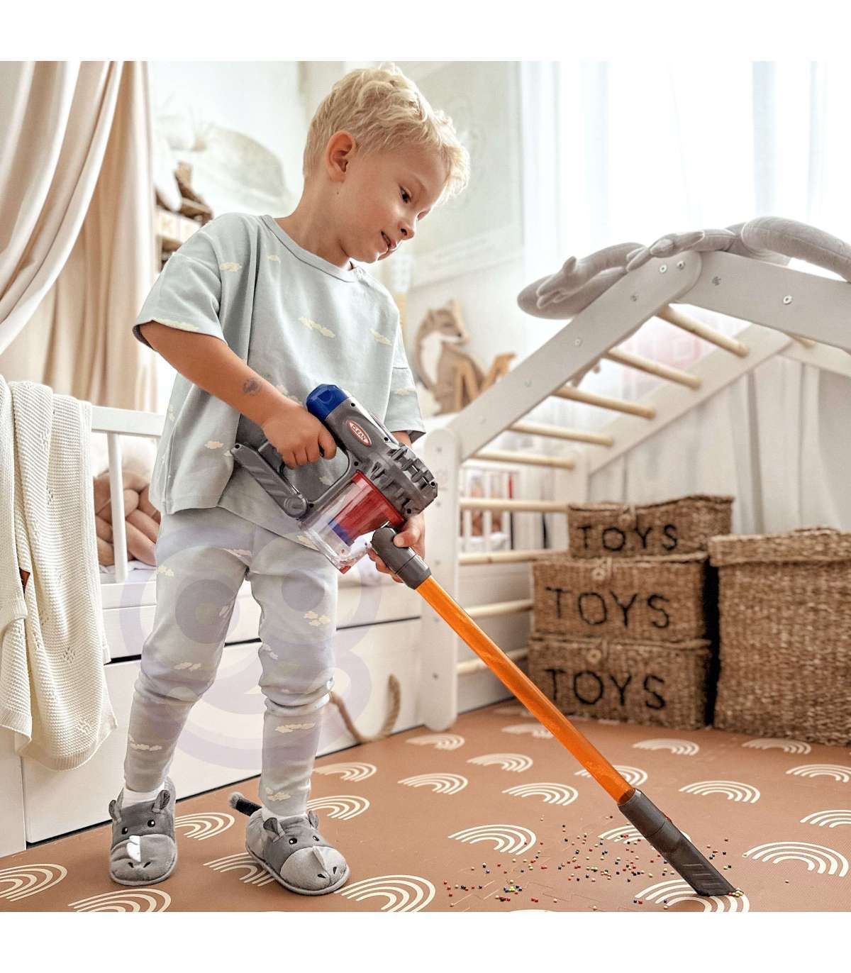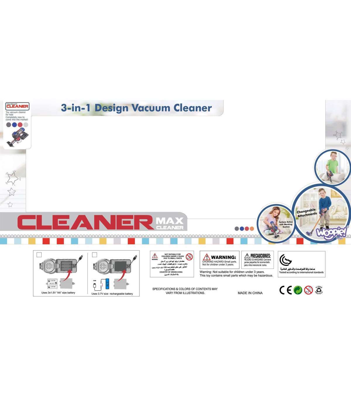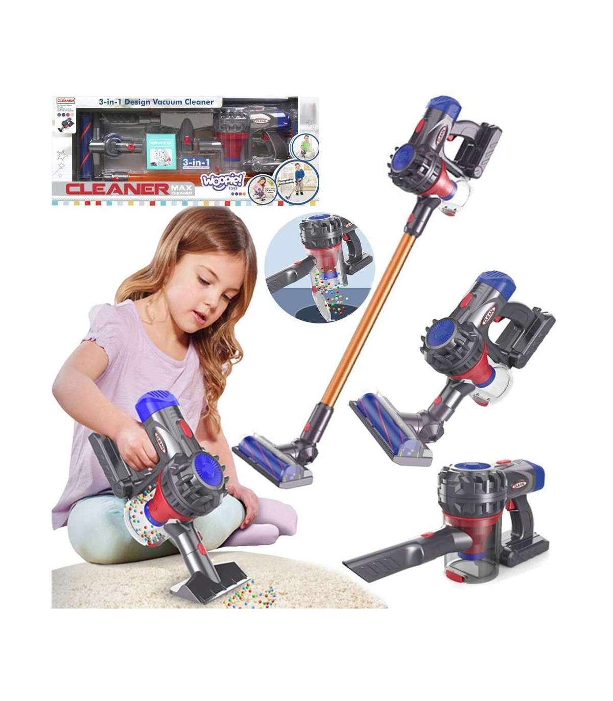 Tolmuimeja vertikaalne 3-ühes kaubamärgilt Woopie on ideaalne valik väikestele koduabilistele. Imemisfunktsioon ja heli teevad koristusmängu veelgi realistlikumaks ja atraktiivsemaks. Eemaldatav konteiner mängujäätmete jaoks on lihtne tühjendada. Mänguasi on valmistatud kõrgekvaliteedilistest lastele ohututest materjalidest. Tolmuimejal on mugav käepide, tänu millele saab laps seda ühest kohast teise kanda. Sobib suurepäraselt kingiks, et aidata last oma vanemat jäljendama, sest milline laps ei tahaks olla täiskasvanu?