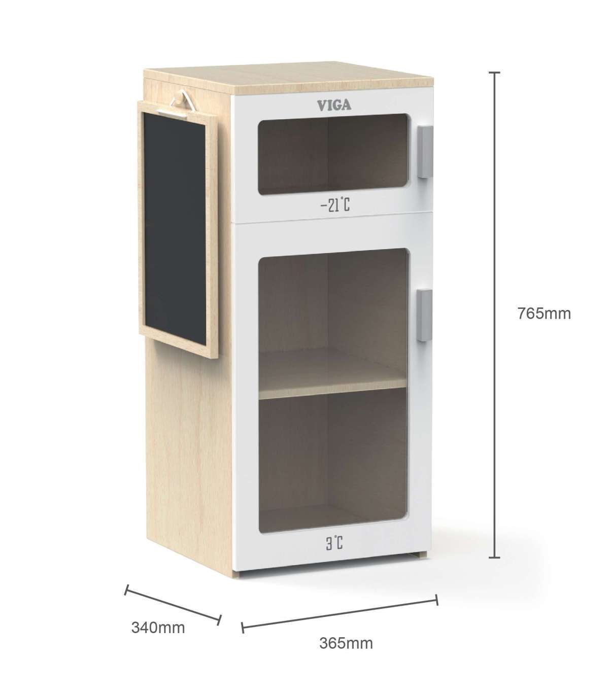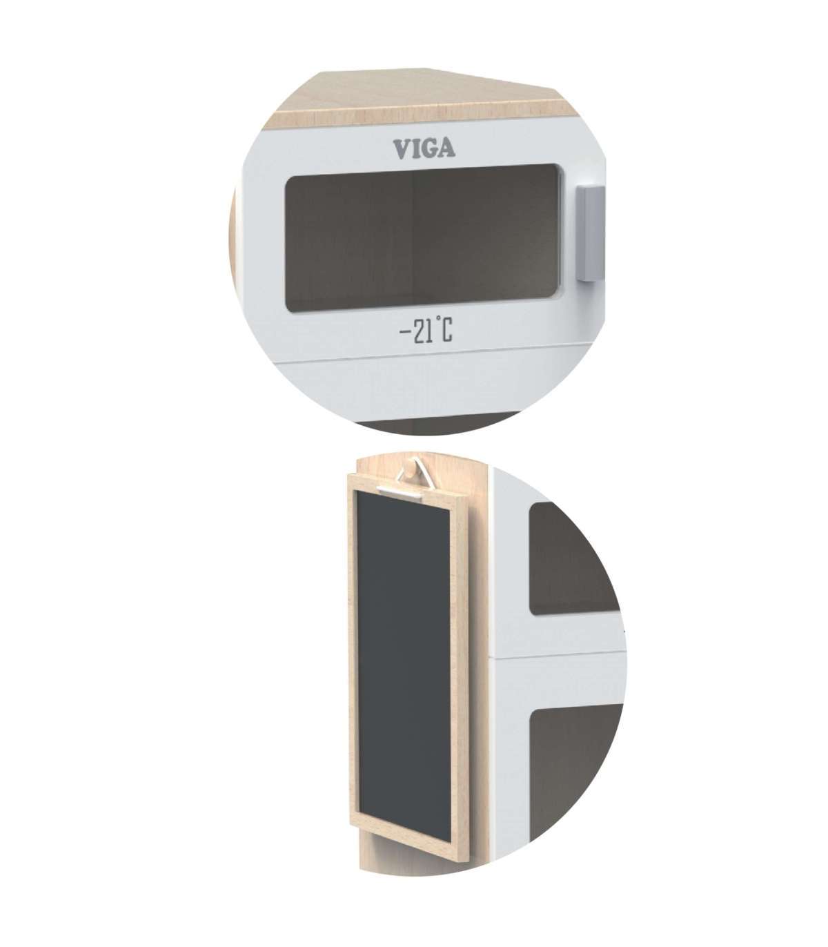 Täienda oma lapse mängunurka armsa puidust Viga külmkapi. See realistlik mänguasi on suurepärane viis kujutlusvõime ja loovuse arendamiseks kodumängude ajal. Külmkapil on kaks kambrit - sügavkülm ja külmkapp, mis võimaldab lapsel kujutada, et ta hoiab oma tooteid õigetel temperatuuridel. Lisaks on külmkapi ukse peal kriiditahvel, kuhu väike laps võib kirjutada ostunimekirja või joonistada.