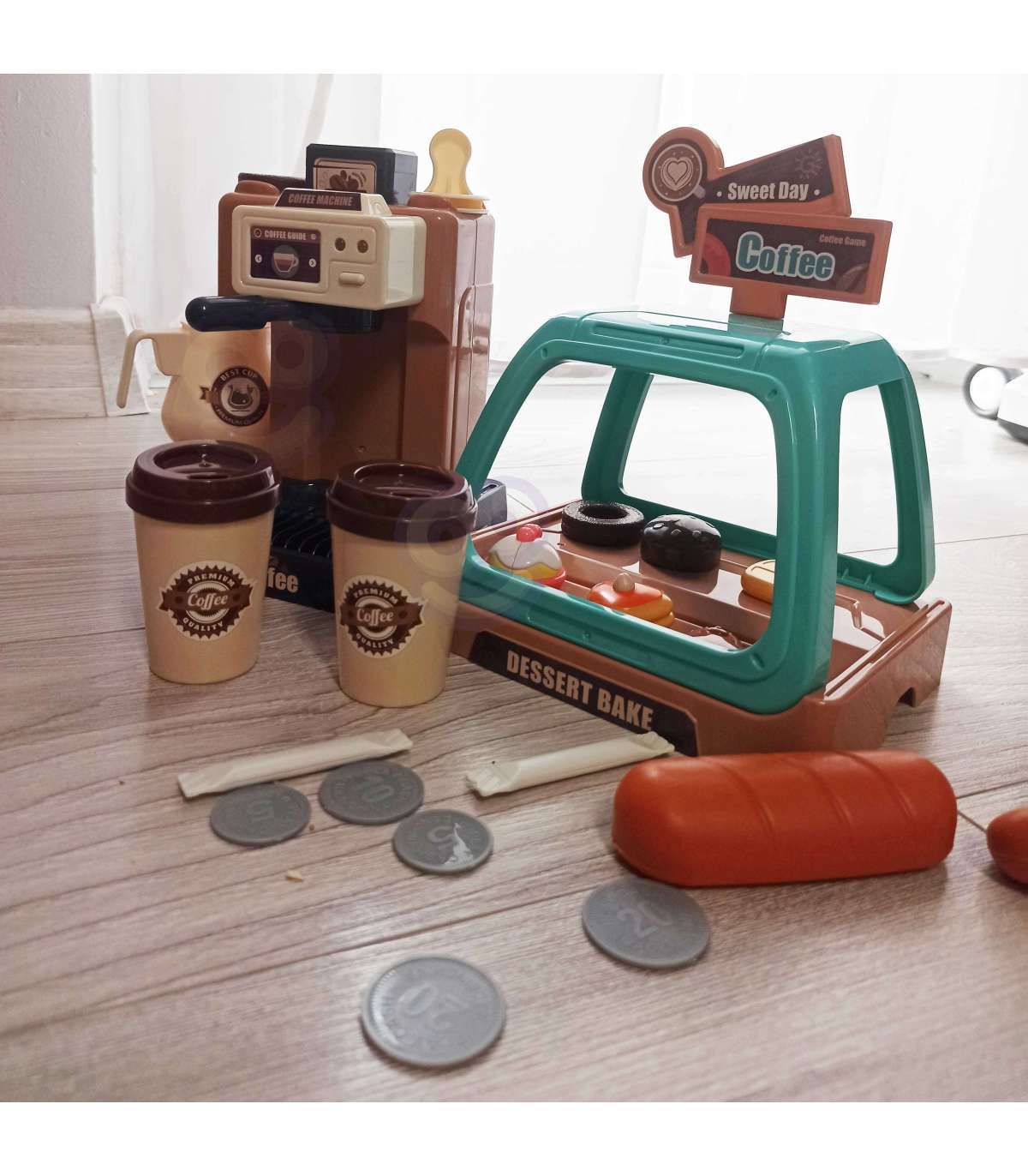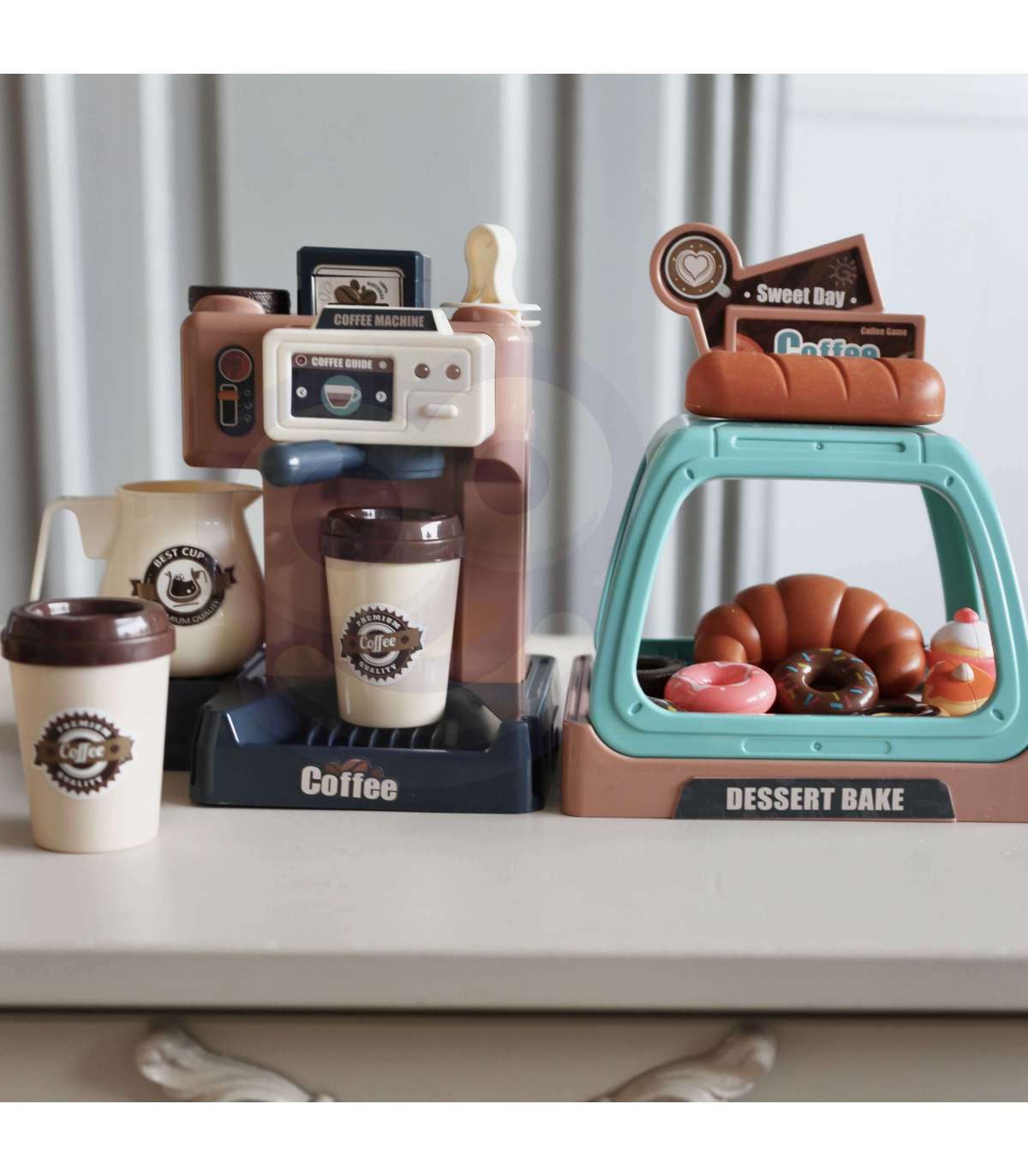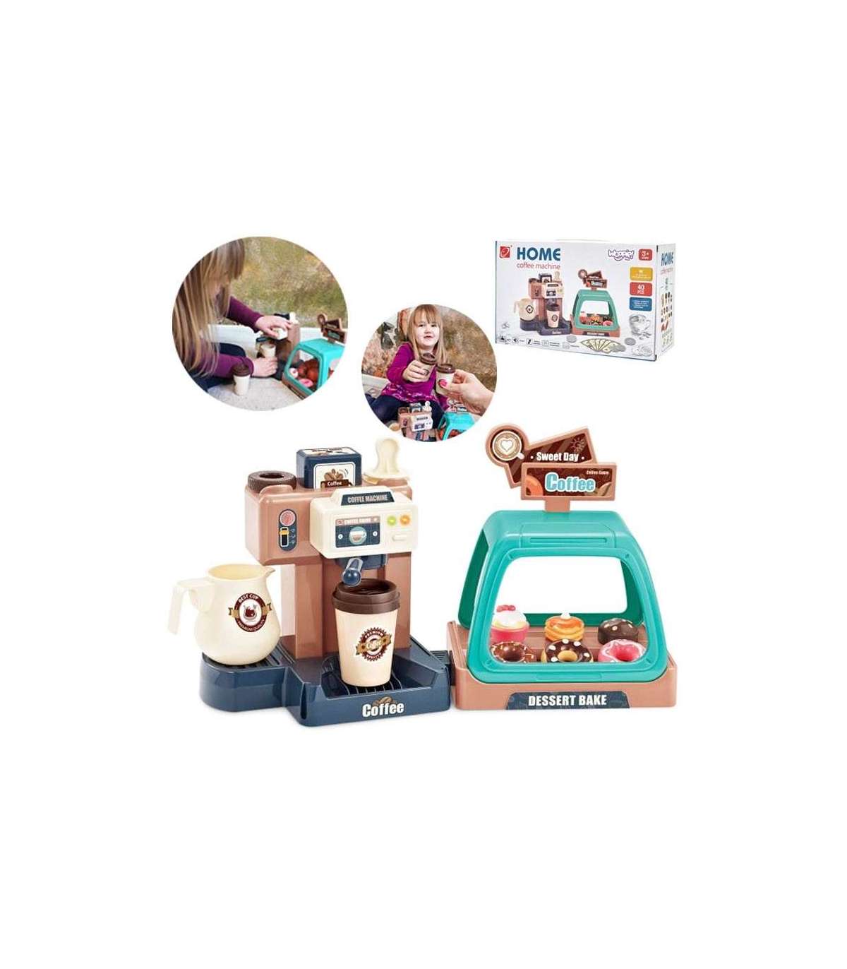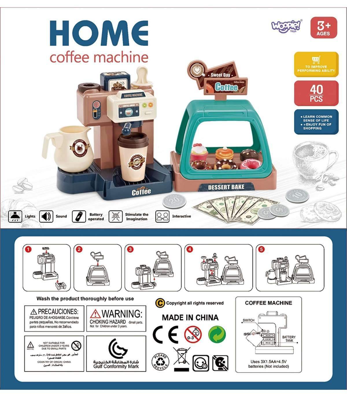 Ekspres do kawy od marki WOOPIE to idealny zestaw dla dzieci, które uwielbia wcielać się w rolę dorosłych. Zestaw oprócz ekspresu i wiaty na ciastka zawiera słodkości takie jak donuty czy babeczki w różnych smakach. Ekspres i witrynę można ze sobą dowolnie łączyć lub używać oddzielnie. Ekspres do kawy ma funkcję przepływu wody, wystarczy nalać od góry wodę do pojemnika, zamontować kolbę ekspresu, podstawić kubeczek i kawa gotowa! Ponadto wydaje dźwięki/odgłosy mielenia i parzenia kawy, świeci się wtedy mrugająca czerwona lampka, a gdy kawa będzie gotowa zaświeci się zielone światło i usłyszymy sygnał zakończenia pracy. Po zamontowaniu portu filtra usłyszymy również odgłos nalewania kawy. Zabawka z pewnością zaciekawi każde dziecko. Zabawa w sklep z przyjaciółmi pomoże rozwinąć świadomość i zdolności społeczne.