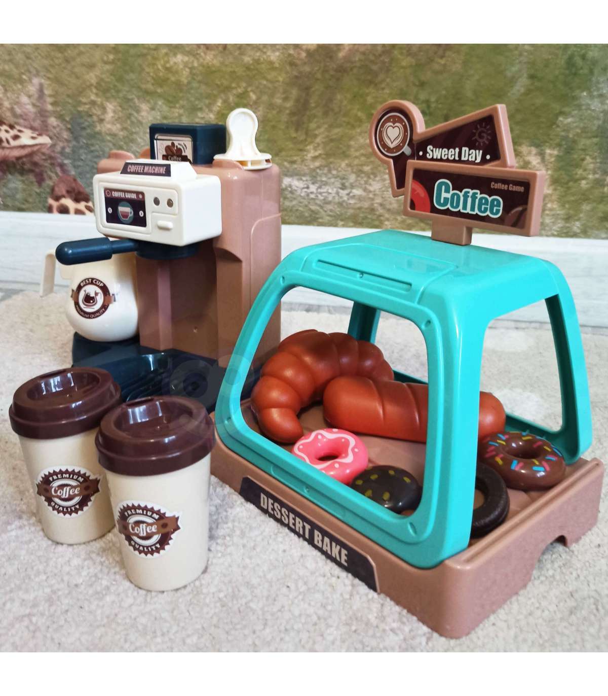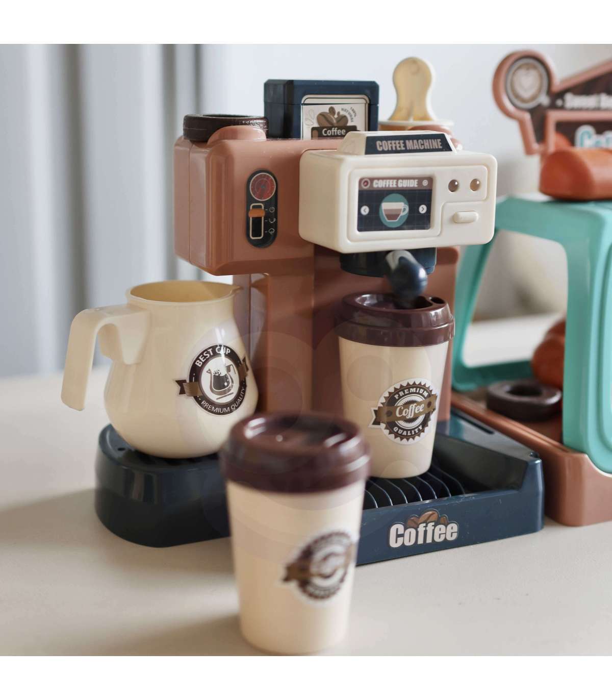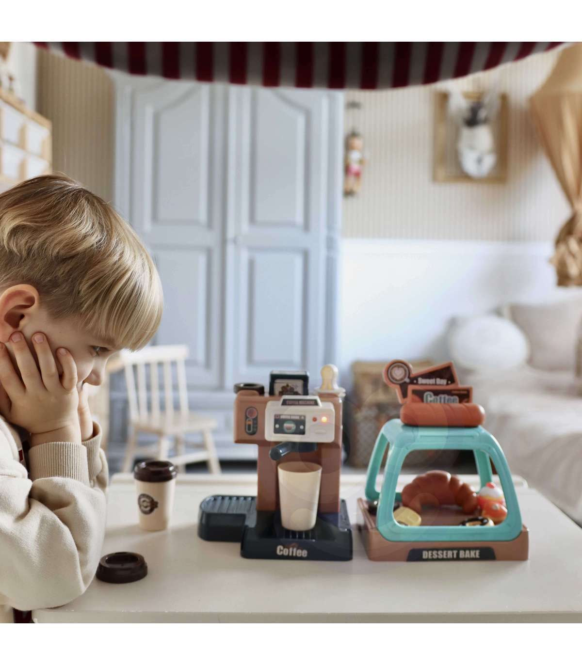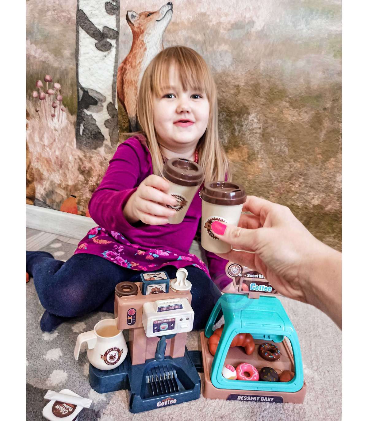Ekspres do kawy od marki WOOPIE to idealny zestaw dla dzieci, które uwielbia wcielać się w rolę dorosłych. Zestaw oprócz ekspresu i wiaty na ciastka zawiera słodkości takie jak donuty czy babeczki w różnych smakach. Ekspres i witrynę można ze sobą dowolnie łączyć lub używać oddzielnie. Ekspres do kawy ma funkcję przepływu wody, wystarczy nalać od góry wodę do pojemnika, zamontować kolbę ekspresu, podstawić kubeczek i kawa gotowa! Ponadto wydaje dźwięki/odgłosy mielenia i parzenia kawy, świeci się wtedy mrugająca czerwona lampka, a gdy kawa będzie gotowa zaświeci się zielone światło i usłyszymy sygnał zakończenia pracy. Po zamontowaniu portu filtra usłyszymy również odgłos nalewania kawy. Zabawka z pewnością zaciekawi każde dziecko. Zabawa w sklep z przyjaciółmi pomoże rozwinąć świadomość i zdolności społeczne.