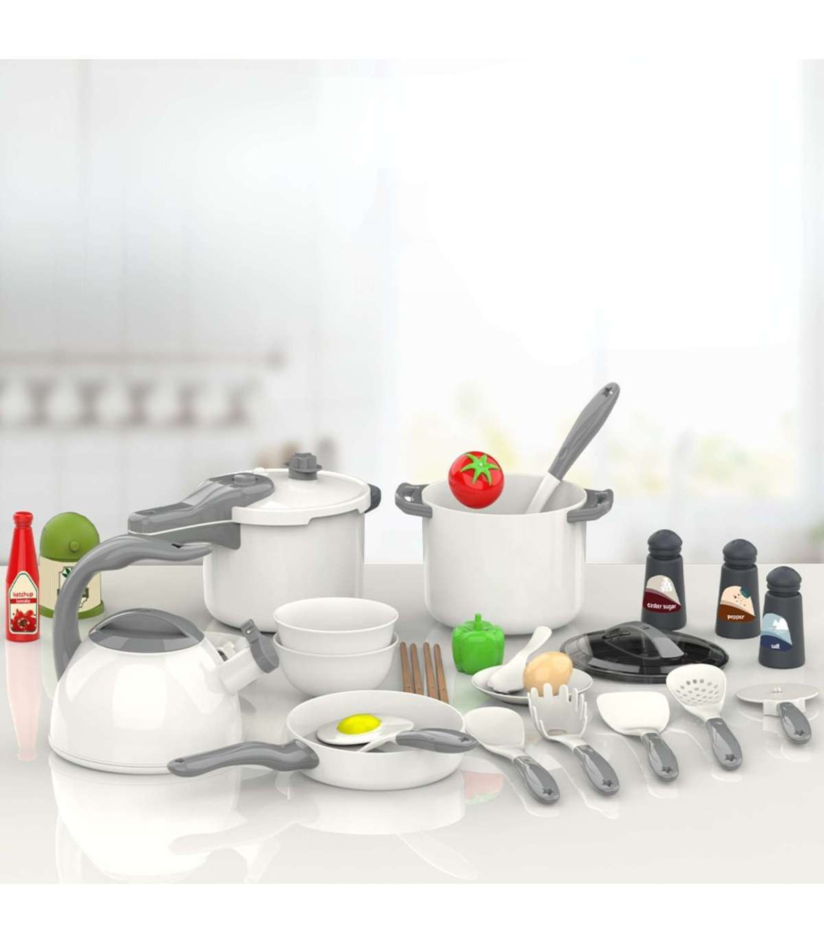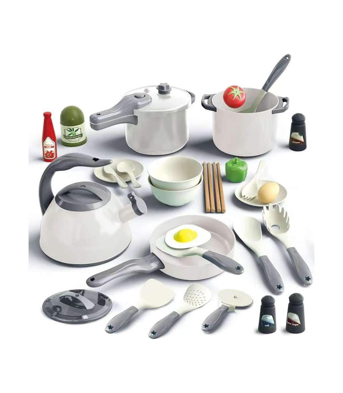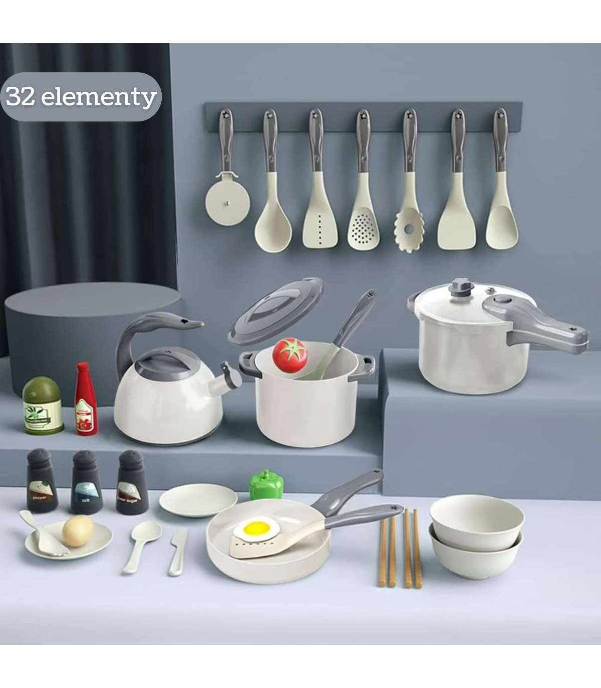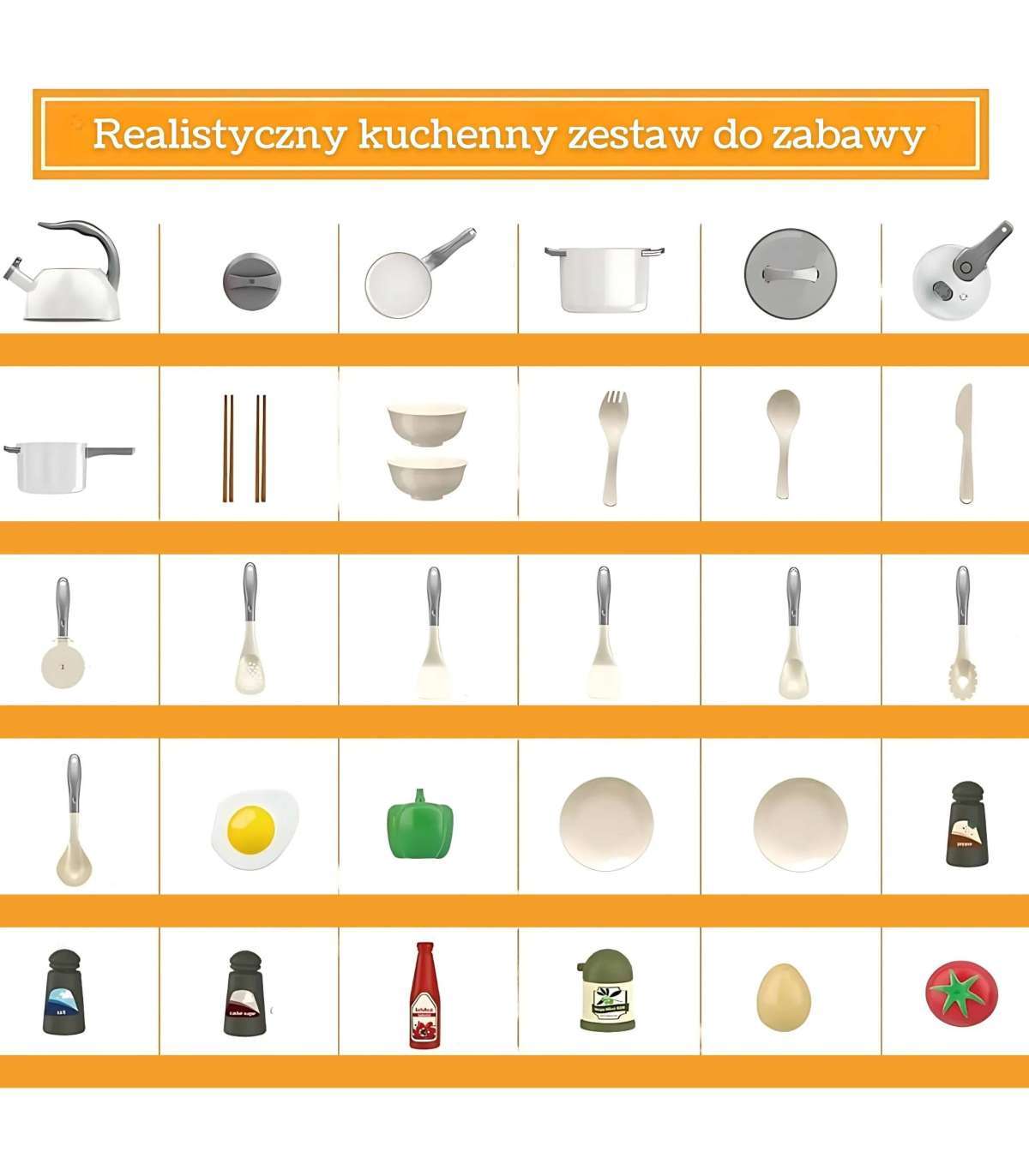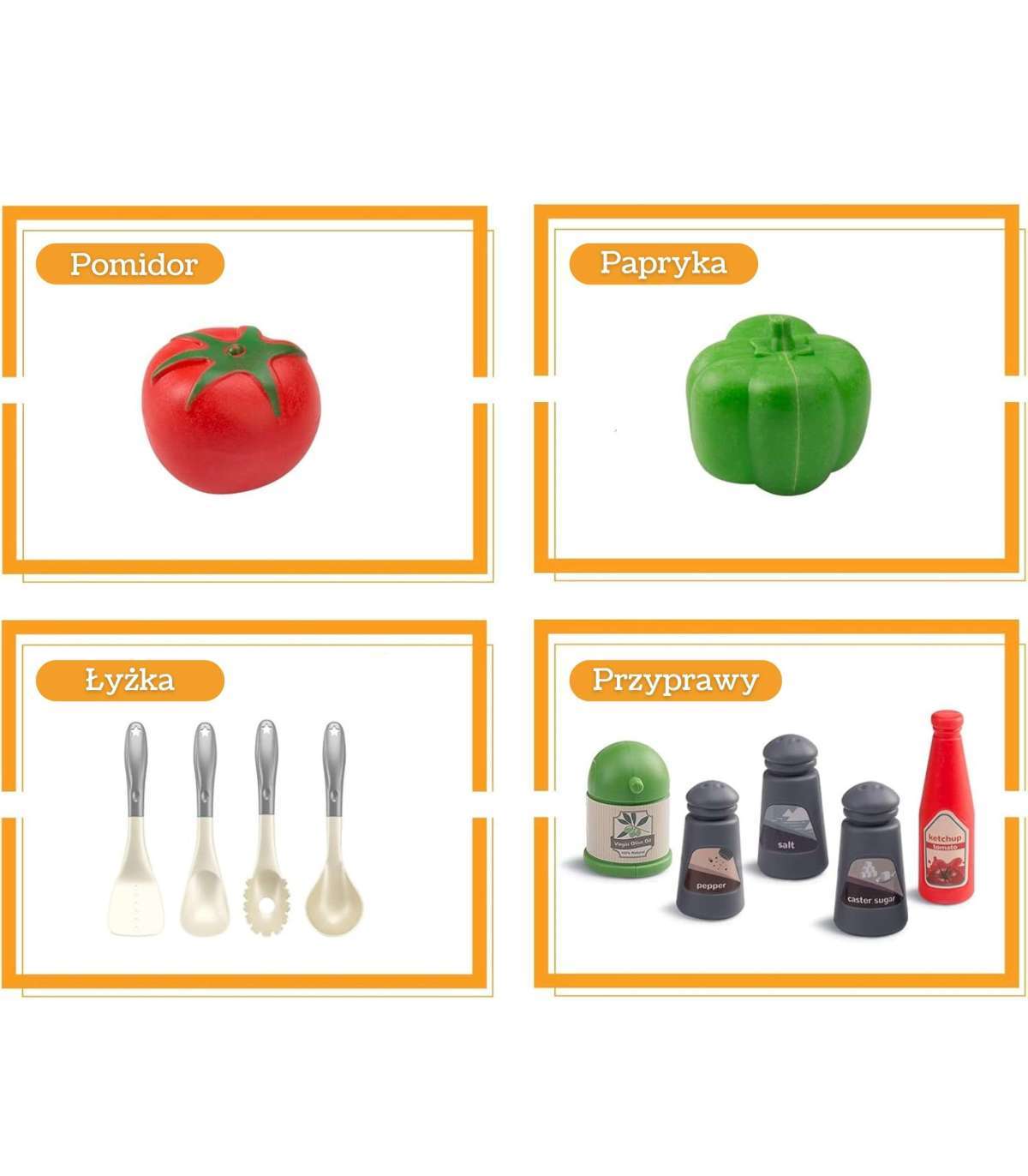 - - Realistyczne akcesoria, takie jak jajko sadzone, pomidor, warzywa i przyprawy.