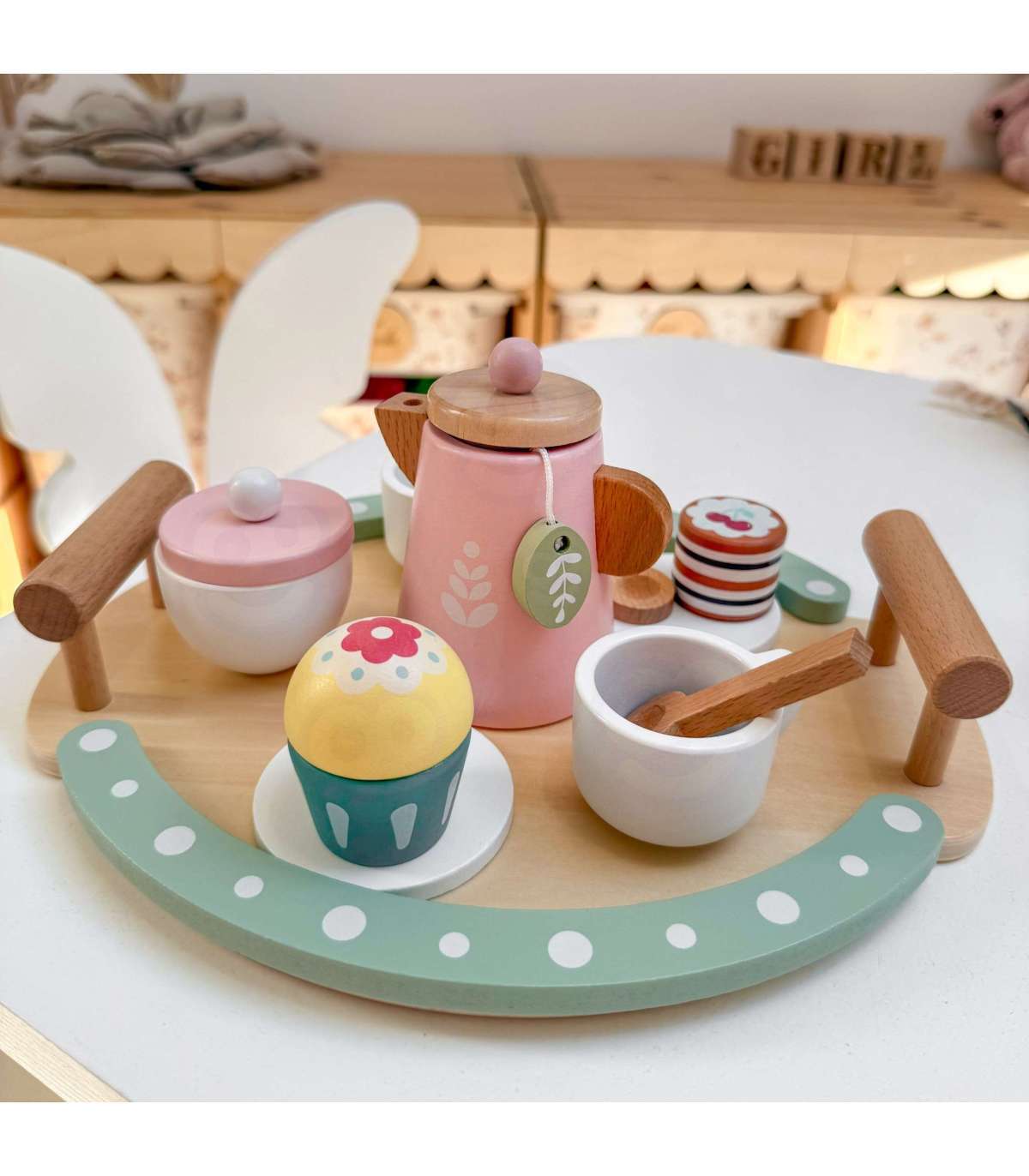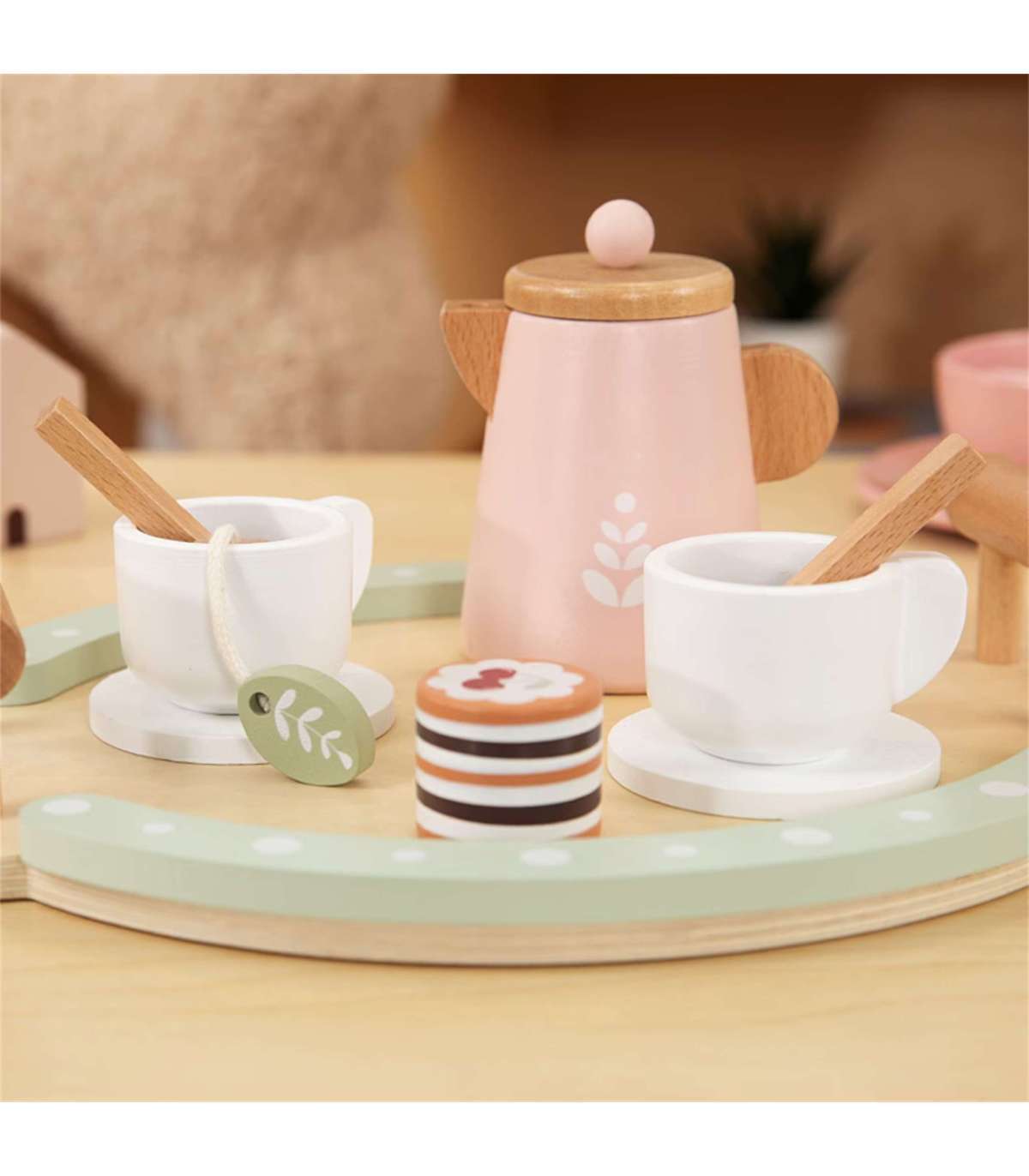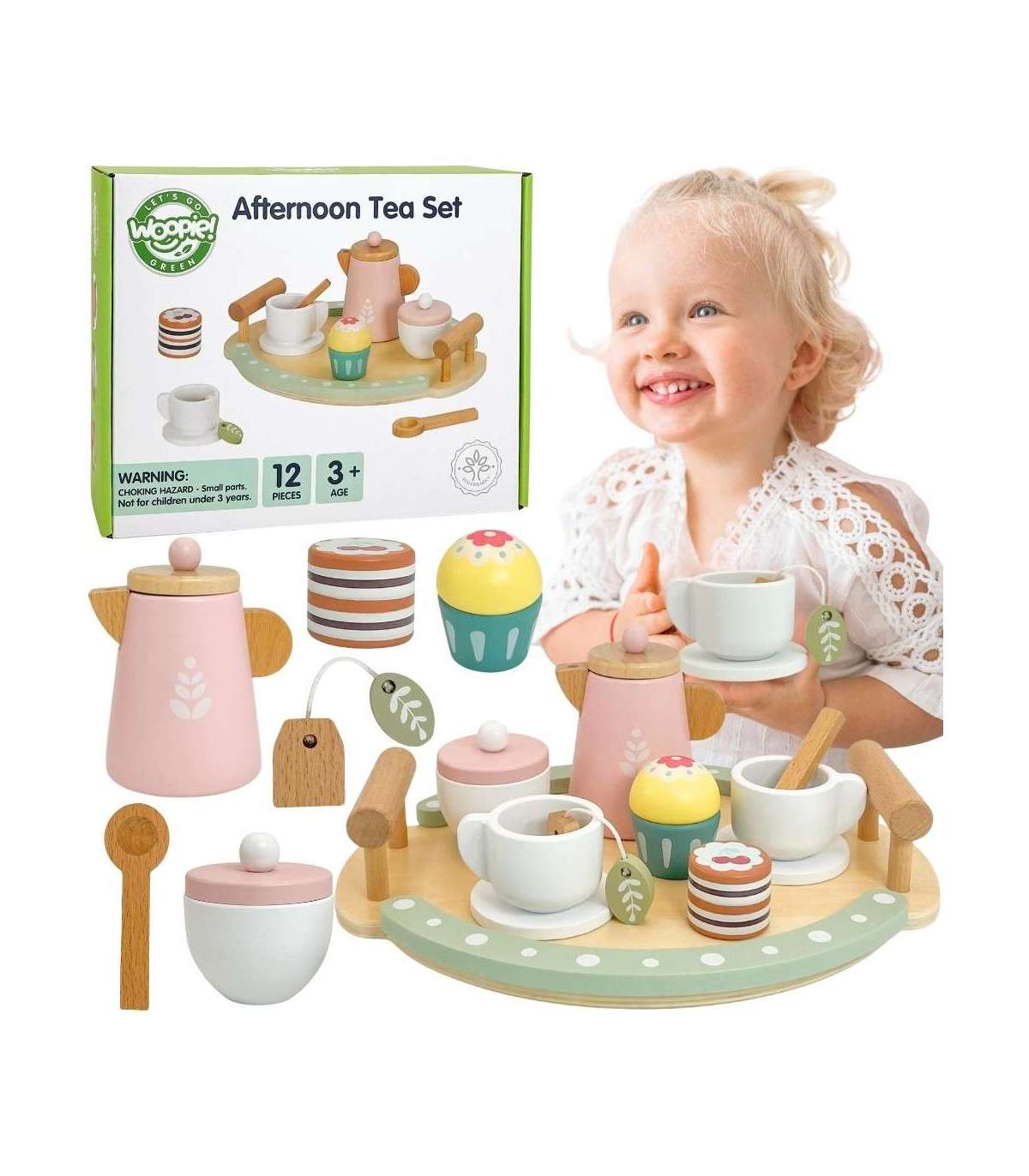 Zapraszamy na popołudniową herbatkę! Ten uroczy drewniany zestaw do parzenia herbaty marki Woopie Green to prawdziwy klejnot wśród zabawek do odgrywania ról. Dzięki pastelowej kolorystyce w odcieniach pudrowego różu, delikatnej zieleni i naturalnego drewna, każda zabawa zamienia się w elegancką herbacianą ceremonię. Dziecko może wcielić się w rolę gospodarza, serwując swoim gościom – rodzicom, rodzeństwu lub ulubionym pluszakom aromatyczną herbatę z dzbanka z pięknym listkiem, pyszne babeczki i wykwintne ciasteczka. Zestaw wykonany z wysokiej jakości drewna z bezpiecznymi, nietoksycznymi wykończeniami to gwarancja długotrwałej zabawy pełnej wyobraźni.