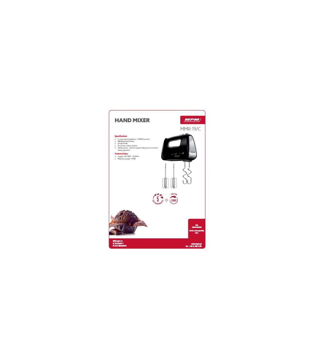 5 kiirust + turbo kiirus; lukustusnupp; kogemata käivitamise kaitse. Tarvikud: visplid, taignakonksud. 220-240V 50-60Hz; võimsus 750 W.