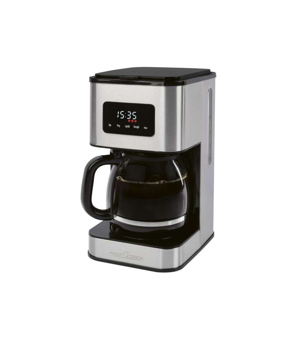 Stiilse disainiga, roostevabast terasest korpusega kohvimasin ProfiCook PCKA1299 12–14 tassi kohvi valmistamiseks (umbes 1,5 liitrit).