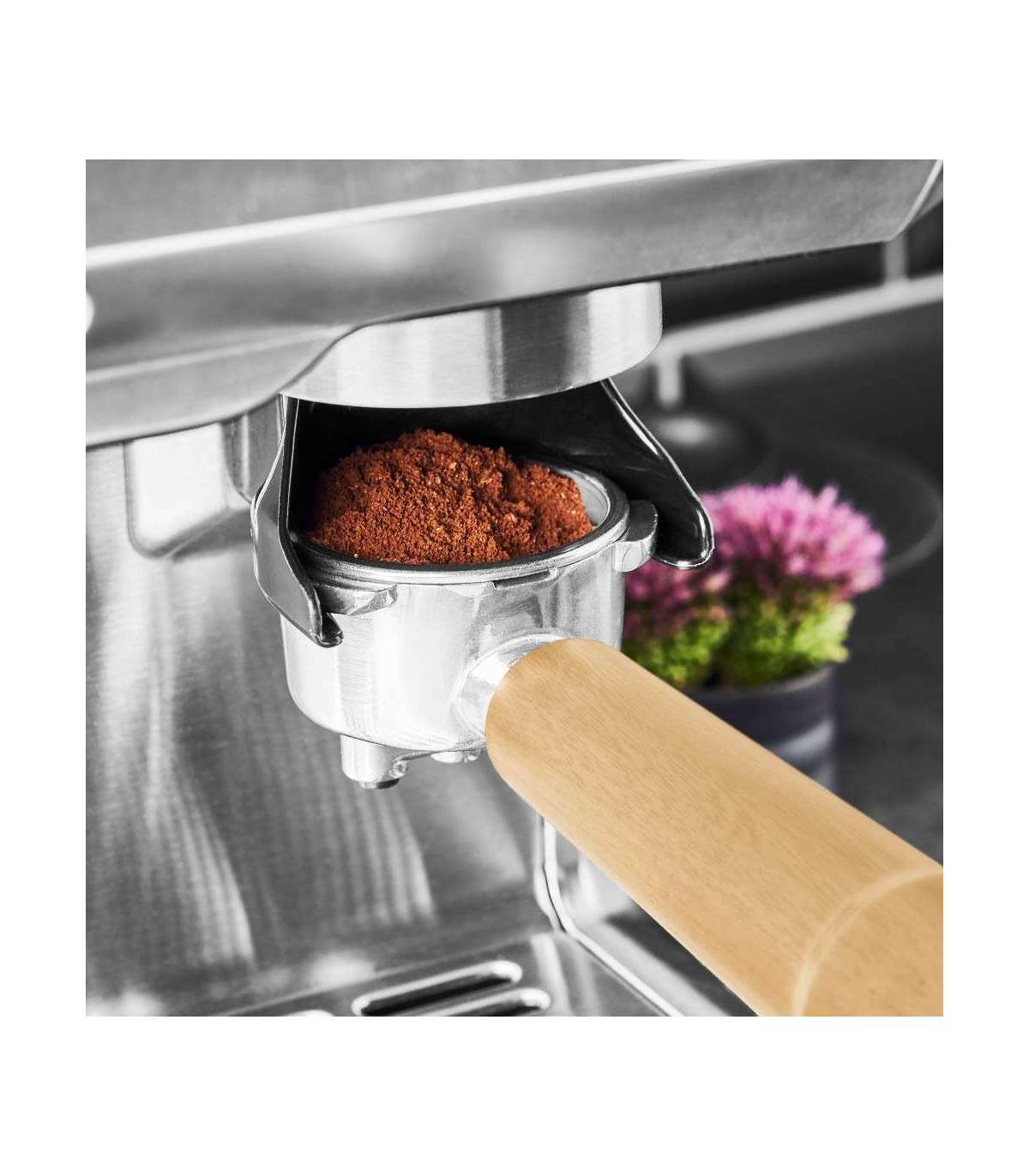 Visuaalne võlu tänu kvaliteetse ja elegantse pähklipuu integreerimisele portafiltri käepidemes, professionaalses espresso tamperis ja oamahuti kaanes