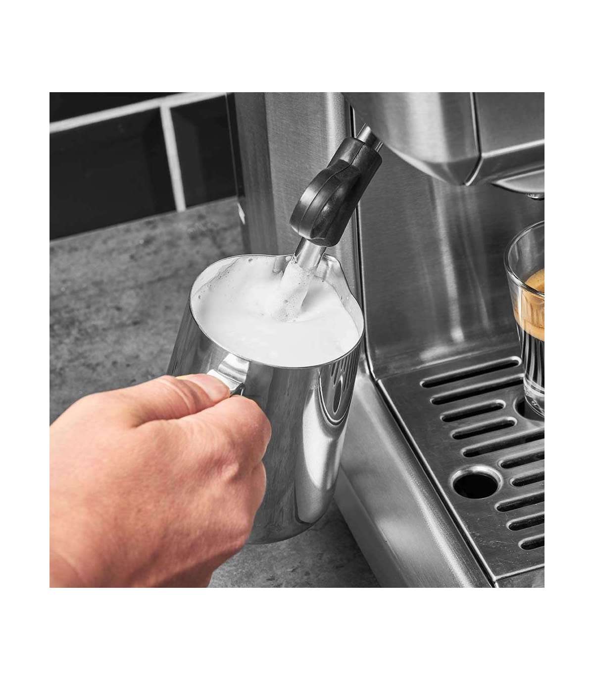 Kaasas olevad tarvikud: Professionaalne espresso tamper, ühe seinaga filtrisisustus 1 ja 2 tassi jaoks, kaheseinaline filtrisisustus 1 ja 2 tassi jaoks, filtrisisustus E.S.E. padjad, piimavahustamispurk, espresso tamperiga mõõtelusikas, puhastusvahend, veefilter
