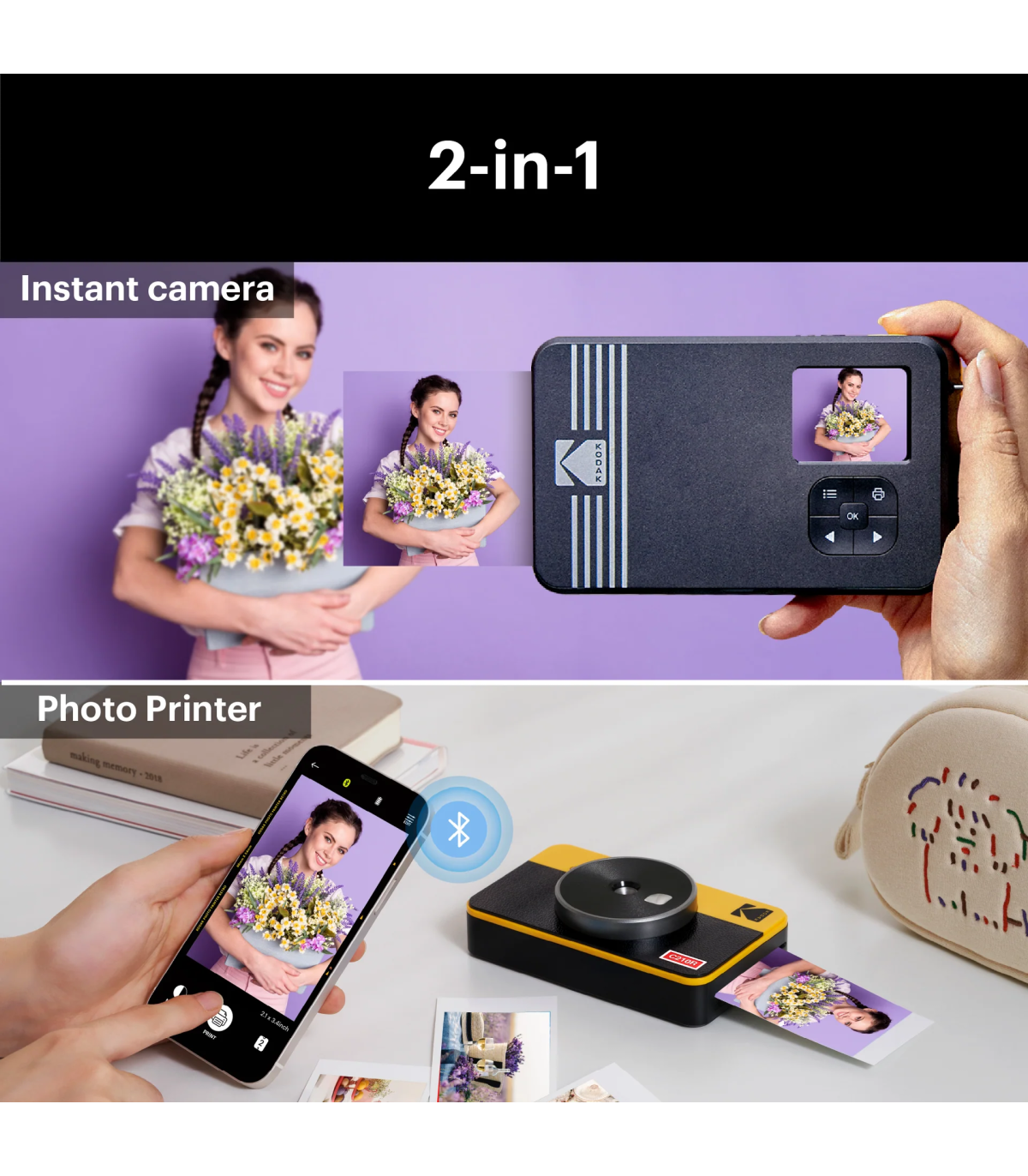 Kiirkaamera + fotoprinter: Kodak Mini Shot 2 Retro on sisseehitatud fotoprinteriga digikaamera, nii et saate pärast pildistamist pilte printida või need tühistada. Selle kiirkaameraga saate Bluetoothi kaudu printida ka 2,1x3,4" fotosid otse oma mobiilseadme galeriist. Kodak Mini Shot 2 Retro ühildub Apple iPhone'i, iPadi ja Androidi seadmetega.