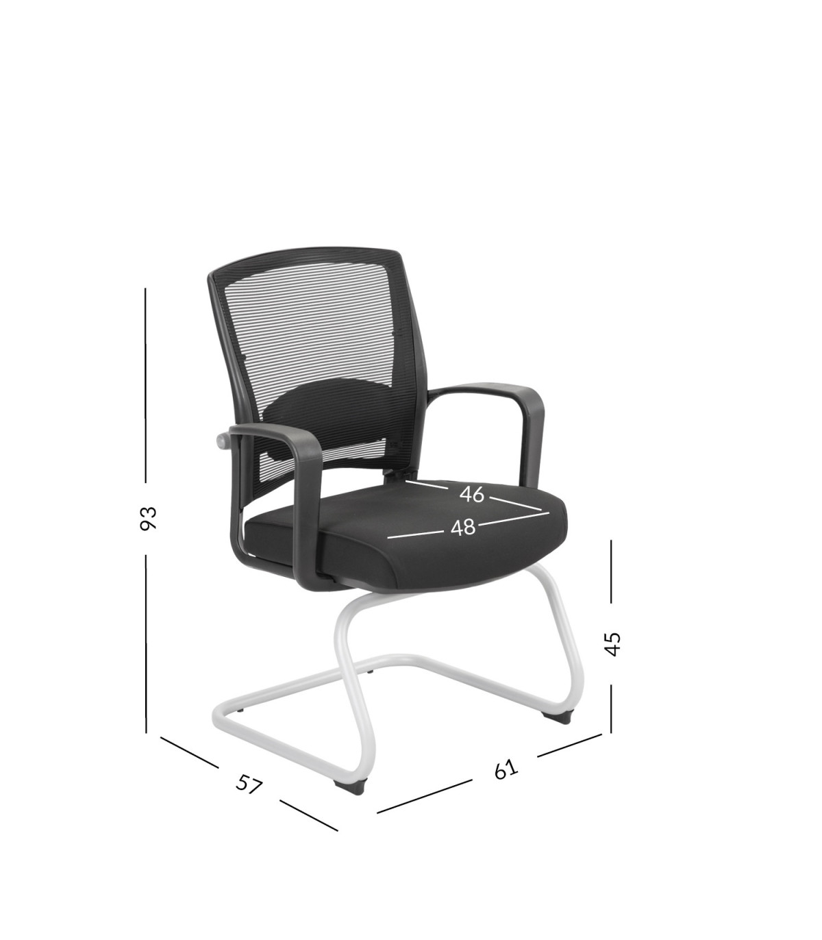 Klienditool FULKRUM must. Tooli elastne võrkkangast seljatugi on mugav ja laseb hästi õhku läbi. Reguleeritav nimmetugi tagab vajaliku toe alaseljale. Seljatoe raam ja käetoed on valmistatud mustas plastikust. Tooli polsterdatud iste on kaetud musta polüesterkangaga, Martindale’i väärtus 50 000. Tooli metallist jalg on viimistletud hõbehalli pulbervärviga. Tooli üldmõõdud on 61x57xH9cm. Kaalupiirang 120kg.