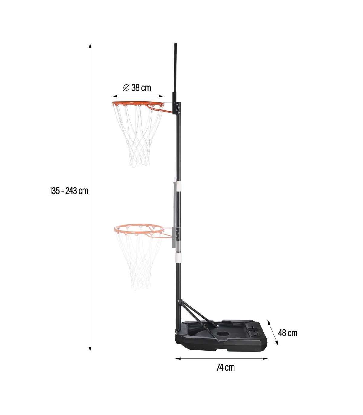 ZDK001 basketball hoop – the ideal choice for training and recreational playThe ZDK001 basketball hoop is a versatile set designed for both recreational play and regular shooting training at home. Thanks to its sturdy construction and adjustable height, the hoop can be used by children, teenagers and adults. It is perfect for the garden, driveway, school playground, as well as sports halls and gyms. The ZDK001 model has been designed for maximum durability and functionality, while maintaining compact dimensions and easy assembly and transportation.Adjustable height - grows with the userThe greatest advantage of the ZDK001 model is the wide range of height adjustment of the hoop – from 135 to as much as 243 cm. This allows you to easily adjust the basket to the age and height of the users. Children can start learning to throw at a lower setting, and more advanced players have the option of raising the hoop to a professional level. The adjustment mechanism is easy to use, allowing you to quickly adjust the height as needed - whether you play alone, with your family, or with a group of friends.Impact-resistant backboard - confidence and safetyThe ZDK001 model has a board measuring 71 x 48 cm, made of impact-resistant PC plastic mounted on a steel frame. An additional foam frame increases the level of safety during the game and protects against accidental injuries. Thanks to its solid construction, the board is resistant to weather conditions and intensive use, which makes it an excellent choice for both indoor and outdoor use.Steel rim and durable net – play like the prosThe basket is equipped with a steel rim with a diameter of 45 cm, made of a durable steel rod with a diameter of 16 mm. This is a standard rim size, allowing you to play with official size balls. The set also includes a net made of weather-resistant nylon, which retains its elasticity and aesthetics even during long-term outdoor use. The set allows for dynamic play in all conditions - regardless of the weather and the intensity of training.Stable and mobile construction - comfort and safety of useThe basketball hoop frame consists of three segments made of steel tubes with diameters of 35 mm, 38 mm and 45 mm, which are connected to form a single rigid, stable construction. This ensures that the basketball hoop remains stable even when strong shots are taken and dynamic plays are made. The whole construction stands on a solid base measuring 74 x 48 x 11 cm, made of durable blow-molded PE. The base can be filled with water or sand, which further increases its stability. The built-in transport wheels (optional depending on the version) allow you to easily move the basket anywhere you want – to the garden, driveway or sports hall.ZDK001 basket – universal equipment for the whole familyThe ZDK001 is a portable basketball hoop that offers everything you need for a comfortable and safe game. Adjustable height, weather resistance, a mobile base and durable materials make this equipment perfect for a home court, but also as an attraction in educational institutions or leisure centers. It is an investment in physical activity and a healthy lifestyle for the whole family.Specification:Model: ZDK001Hoop height adjustment: from 135 cm to 243 cmBackboard dimensions: 71 x 48 cmBackboard material: PC plastic on steel frame with foam protectionHoop diameter: 45 cmHoop material: steel, 16 mm diameter rodNet: nylon, weather-resistantPost: 3-piece, steel tubes with diameters of 35 mm, 38 mm and 45 mmBase dimensions: 74 x 48 x 11 cmBase material: PE plastic (blow molded), can be filled with water or sandIntended use: for indoor and outdoor use, for children, teenagers and adultsApplication: for recreation, basketball training and basketball trainingRemarks:Not for commercial use24 months warrantyImporter: Abisal Ltd. | Poland | 41-807 Zabrze | Pyskowicka Street 17 | e-mail: abisal@abisal.plAbisal Ltd.. declares that the products sold by the company are safe and meet the requirements contained in the Act on General Product Safety of December 12, 2003. (Journal of Laws of December 31, 2003)