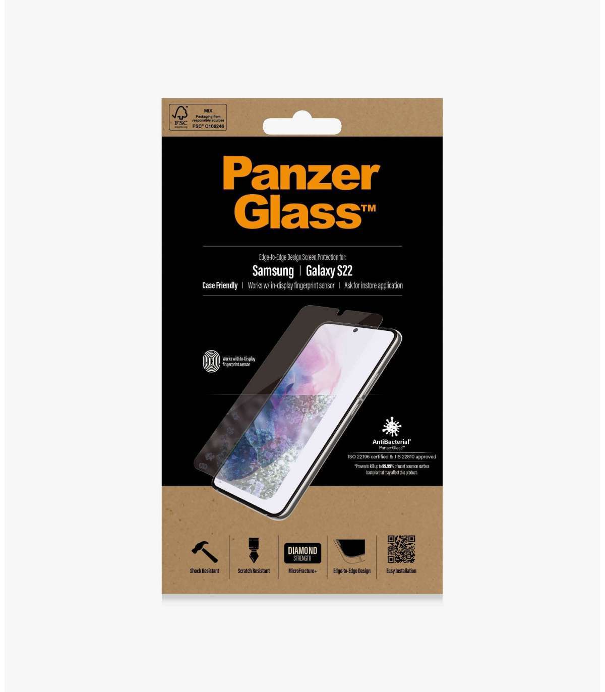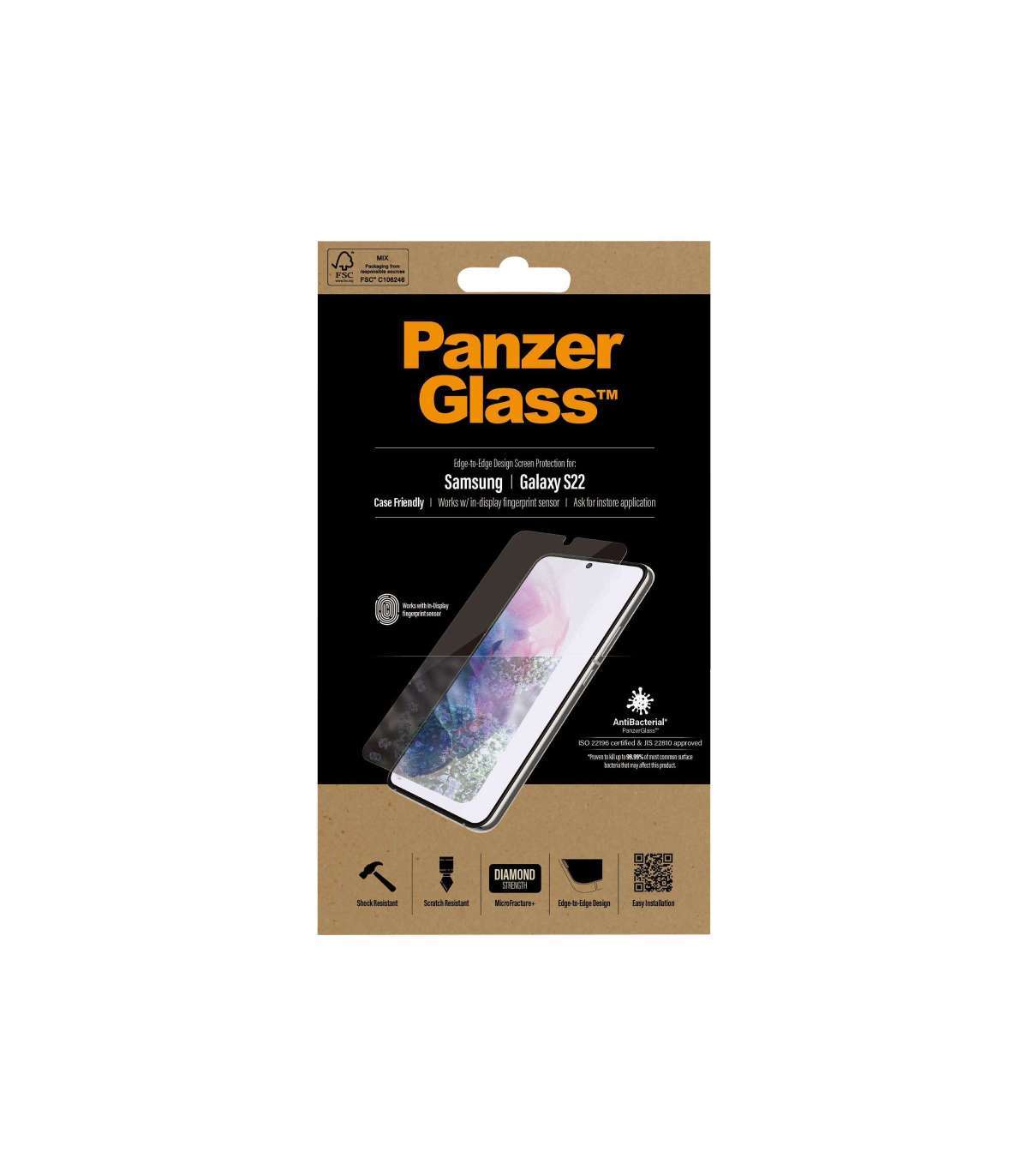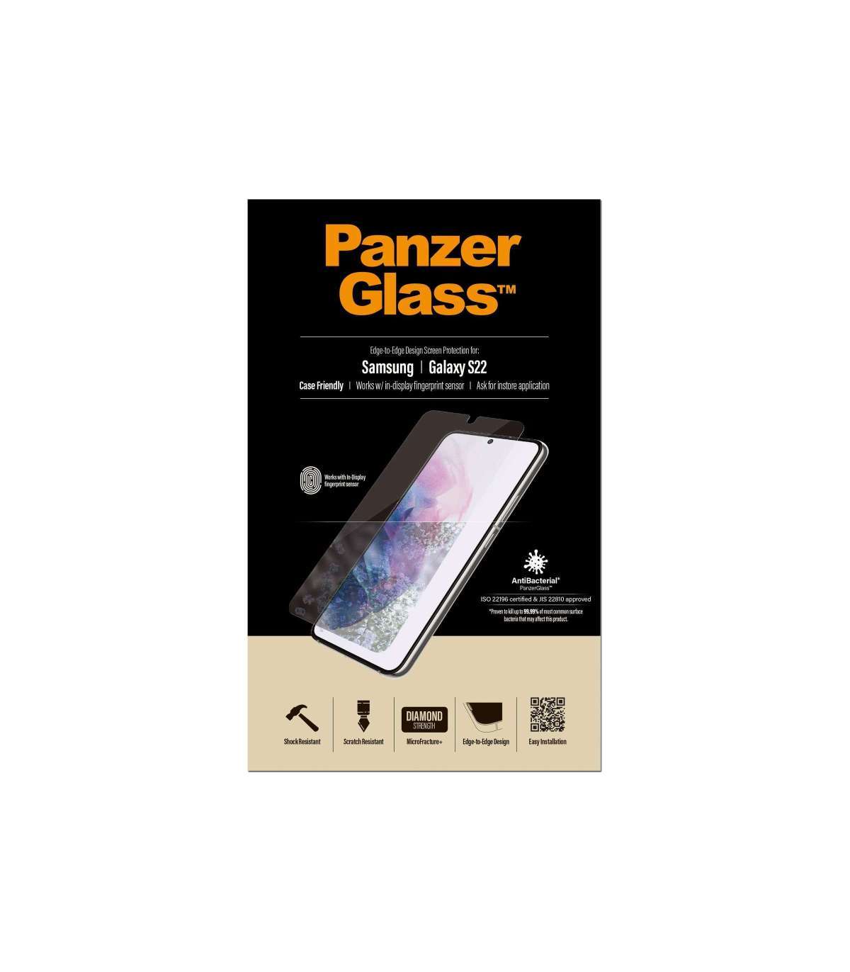 PanzerGlass | Samsung | Galaxy S22 | Tempered glass | Transparent | Case friendly. Compatible with ultrasonic fingerprint sensor. 100 % touch sensitivity. Antibacterial (ISO 22196 certified & JIS 22810 approved) | Screen Protector