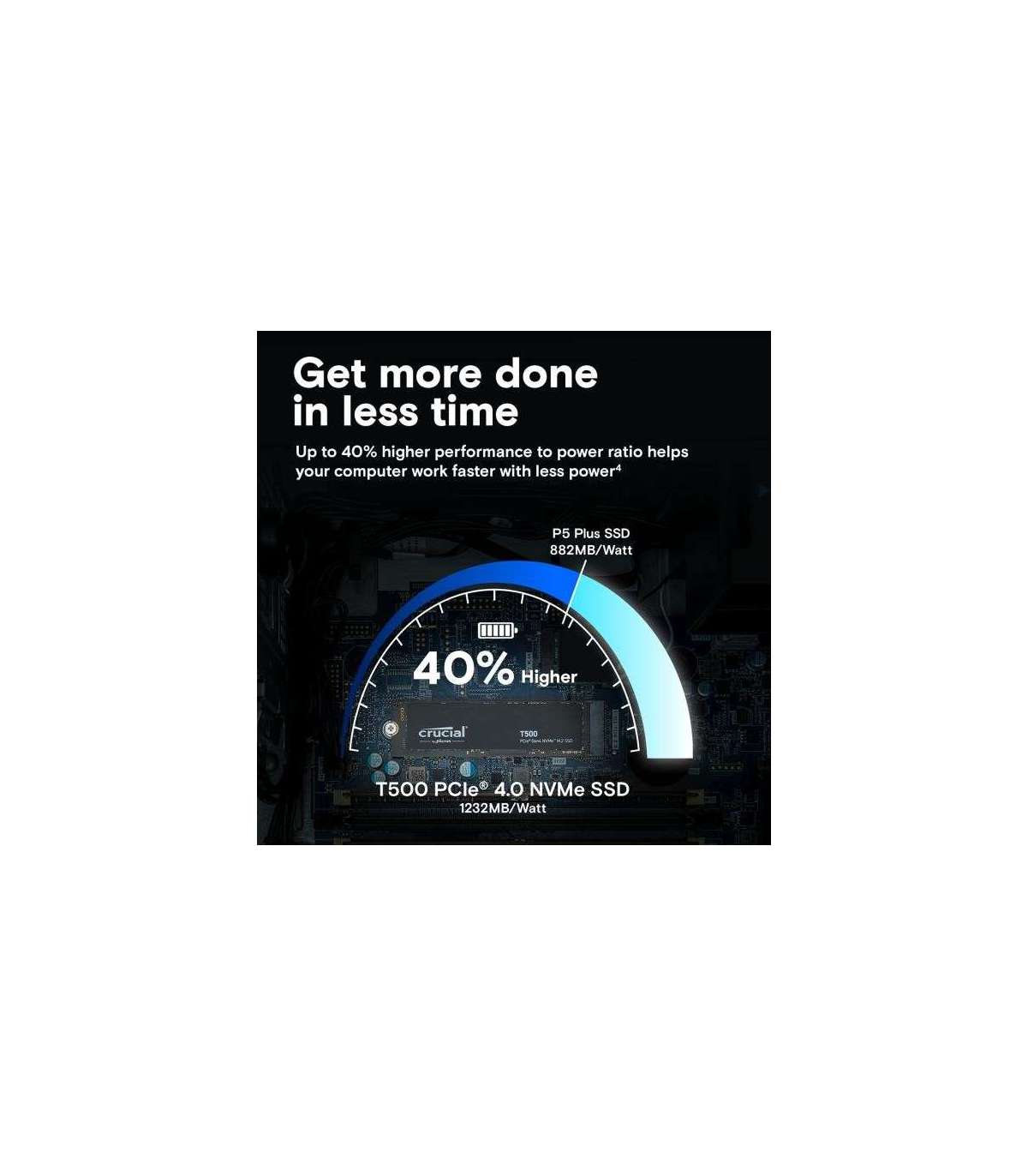 Get more done in less time with the T500’s power efficiency. With up to a 40% higher performance to power ratio4, the Crucial T500 PCle 4.0 NVMe SSD helps keep your computer working faster with less power.