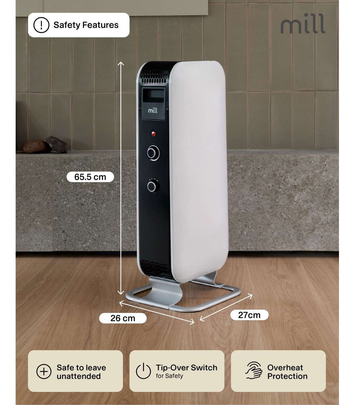 - Mechanical thermostat. Portable.Over heating protection. Tip-over switch.