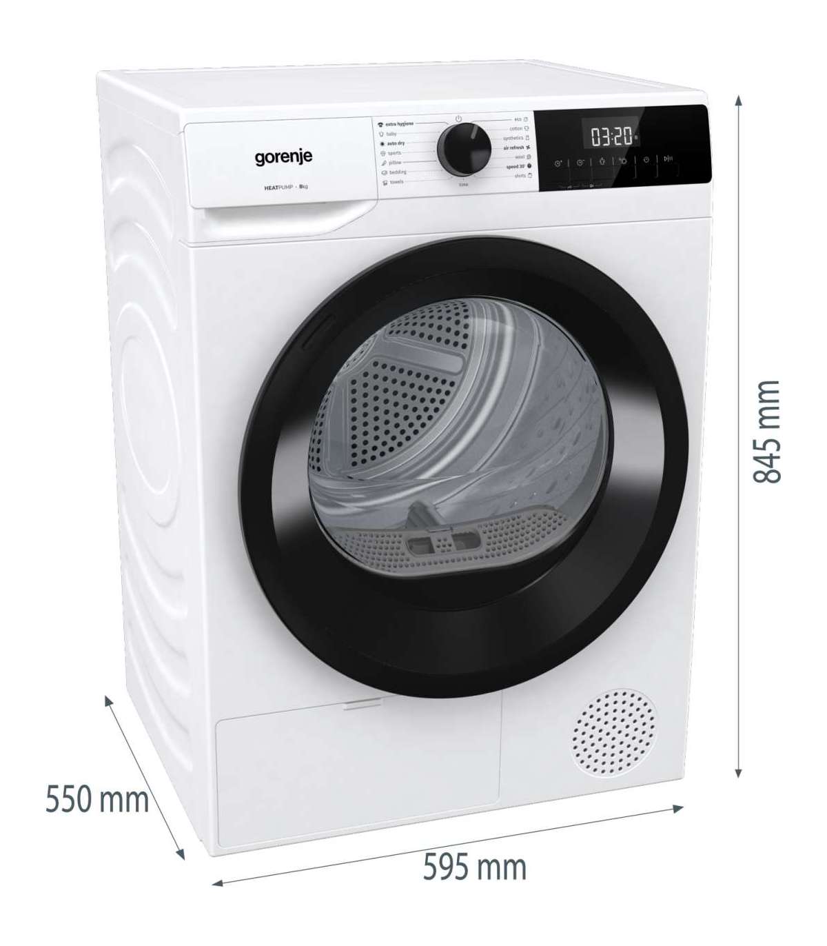 Gorenje Dryer Machine | DHNE82 | Energy efficiency class Class D | Front loading | 8 kg | LED | Depth 55 cm | White