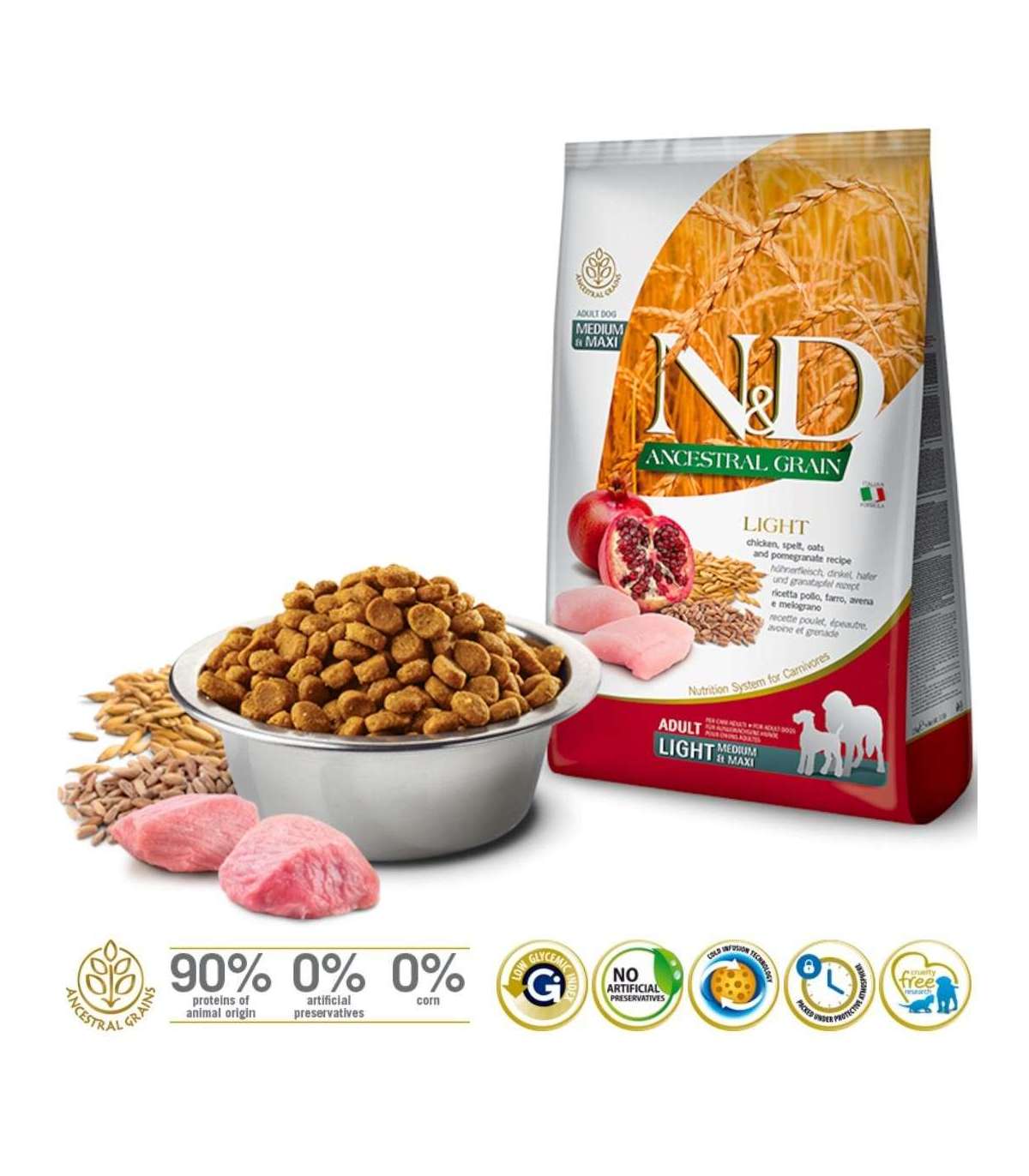 FARMINA N&D ANCESTRAL GRAIN DOG LIGHT - CHICKEN. SPELT.OATS AND POMEGRANATE ADULT MEDIUM & MAXI 12kg