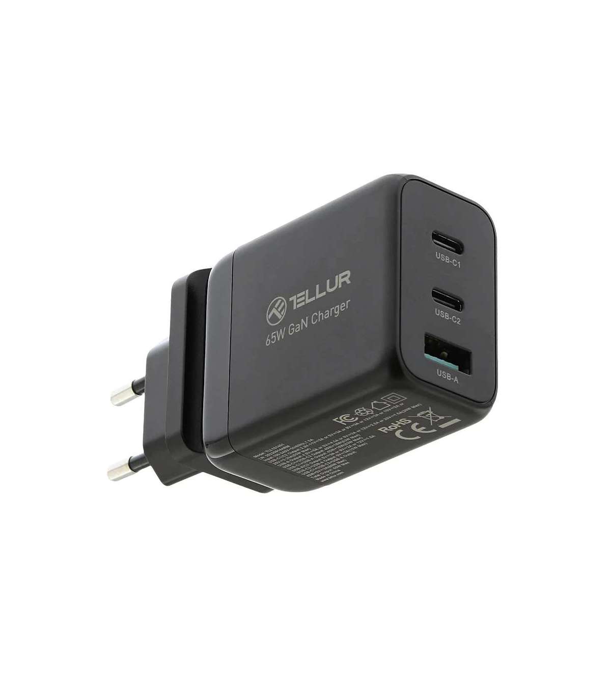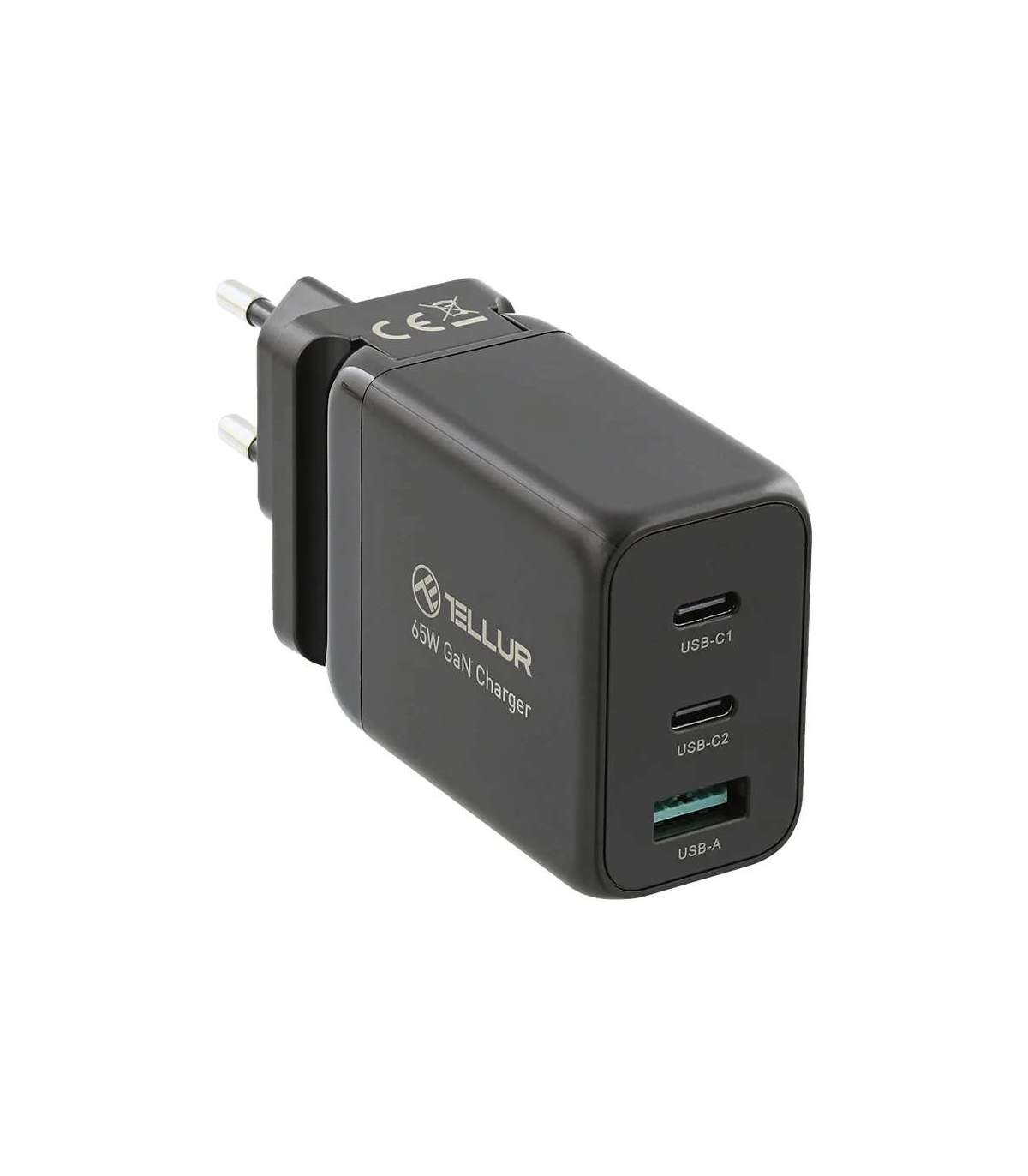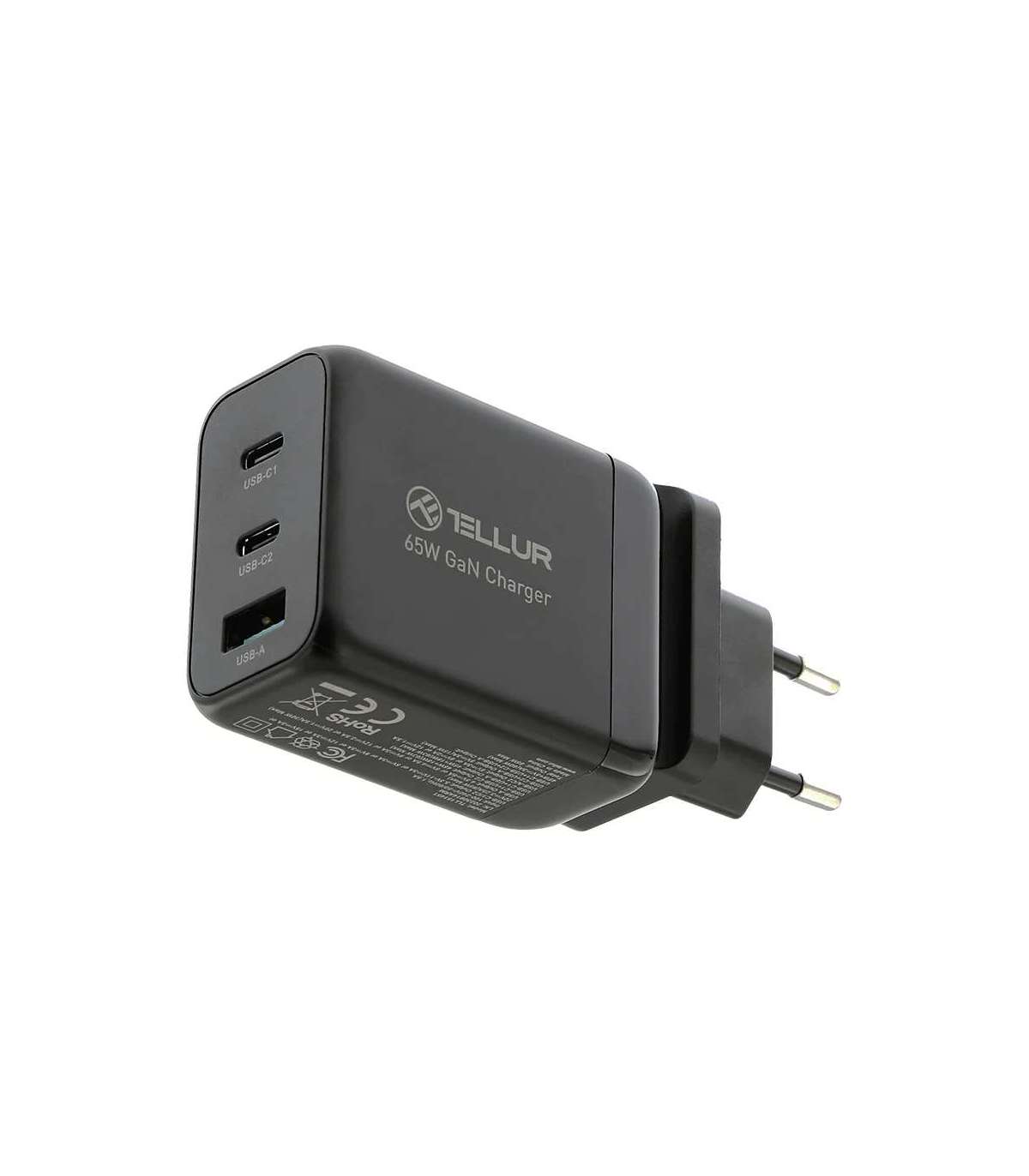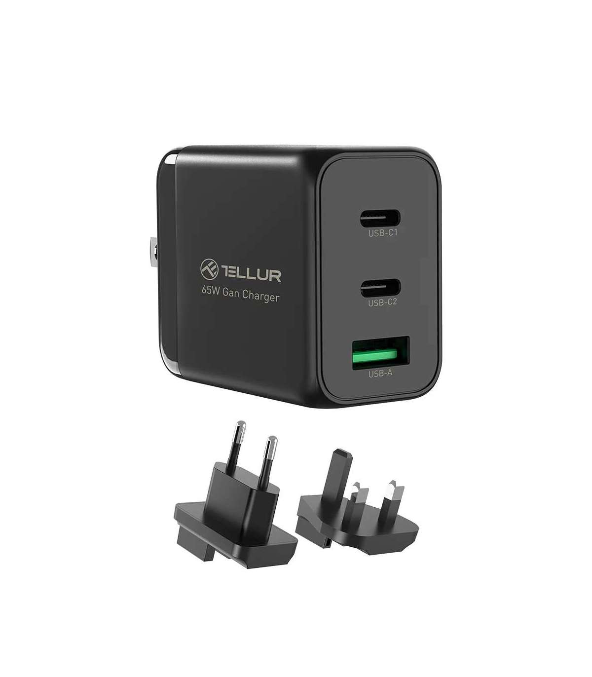 Tellur GaN 65W 3-port wall charger, 2xUSB-C + USB-A, EU,UK,US, black