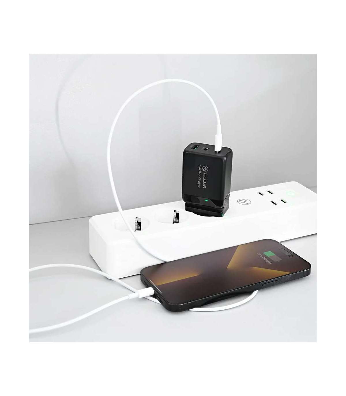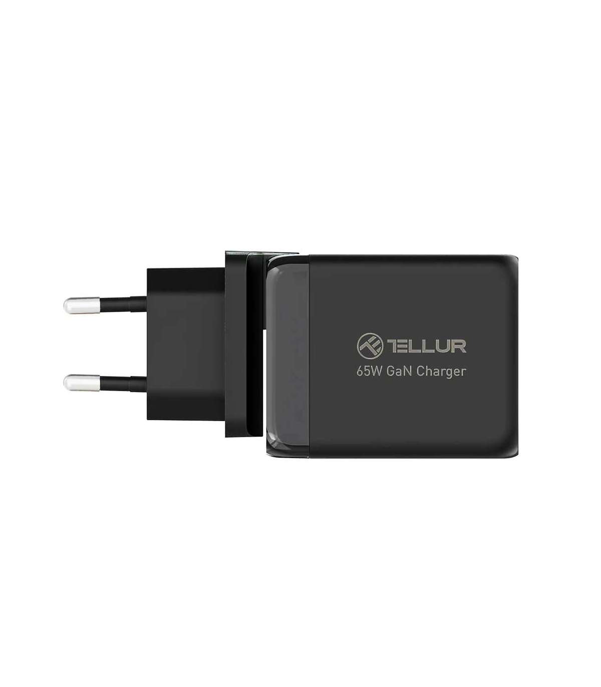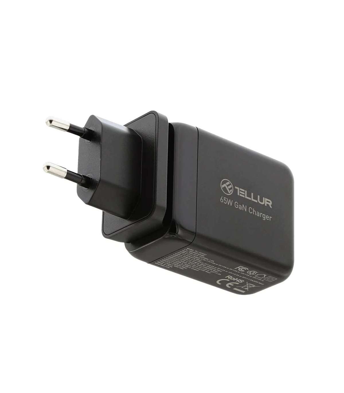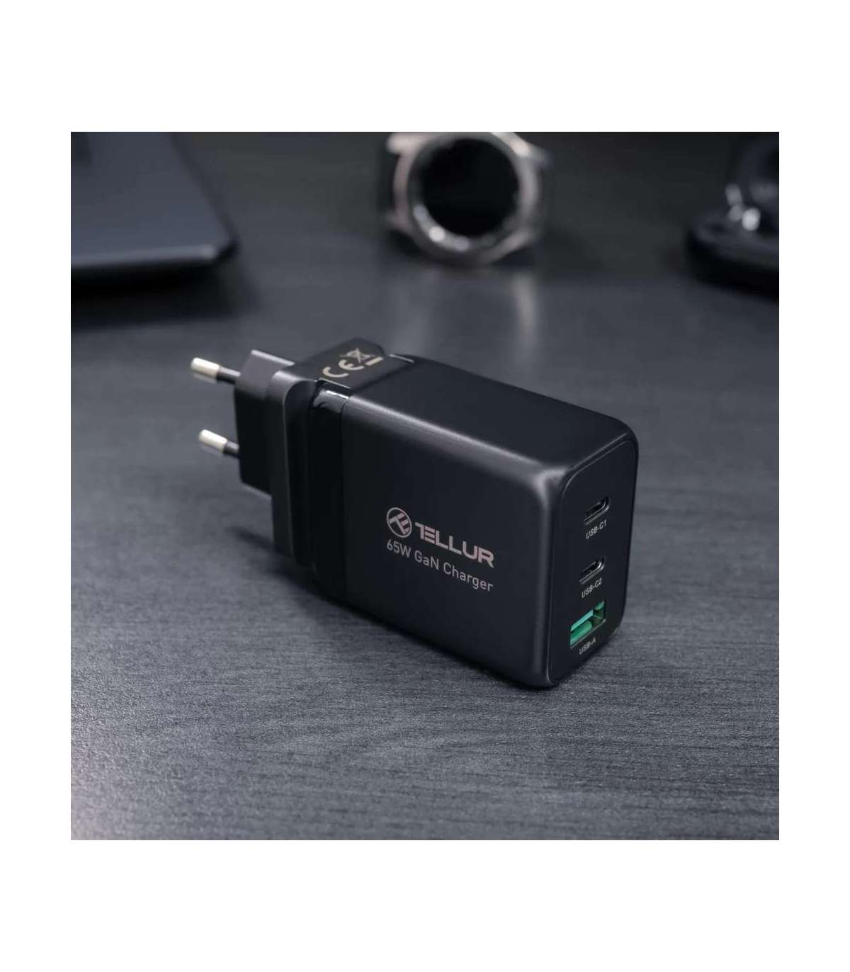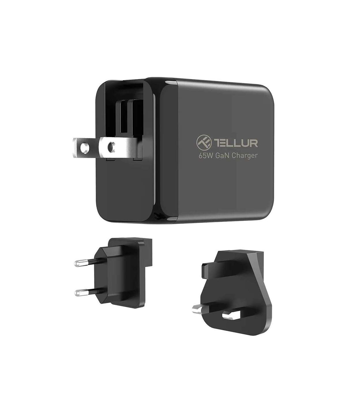 Tellur GaN 65W 3-port wall charger, 2xUSB-C + USB-A, EU,UK,US, black