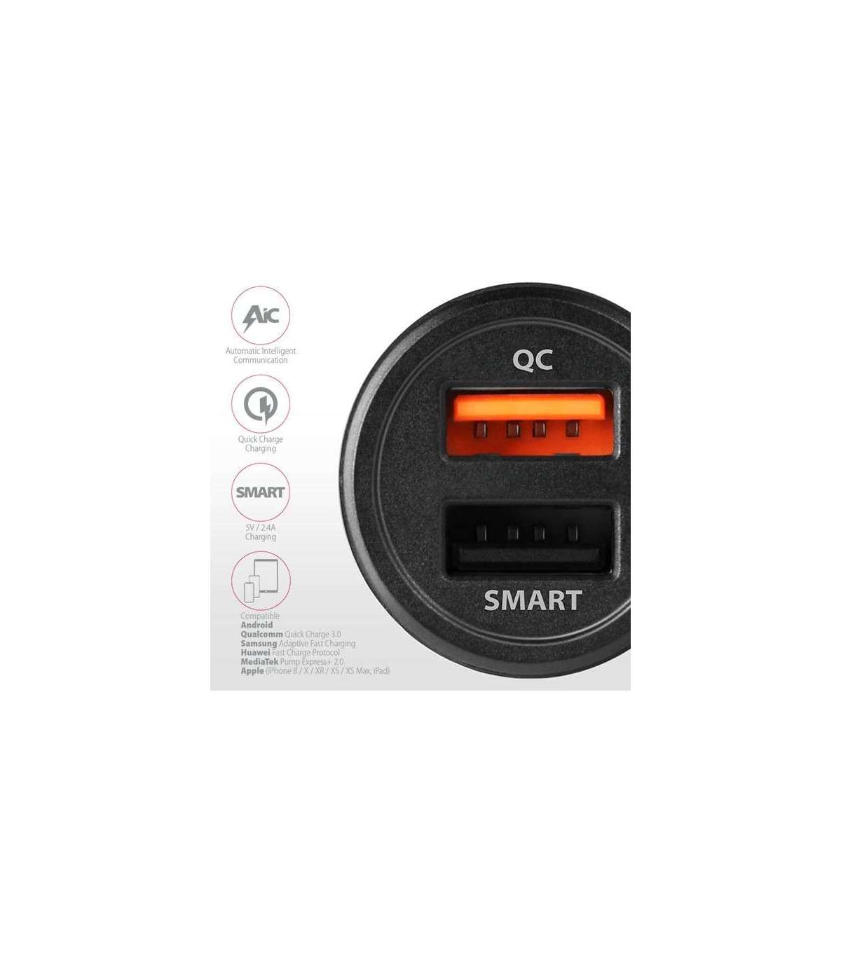 - USB type A-F, 2-port output, QC3.0