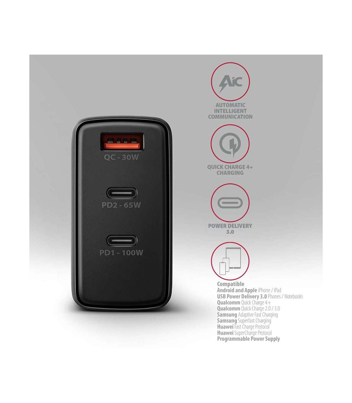 - GaN wallcharger, 3x port (USB-A + 2x USB-C), PD3.0/PPS/QC4+/SFC2.0/AFC/SCP/FCP/Apple, 100W