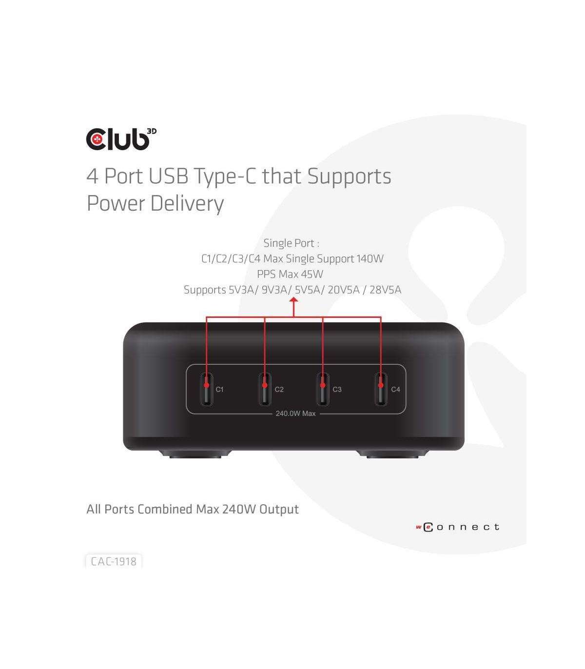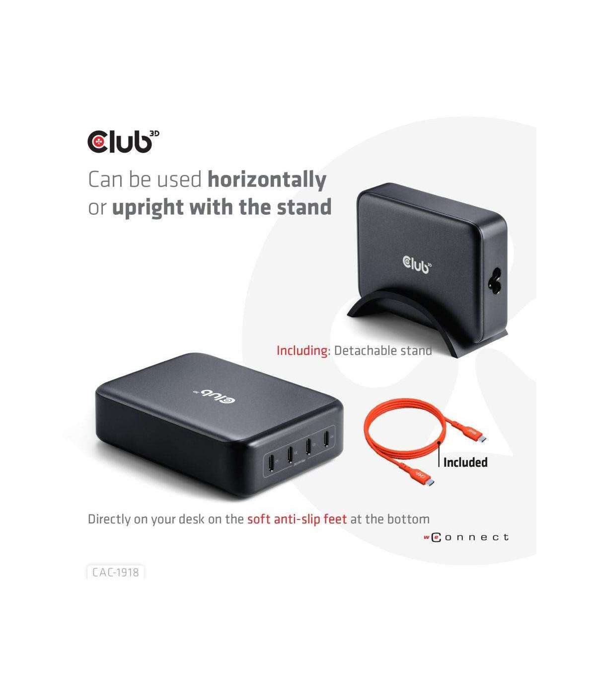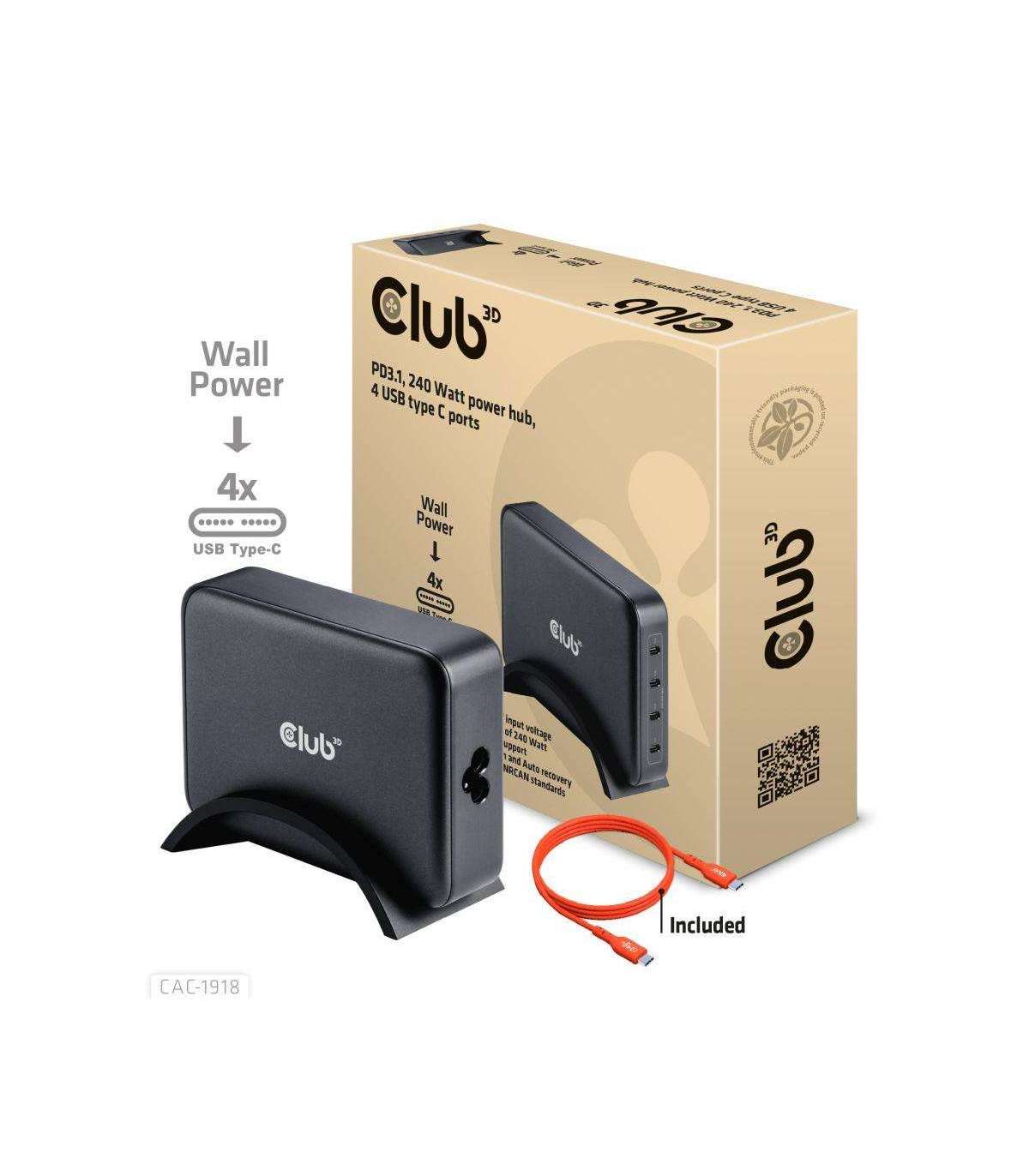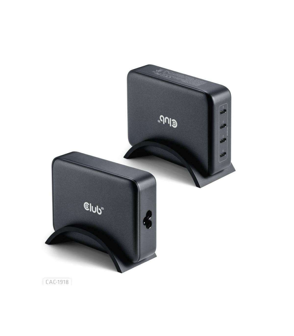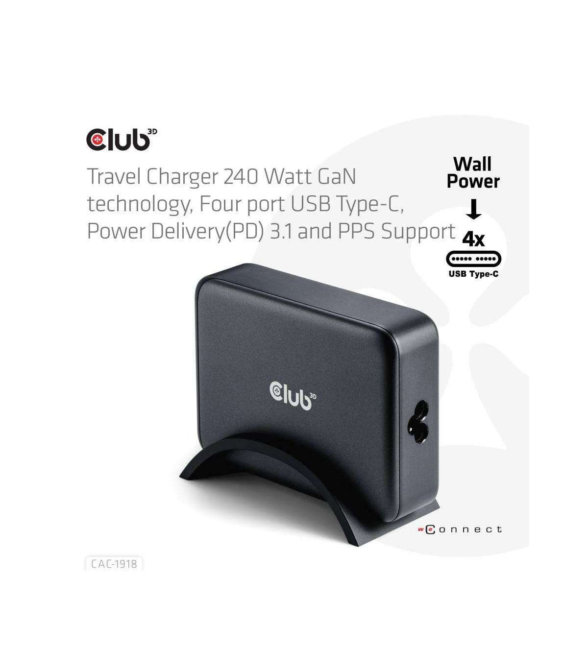 The Club 3D CAC-1918 Travel Charger 240 Watt GaN technology, Four port USB Type-C, Power Delivery(PD) 3.1 and PPS Support is a high-performance and fashionable design travel charger. Versatility: Perfect solution for business travelers and power users needs and multiple ports. This means you only need one charger for all your modern devices, and you don't have to worry about carrying multiple adapters. Portability: Highly portable and easy to carry (535 gr / 18.87 oz) in a backpack or luggage, making it ideal for business travelers who need to stay connected on the go without being weighed down by bulky chargers. Powerful charging: The 240 Watt charger charges multiple devices simultaneously at high speed, while improving the life of your batteries at the same time. Ensuring busy travelers can stay productive on the move without waiting around for hours. Built-in safeguards protect your devices against excessive current, overcharging and overheating(OCP-OTP-SCP-OVP). The unit comes with a suporting bridge to position the unit uprigth.
