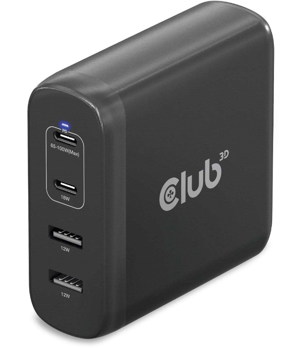 The Club 3D CAC-1912 Travel Charger 100W GaN technology, Four port USB Type-A(2x) and -C(2x), Power Delivery(PD) 3.0 Support is a high-performance and fashionable design travel charger. It is equipped with four USB connectors that are for output interfaces, this product allows four devices to be charged at the same time. And the two USB Type-A ports can convey 2.4A each to total 3.4A. The USB Type-C port is specially designed for notebooks with a USB Type-C Host connection for a total 18W (5V/3A,9V/2A) output. The top USB Type-C port is specially designed for the USB Type-C notebooks with total 65W-100W (5~15V/3A,20V/3.25A,20V/5A) output. The maximum power output for single USB Type-C port is 100W. It is suitable to charge mobile phones, tablets and laptops. The unique design makes your life simpler and easier.