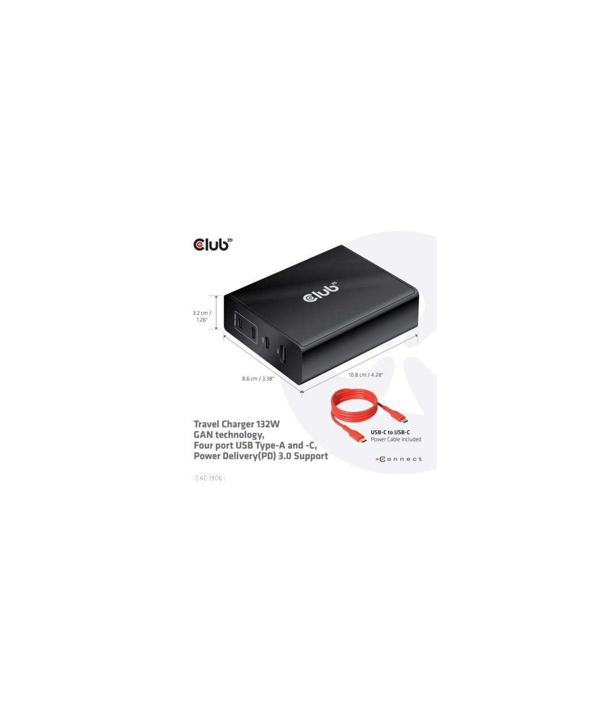 The Club 3D CAC-1906 Travel Charger 132W GAN technology, Four port USB Type-A and -C, Power Delivery(PD) 3.0 Support. This product is a high-performance, low weight travel charger with a maximum output power of 132W. Equipped with 3 USB Type-C ports and 1 Type-A port, the total output supports up to 132W, which can meet the needs of charging four devices at the same time. Compatible with multiple devices (support mobile phones,tablets and laptops). It is a convenient companion during travel and for business! Compact size & Superior Performance: GAN technology makes this charger 50% smaller than a 132W MacBook charger, small enough to carry anywhere.The 132W wall charger match a variety of PD devices from smart phones to laptops, one for all making charging simple. The Power Charger is light weight without compromising on Quality and safety. By adopting Power Delivery(PD) charging technology, this versatile Power Charger provides you with charging function through USB Type-C interface, you can charge any connected Mobilephone / Tablet / NoteBook.