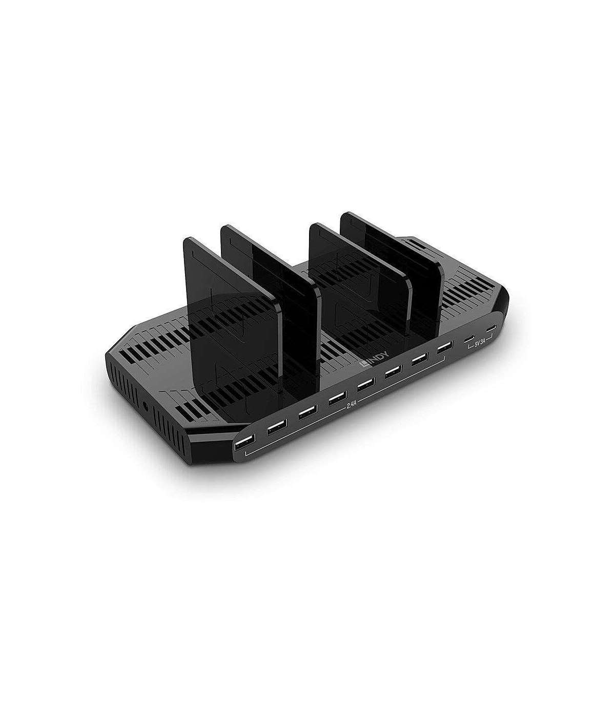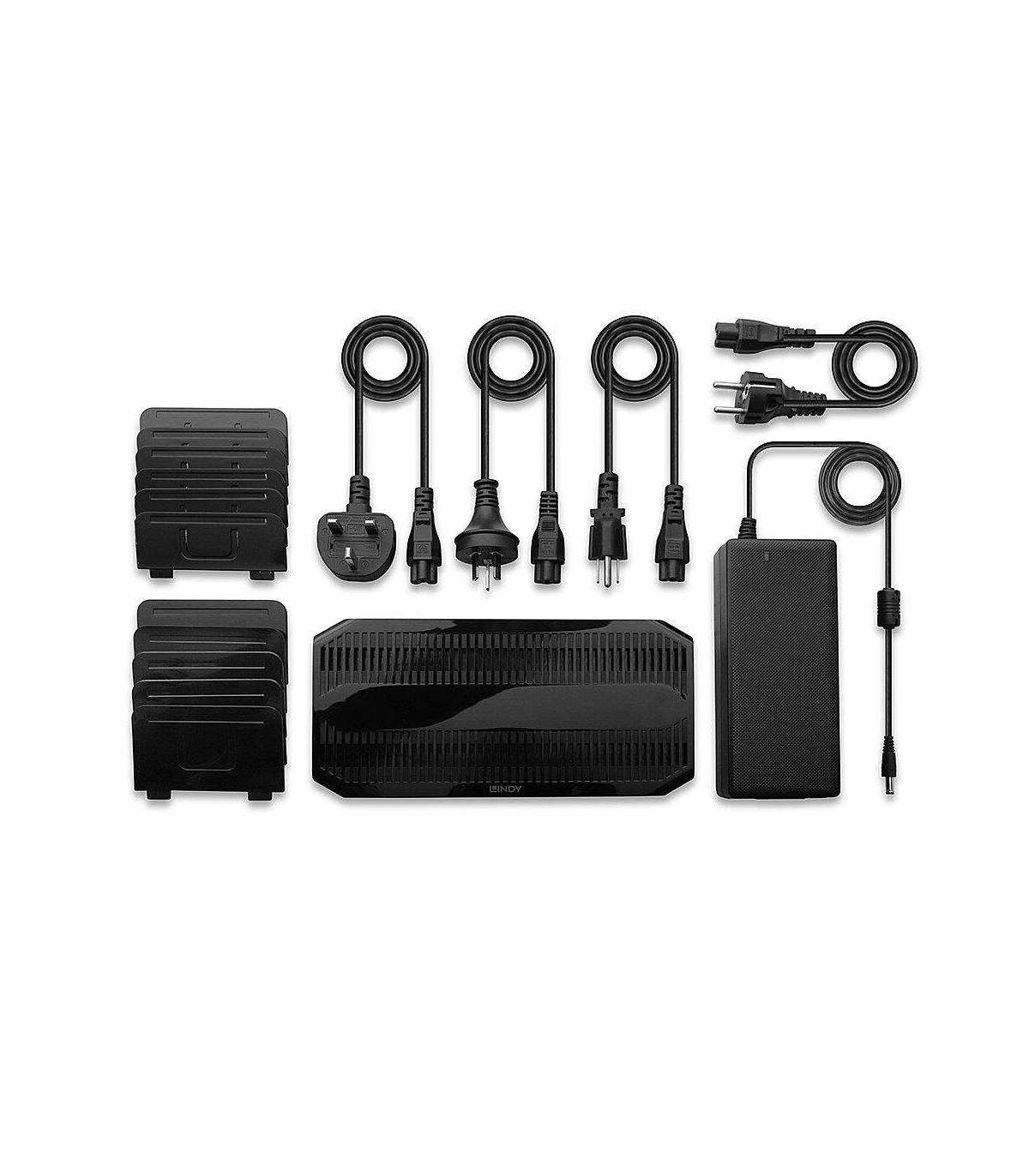 The Lindy 120W 10 Port USB Charging Station allows charging up to 8 USB devices via Type A and 2 via Type C like tablets or smartphones. Each USB Type A port can provide up to 5V 2.4A, each USB Type C port can provide up to 5V 3A to satisfy the most power hungry devices. If all 10 ports are occupied and/or when total power draw is higher than 120W, load balancing will occur. With its smart charging function and support of many different protocols like QC 3.0 (only type C ports) , Samsung AFC and Apple 5V 2.4A Charging Protocol and BC 1.2 (only Type A ports) this USB Charging Station can recognise the connected device to automatically adjust the charging current for a fast and safe charge while also providing overcurrent, overvoltage and short-circuit protection to avoid excessive current damaging the device. Plastic dividers can be assembled and stood on the top of the unit, which allows different widths for different tablets or mobile phone sizes. This product is perfect for use in schools, libraries, hotels, restaurants or any location that uses multiple devices. Country specfic power cables are provided for seamless use of the charging station, ideal for global events or integration into installations abroad.