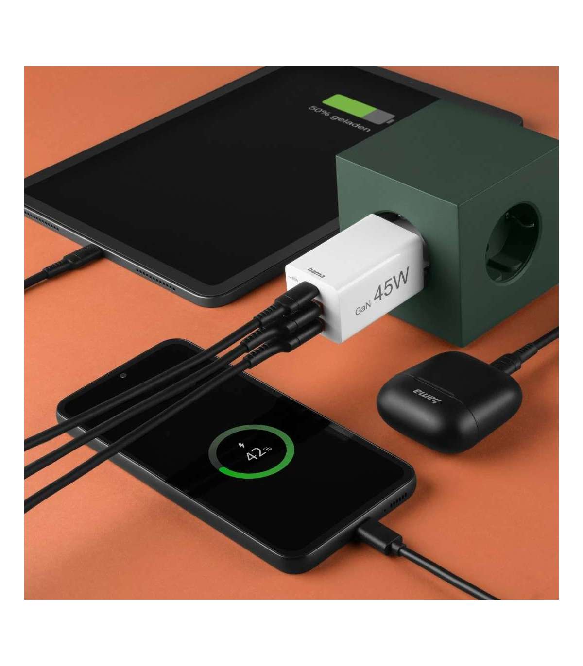 Maksimaalne väljundvõimsus: 45 vatti – universaalne laadija mobiiltelefonide või muude seadmete kiireks laadimiseks USB-A ja USB-C liidese kaudu.