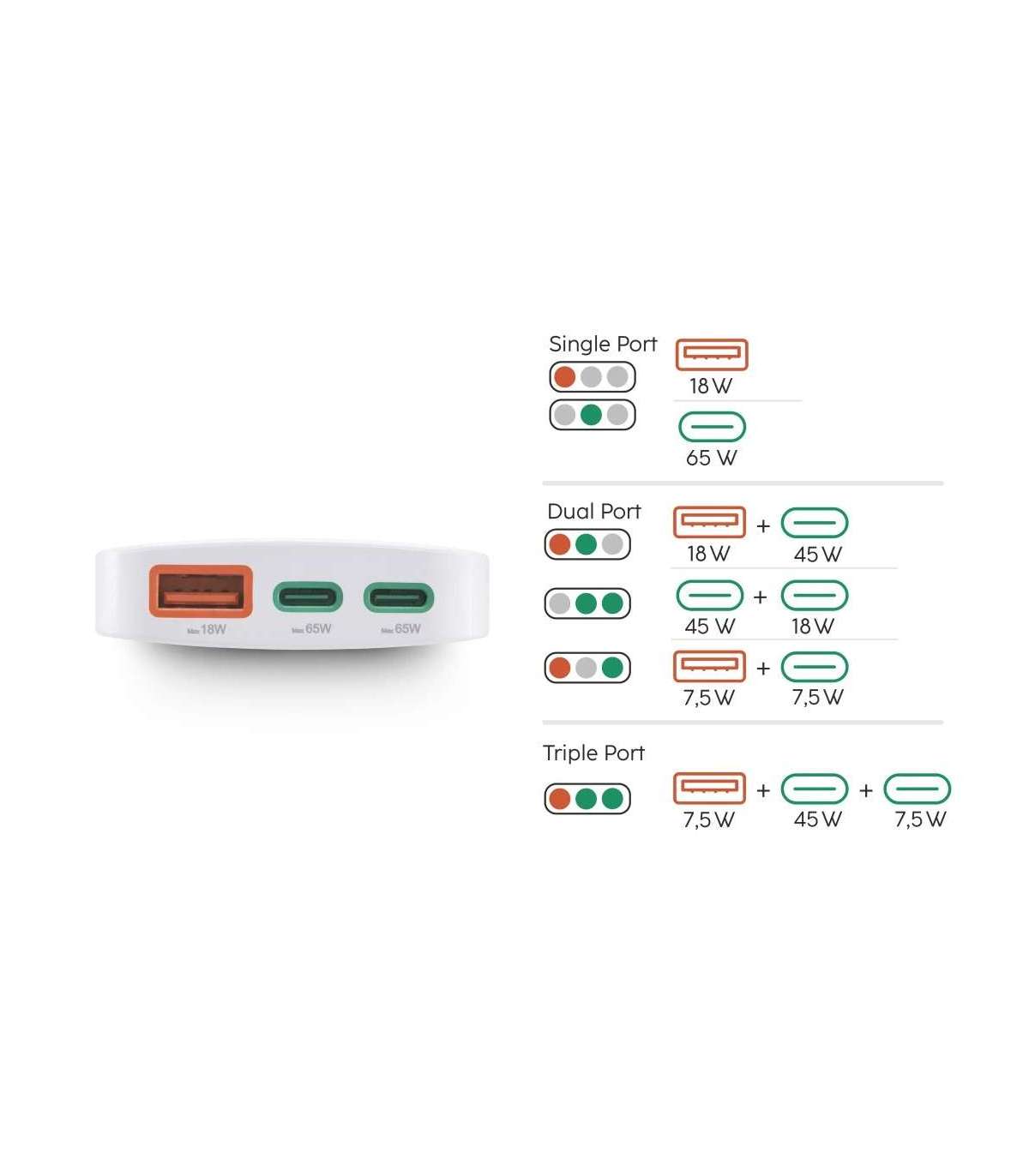 Maksimaalne väljundvõimsus: 65 vatti – universaalne laadija mobiiltelefonide või muude seadmete kiireks laadimiseks USB-A ja USB-C liidese kaudu.