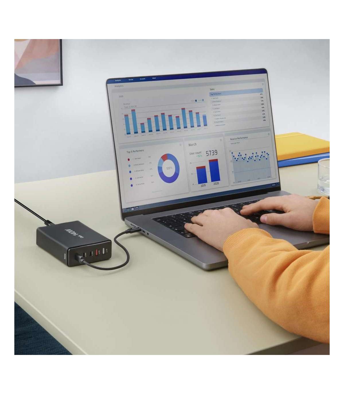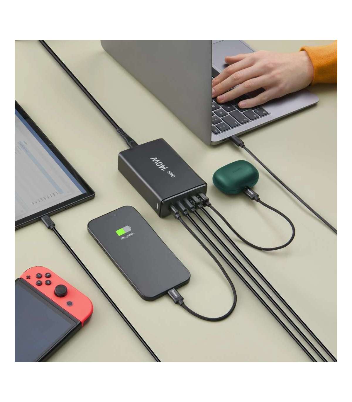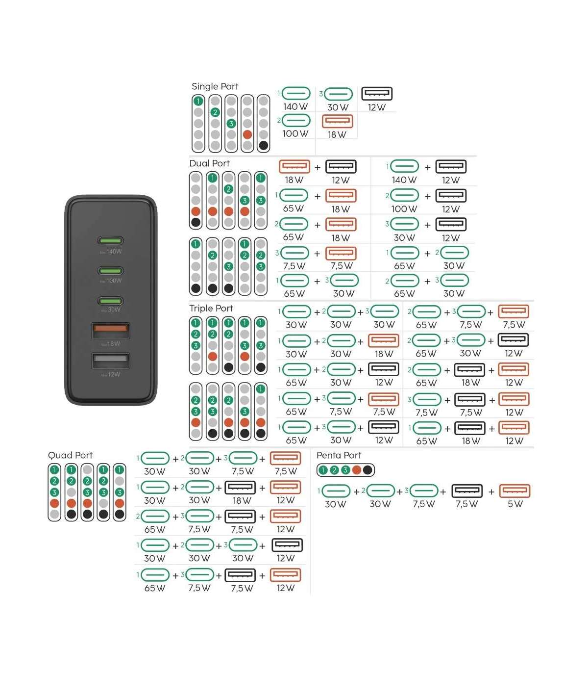 Mitme USB-laadimisjaam viie pordi ja eriti suure jõudlusega: 5-ühes laadimisjaama kolm pesa pakuvad kiirlaadimistehnoloogiat koos Power Deliveryga USB-C kaudu, samas kui kaks USB-A porti toetavad Qualcomm® Quick Charge™ 3.0 – nii saab nutitelefone, sülearvuteid, tahvelarvuteid, kõrvaklappe, nutikellasid, akupakke jne pesa kaudu maksimaalse kiirusega laadida.