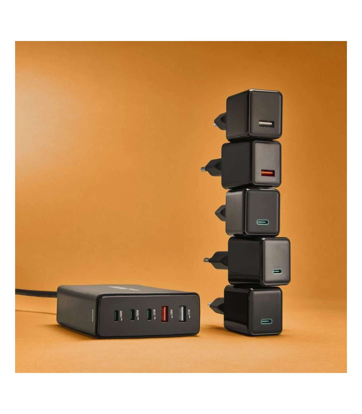 Maksimaalne väljundvõimsus: 140 vatti – universaalne laadija mobiiltelefonide või muude seadmete kiireks laadimiseks USB-A ja USB-C liidese kaudu.