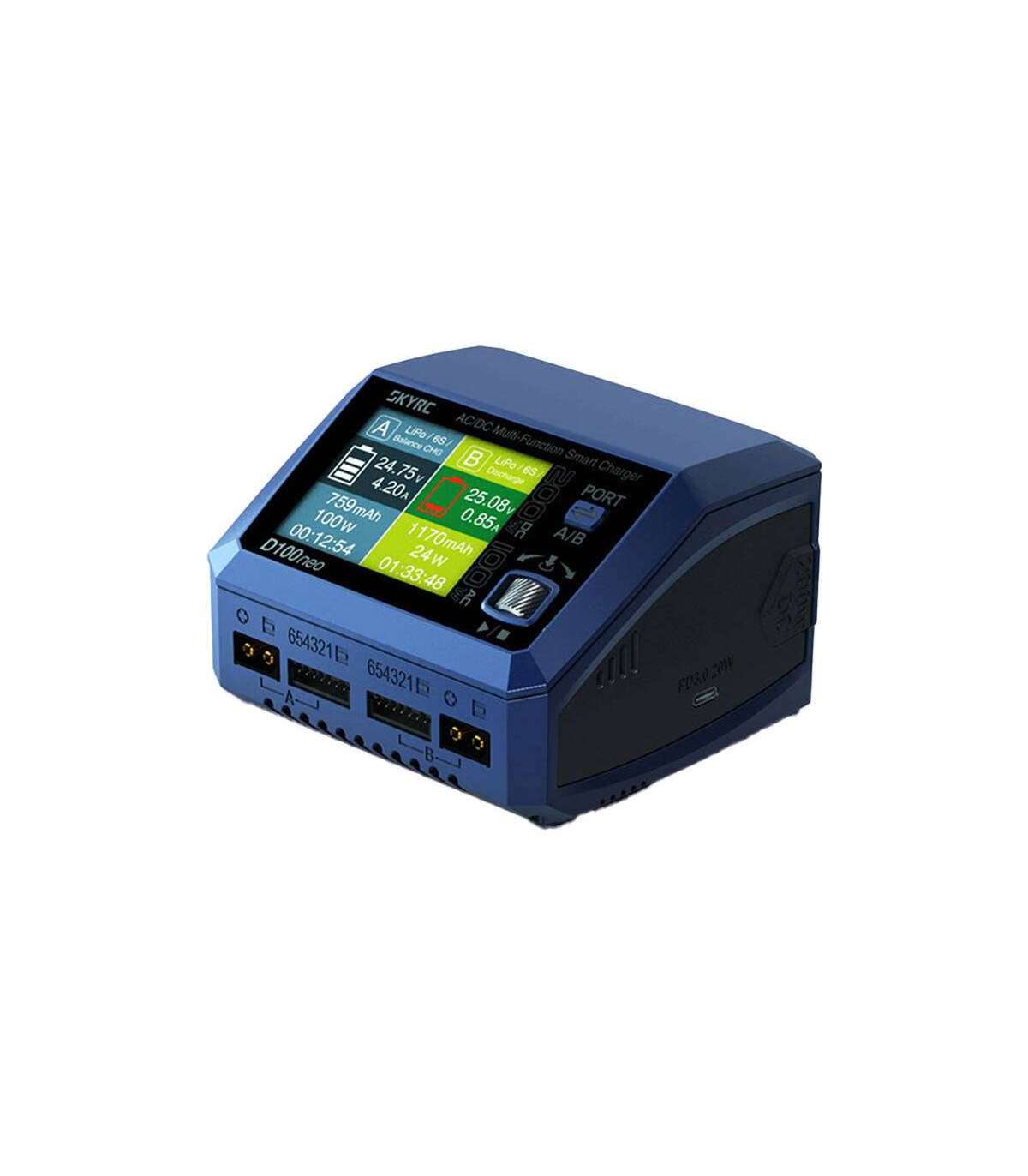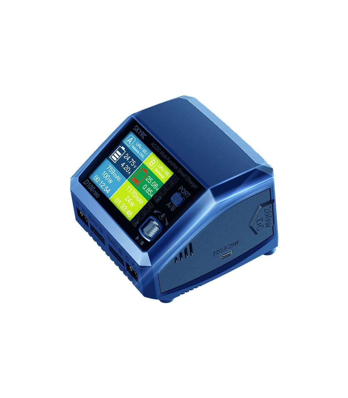 The SkyRC D100neo Charger is equipped with 2 ports, allowing simultaneous charging with a power of 200W when using DC power supply. It supports various types of batteries, including LiPo, LiFe, Li-ion, LiHV, NiMH, and NiCd, and provides voltage balancing function with an accuracy of ±0.02V. The device's performance is also influenced by the high-resolution color display and user-friendly interface, ensuring ease of use. The product is also equipped with a USB-C port with 20W Power Delivery for fast charging. Advanced protective features ensure safe operation.