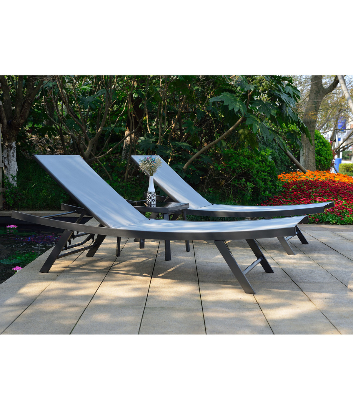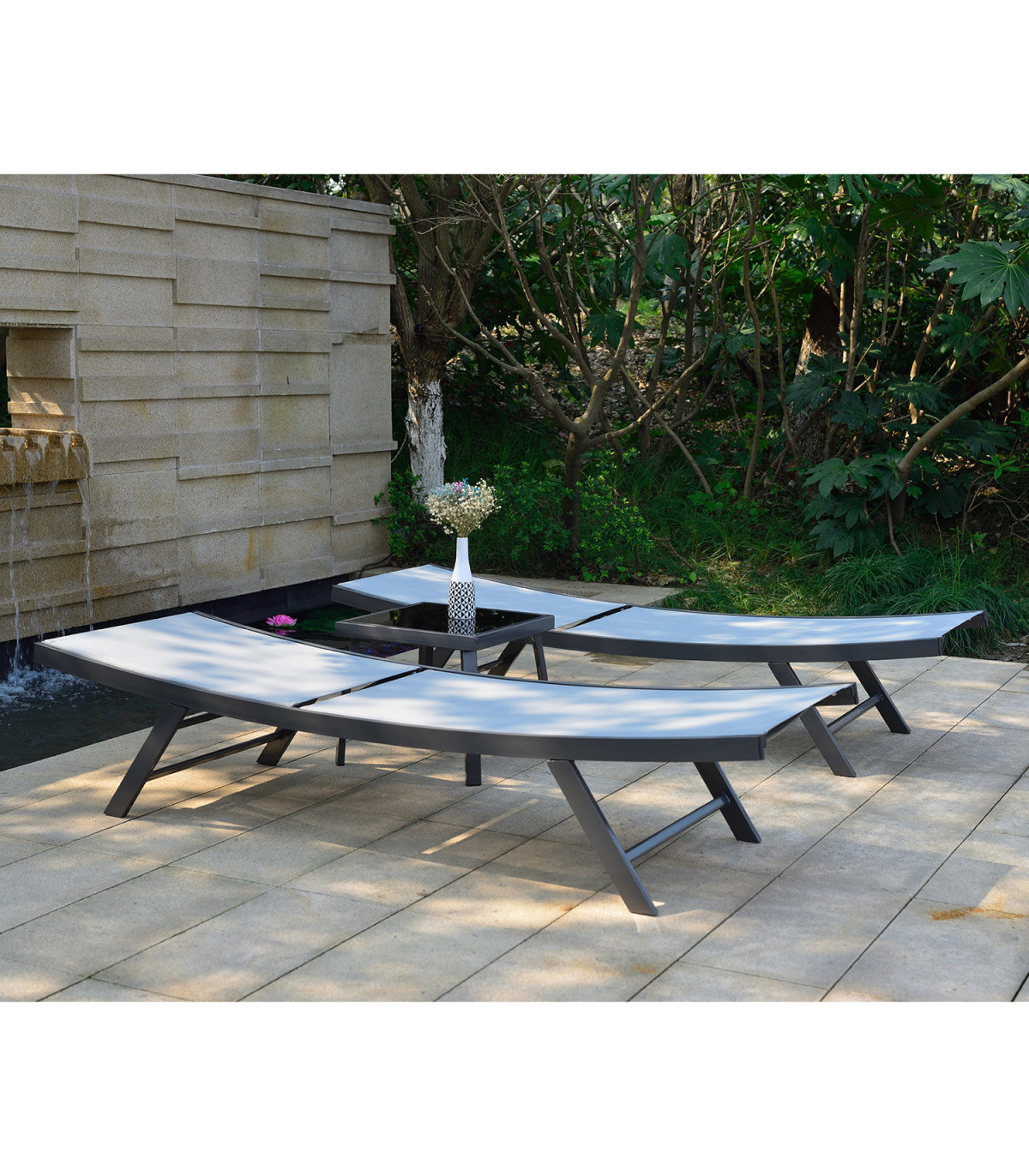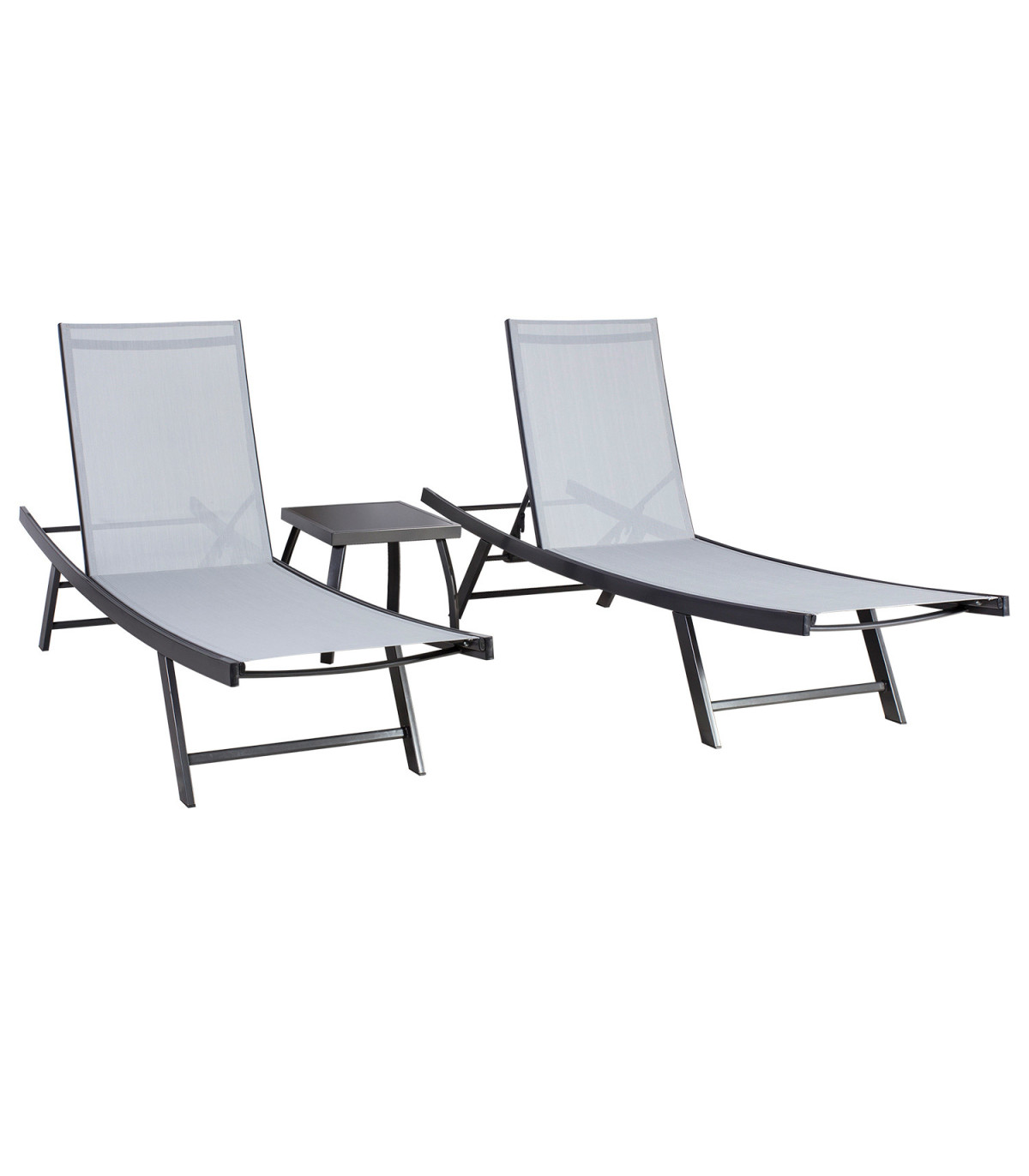 Aiamööblikomplekt ARIO 2 lamamistooli ja laud, hall. Lamamistooli helehall textilene iste laseb hästi õhku läbi, kuivab kiiresti ja seda on lihtne hooldada. Toolide ja laua raamid on valmistatud terasest ja viimistletud halli pulbervärviga. Seljatugi on võimalik panna horisontaalsesse asendisse või valida sobiv kaldenurk 4-positsioonis. Laua mõõdud on 43x43xH40cm, lauaplaat: must karastatud klaas. Lamamistooli mõõdud on 63x187xH40cm. Istmeosa pikkus 111cm, seljatoe pikkus 76cm. Kaalupiirang 100kg. HOIUSTAMINE: suvehooaja lõppedes soovitame aiamööblit hoiustada siseruumides. Puhastage ja kuivatage mööbel enne hoiule panekut. Kasutage hoiustamiseks kuiva ning hea ventilatsiooniga ruumi.