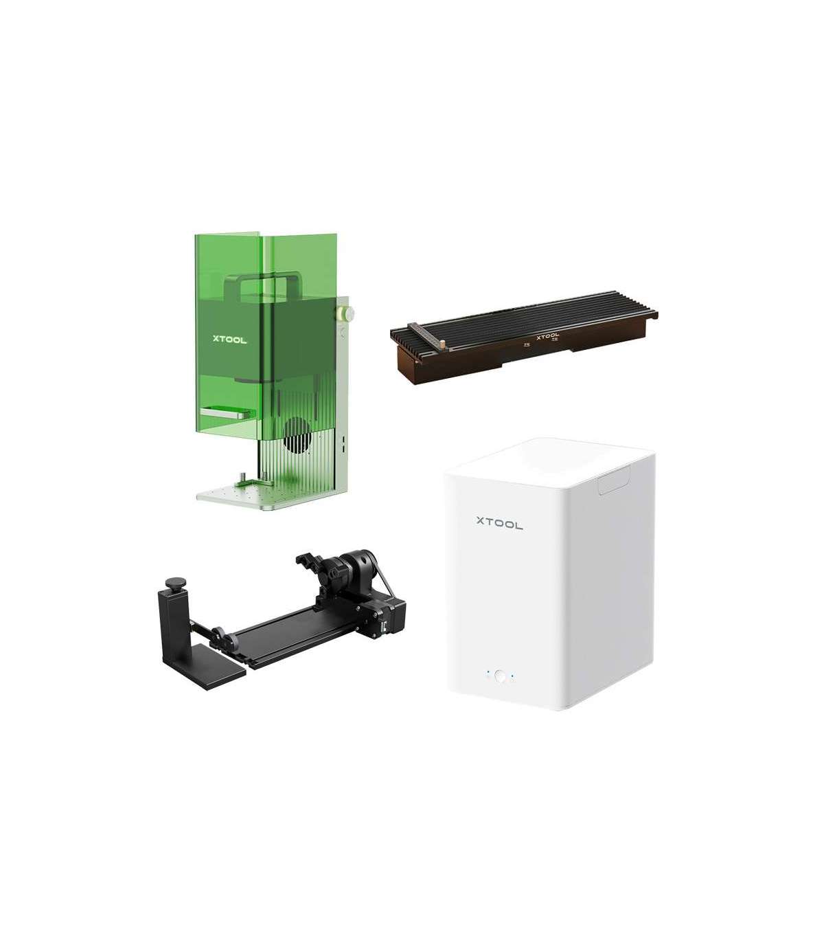 Introducing a comprehensive engraving kit that combines four advanced devices: the xTool F1-Mint Green, the RA2 Pro rotary attachment, the xTool Desktop Smoke Purifier and the xTool Slide Extension mobile base. The kit is the ideal solution for those looking for precision, versatility and cleanliness during their creative engraving work.