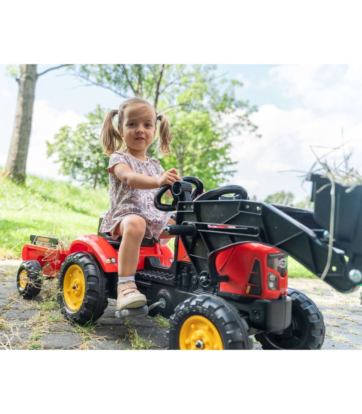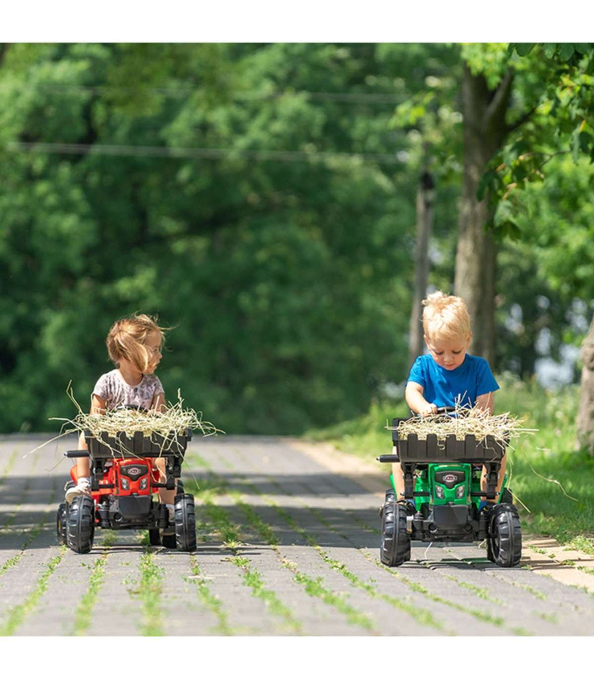 Red Supercharger pedaaltraktor haagisega firmalt Falk on paljude väikeste traktorijuhtide unistus. Hoolikalt valmistatud, pöörates tähelepanu kõige pisemale detailile! Ükski talunik ei põlgaks sellist sõidukit. Sõiduk on valmistatud kõrgeima kvaliteediga plastikust ja mõeldud lastele alates 2. eluaastast. Sõiduk on varustatud esisegiga ja lahtikäiva haagisega paneelidega ning rooliga, millel on sarv. Rataste materjaliks on kõrgekvaliteediline plastik. Traktoril on ka avatav kapott koos päris mootori imitatsiooniga.
