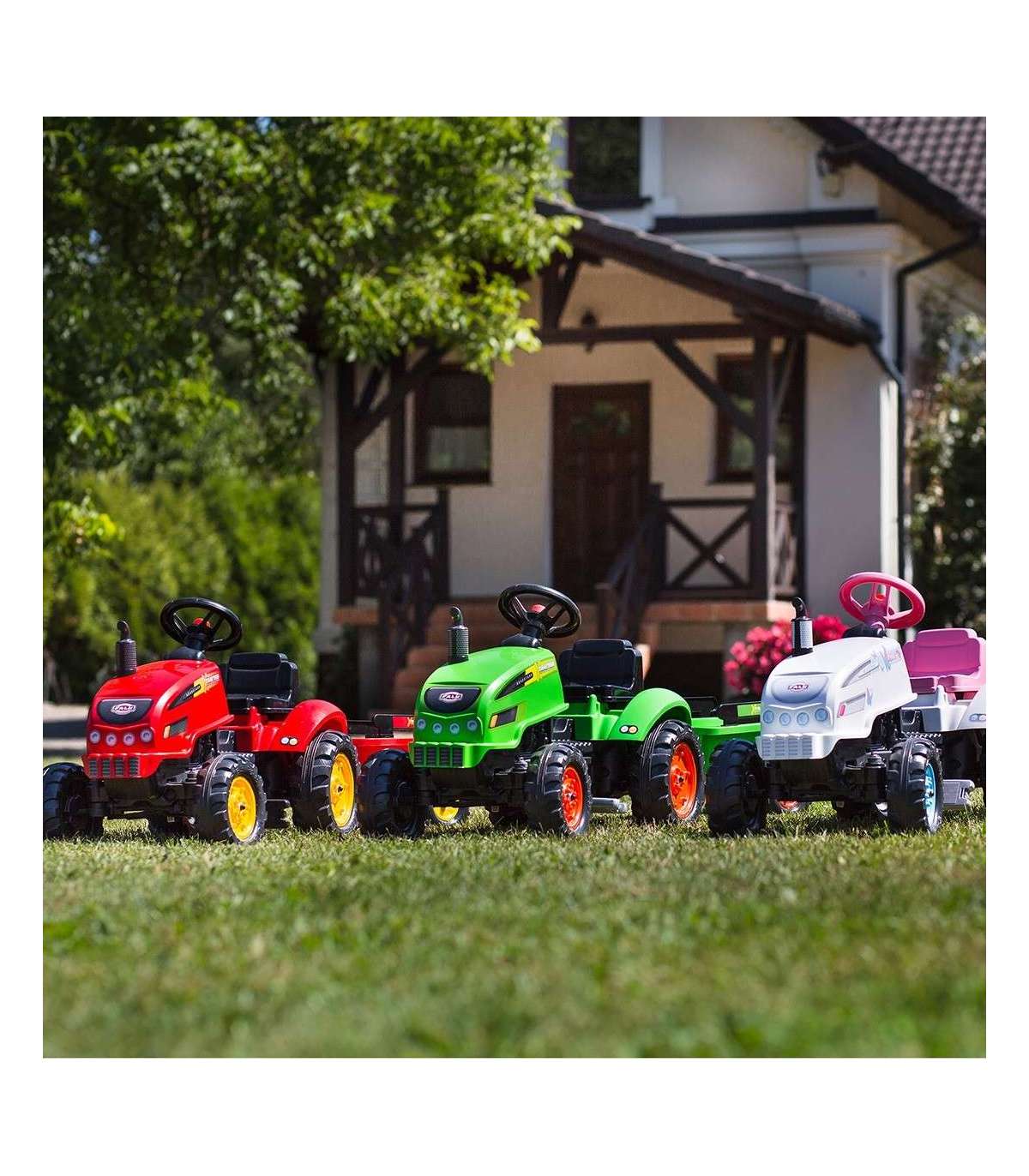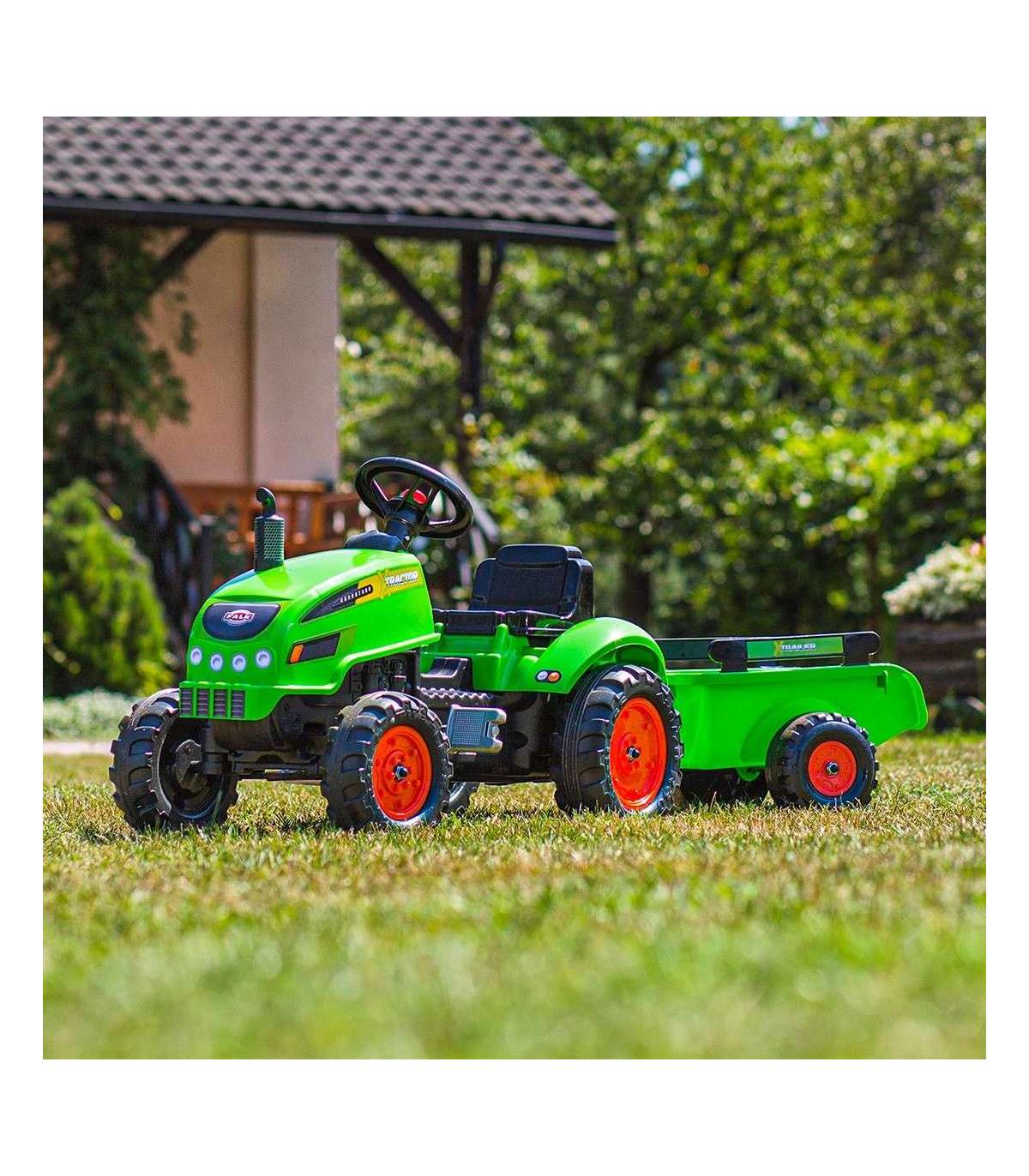 Pedaltraktor haagisega Green Pedal X Tractor on paljude väikeste traktorijuhtide ja ehitajate unistuste täitumine. Hoolikalt valmistatud, pöörates tähelepanu iga väikseima detaili peale! Ükski tõeline talunik ei põlgaks sellist sõidukit. Sõiduk on valmistatud kõrgeima kvaliteediga plastikust ja mõeldud lastele alates 2. eluaastast. Sõiduk on varustatud eemaldatava paneelidega haagise ja rooliga, millel on signaal. Traktori rattad on valmistatud kvaliteetsest plastikust ja ei ole kasutamisel tülikad.