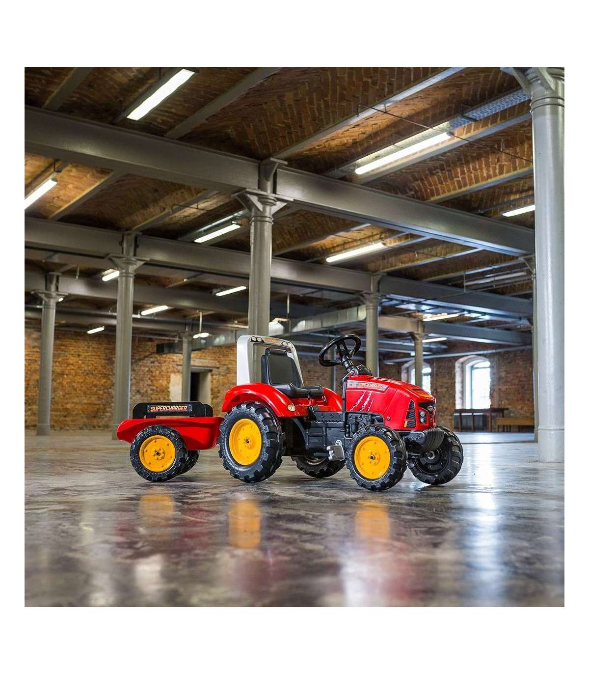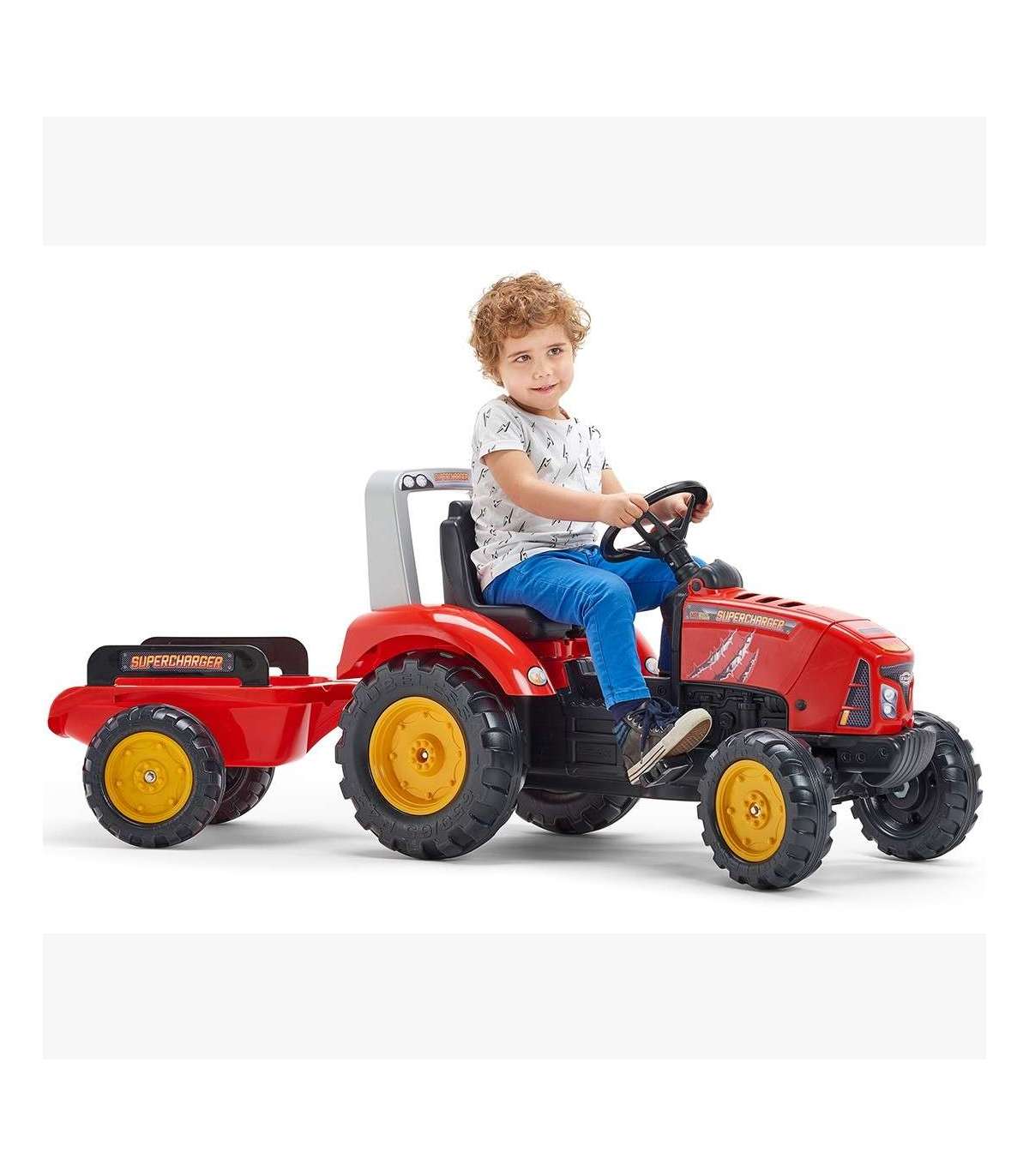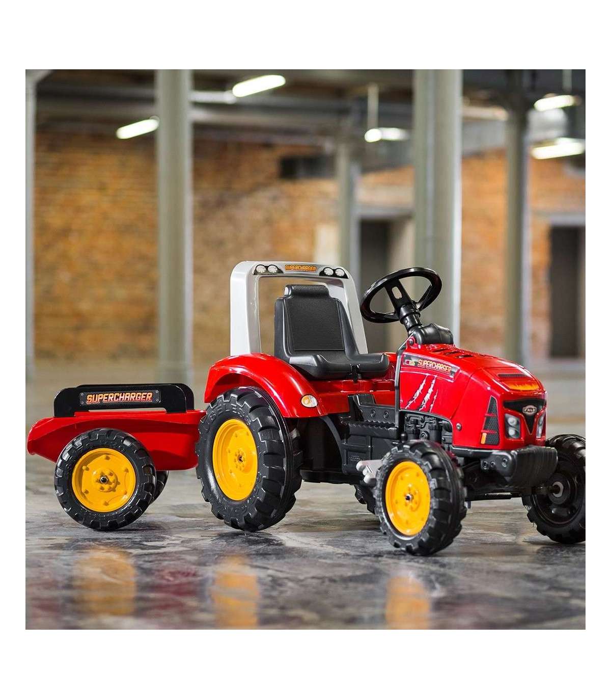 Red Supercharger pedaaltraktor haagisega tootjalt FALK on iga väikese traktorihuvilise unistus. Hoolikalt valmistatud, pöörates tähelepanu kõigele väiksemale detailile! Ükski farmer ei põlgaks sellist. Sõiduk on valmistatud kõrgekvaliteedilisest plastikust ja mõeldud lastele alates 3. eluaastast. Sõiduk on varustatud eemaldatava paneelidega haagise ja rooliga koos klaksoniga. Traktori rattad on valmistatud kõrgekvaliteedilisest plastikust. Traktoril on ka avatav kapott, mis imiteerib tõelist mootorit.