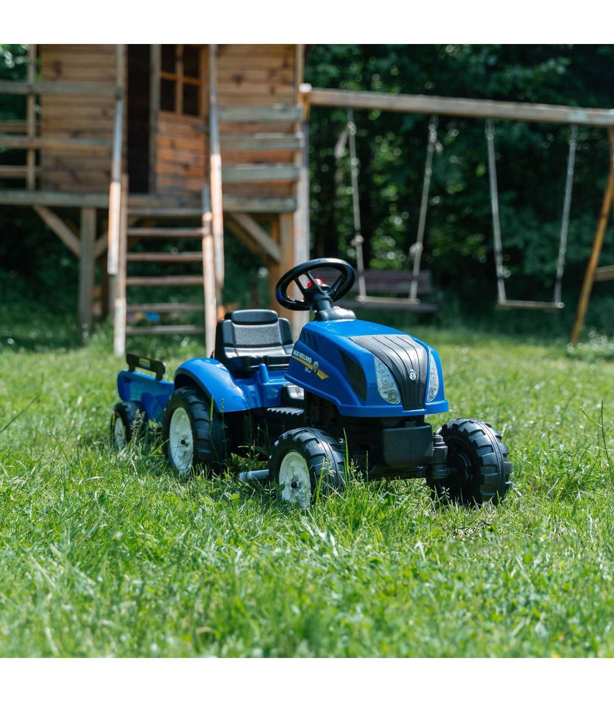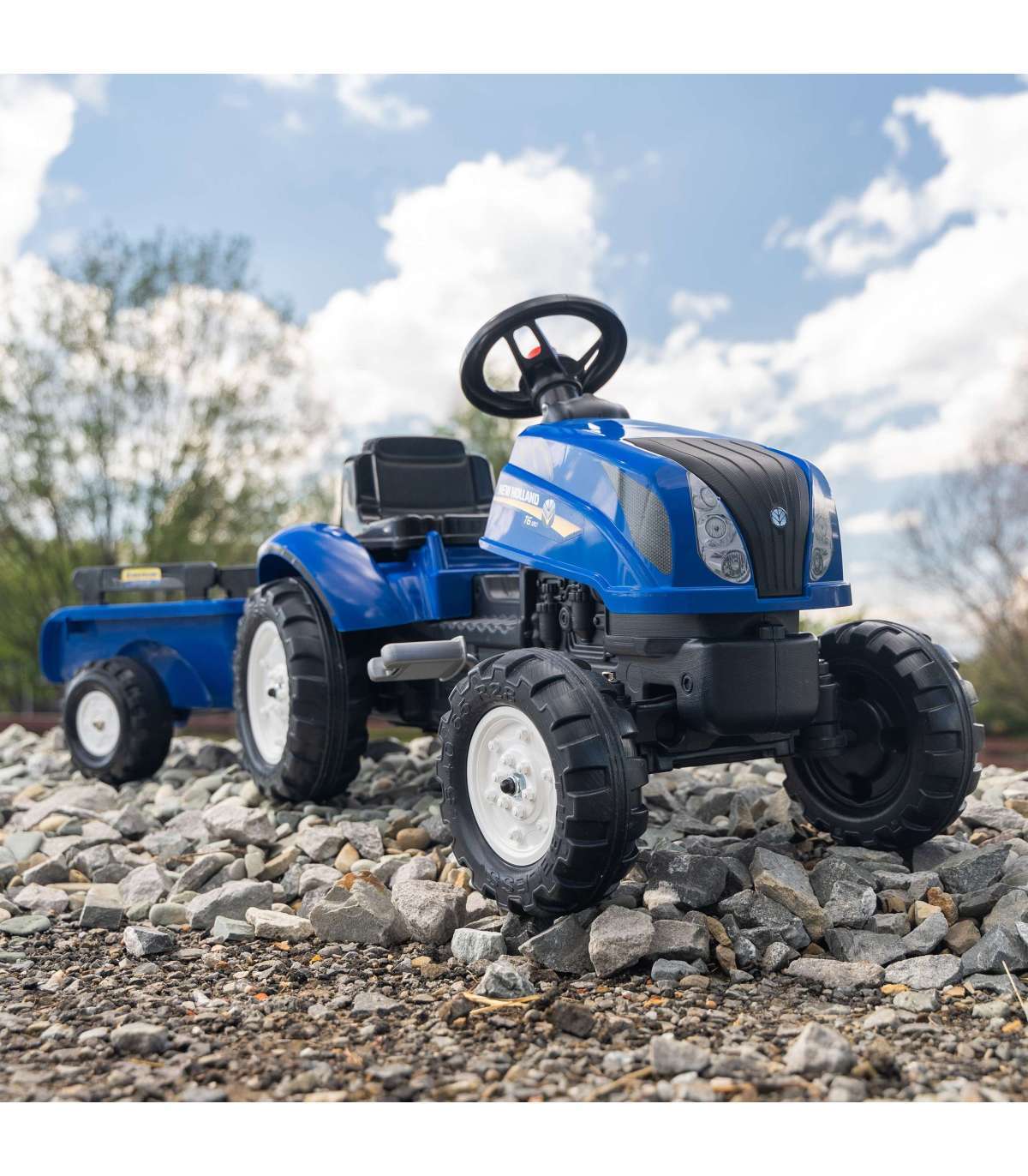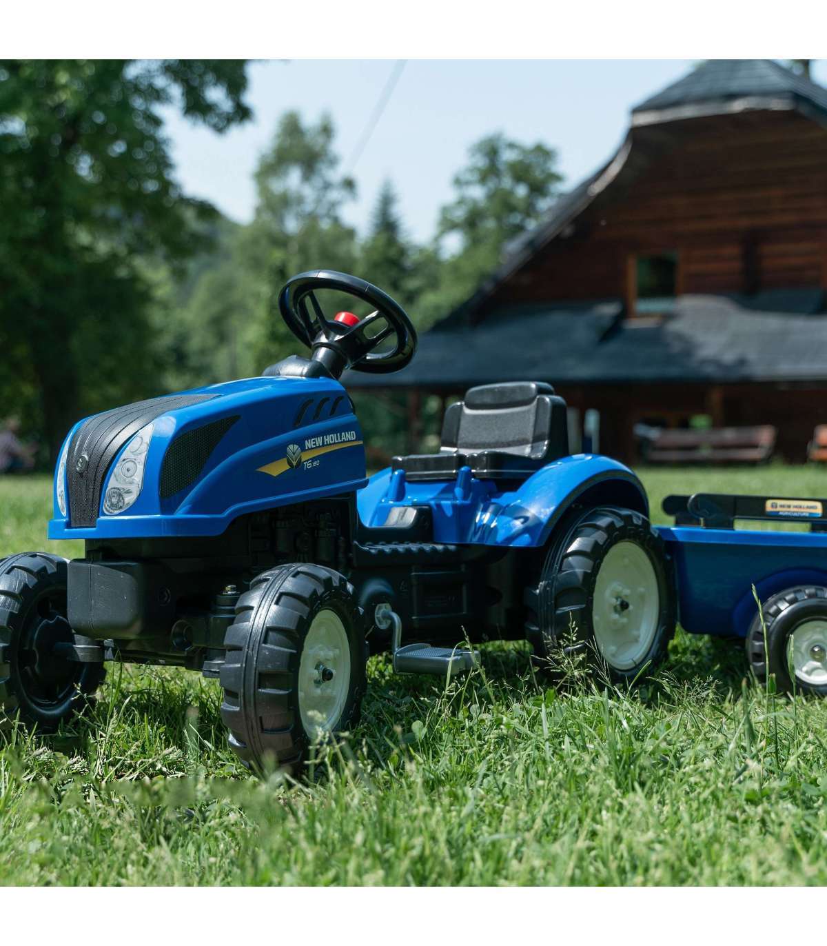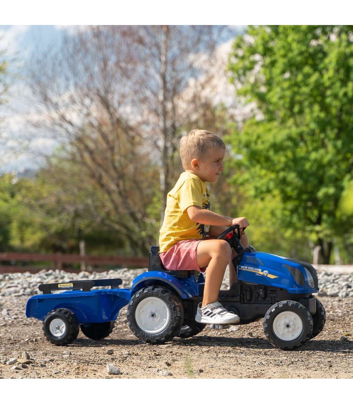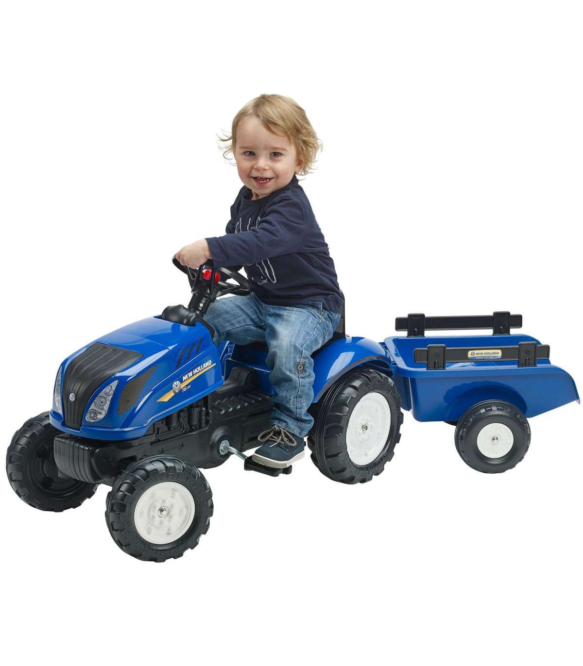 New Holland pedaaltraktor haagisega, tootja FALK on paljude pisikeste traktoristide unistuste täitumine. Hoolikalt valmistatud, pöörates tähelepanu kõige väiksemale detailile! Ühtki farmerit see ei häbistaks. Sõiduk on valmistatud kõrgeima kvaliteediga plastikust. Mõeldud lastele alates 2. eluaastast. Sõiduk on varustatud lahtivõetava haagise paneelidega ja rooliga, millel on signaal. Traktori rattad on valmistatud kõrge kvaliteediga plastikust. Tootel on avamisega kapott koos tõetruu mootori imitatsiooniga.
