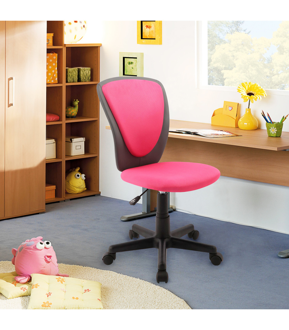 Lastetool BIANCA roosa/tumehall. Iste on kaetud roosa polüestervõrkkangaga. Seljatugi on kaetud polüestervõrkkanga ja kunstnahaga, mis on roosat ja tumehalli värvi. Tooli raami värvus on must. Istme kõrgus on reguleeritav gaasamordi abil. Jalarist on musta värvi ning plastikust, R27cm. Toolil on plastikrattad, tihvt: 11mm. Tooli kõrgus on 82-94cm, istme kõrgus 37-49cm. Toote mõõdud on 42x51xH82-94cm. Tooli kaalupiirang on 100kg.