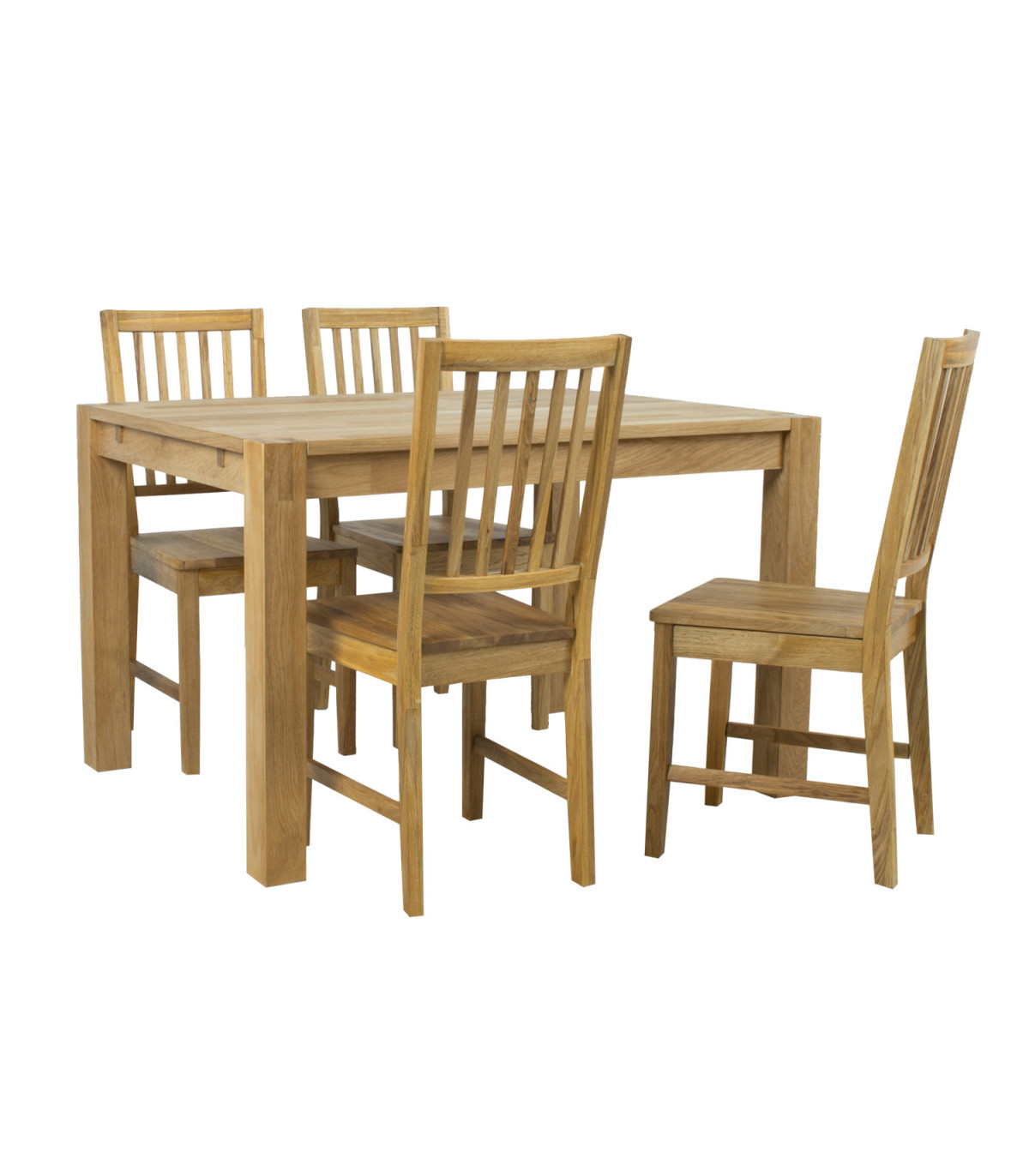 Söögilauakomplekt CHICAGO NEW laud ja 4 tooli. Laua mõõdud on 120x90xH76cm. Lauaplaat: MDF naturaalse tammespooniga. Lauajalad (8x8cm) ja raam on valmistatud täispuidust ja kaetud naturaalse tammespooniga. Laud on viimistletud puiduõliga. Tooli mõõdud on 43x42xH94cm. Tool on valmistatud täistammepuidust ja viimistletud puiduõliga. Kaalupiirang 120kg. Lauale on võimalik juurde osta pikendus 45x90cm koodiga 84026. Pikendus on võimalik paigaldada laua mõlemasse otsa. HOOLDUS: naturaalse spooniga kaetud lauaplaat on väga tundlik niiskuskahjustuste ja temperatuuri suhtes. Kasutage alati lauanõude all alusmatte ja kuumaaluseid. Igasugune lauale sattunud vedelik tuleb koheselt kuivatada pehme lapiga. Vältige liigset hõõrumist ja abrasiivseid puhastusvahendeid.