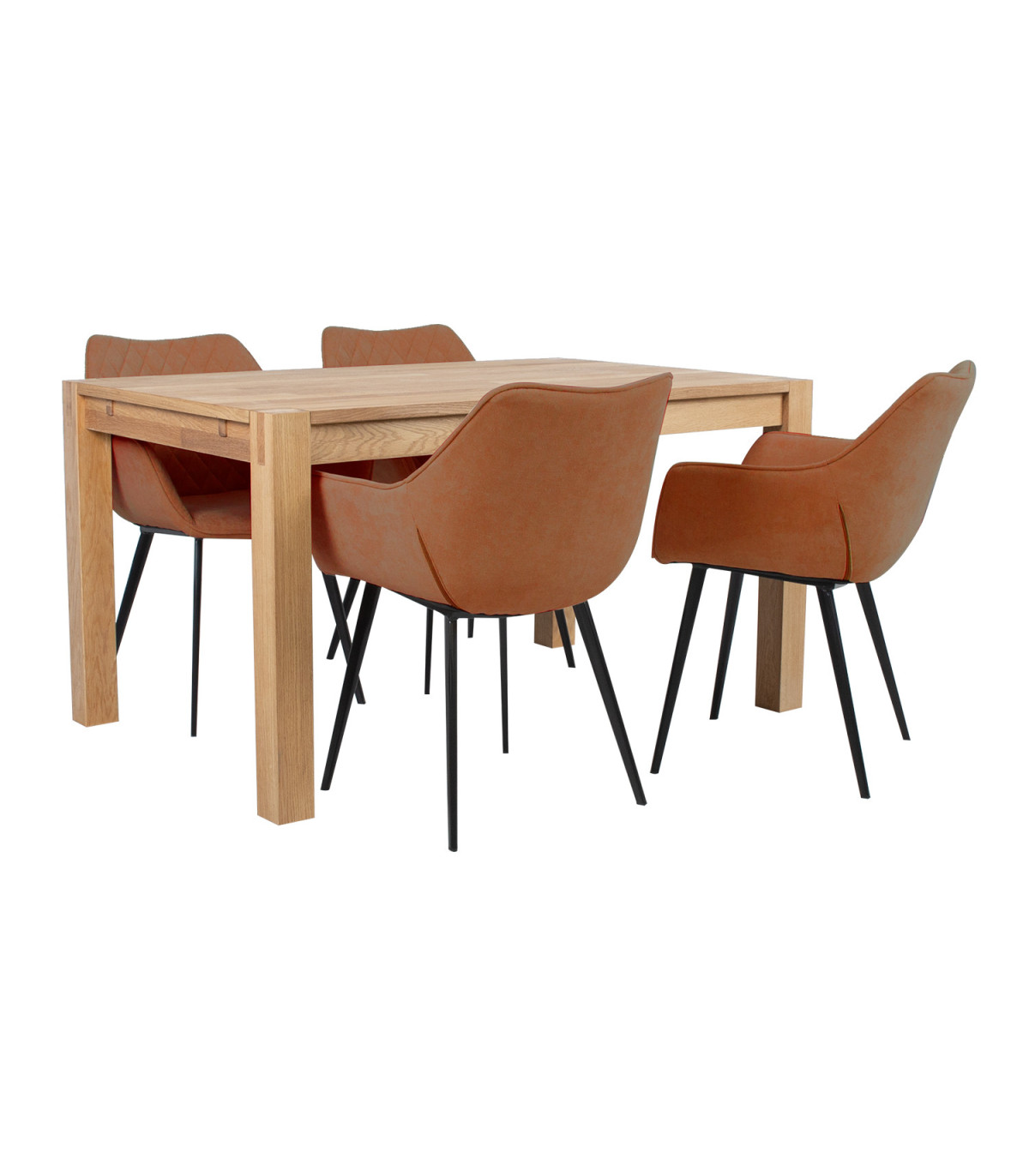Söögilauakomplekt CHICAGO NEW 4-tooliga. Laua mõõdud on 140x90xH76cm. Lauaplaat: MDF naturaalse tammespooniga, õlitatud. 8x8cm lauajalad on valmistatud täispuidust ja kaetud tammespooniga. Söögilauda on võimalik pikendada. Laua pikendused 45x90cm saab lisada mõlemale poole laua otstesse. Laua pikendused ei kuulu komplekti vaid on võimalik eraldi juurde osta, tootekood 84026. Tooli mõõdud on 61x60,5xH84cm. Tooli iste on kergelt polsterdatud ja kaetud helepruuni kunstnahaga. Jalad on valmistatud metallist ja viimistletud musta pulbervärviga. Kaalupiirang 100kg.