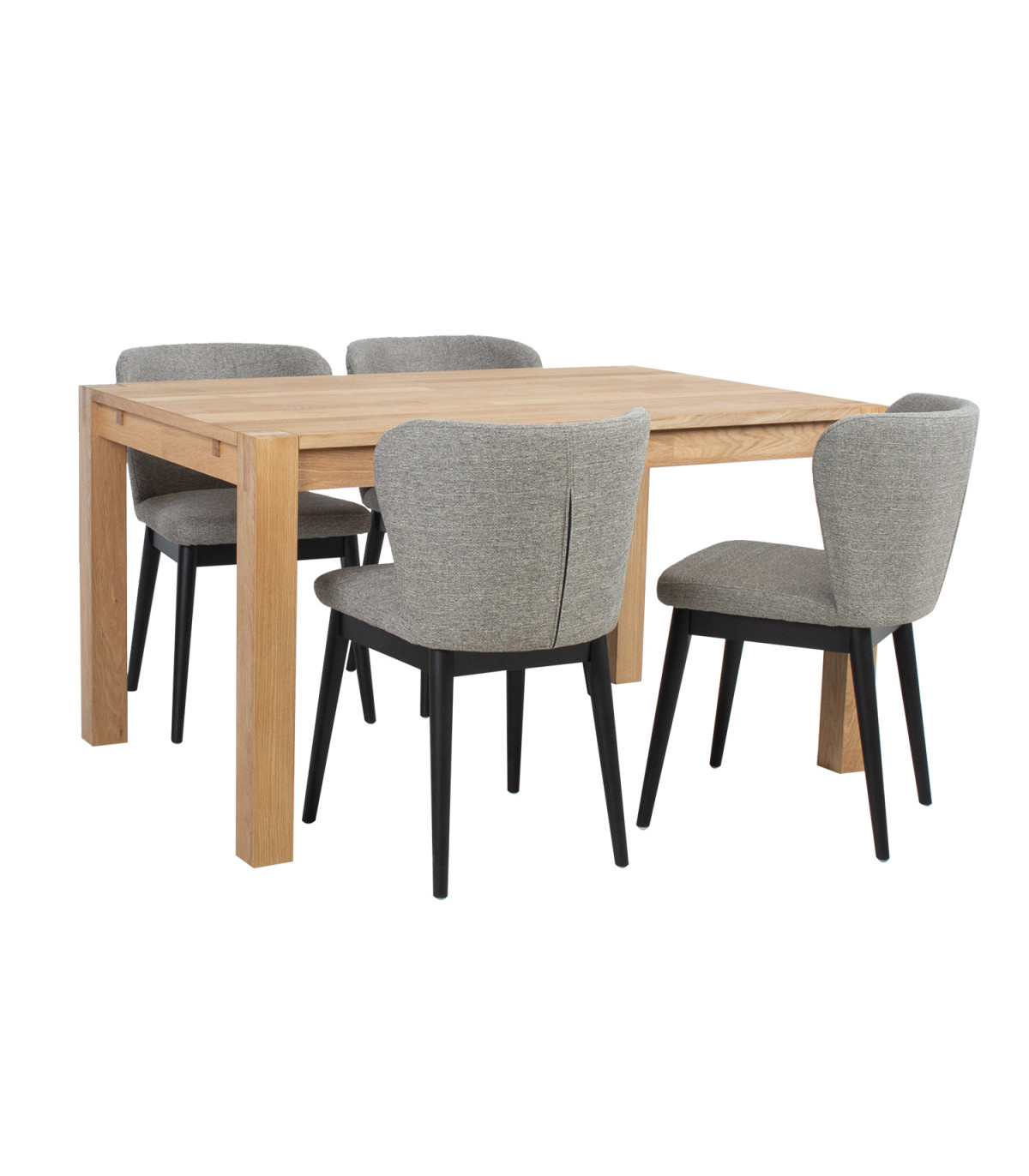 Söögilauakomplekt CHICAGO NEW 4-tooliga. Laua mõõdud on 140x90xH76cm. Lauaplaat: MDF kaetud naturaalse tammespooniga. Lauajalad (8x8cm) ja raam on valmistatud täispuidust ja kaetud naturaalse tammespooniga. Laud on viimistletud puiduõliga. Tooli mõõdud on 53,5x54xH81,5cm. Tooli iste ja seljatugi on polsterdatud ja kaetud halli polüesterkangaga. Tooli jalad ja alusraam on valmistatud täispuidust ja viimistletud musta värviga. Kaalupiirang 100kg. Lauale on võimalik juurde osta pikendus 45x90cm, koodiga 84026. Pikendus on võimalik paigaldada laua mõlemasse otsa. HOOLDUS: naturaalse spooniga kaetud lauaplaat on väga tundlik niiskuskahjustuste ja temperatuuri suhtes. Kasutage alati lauanõude all alusmatte ja kuumaaluseid. Igasugune lauale sattunud vedelik tuleb koheselt kuivatada pehme lapiga. Vältige liigset hõõrumist ja abrasiivseid puhastusvahendeid.