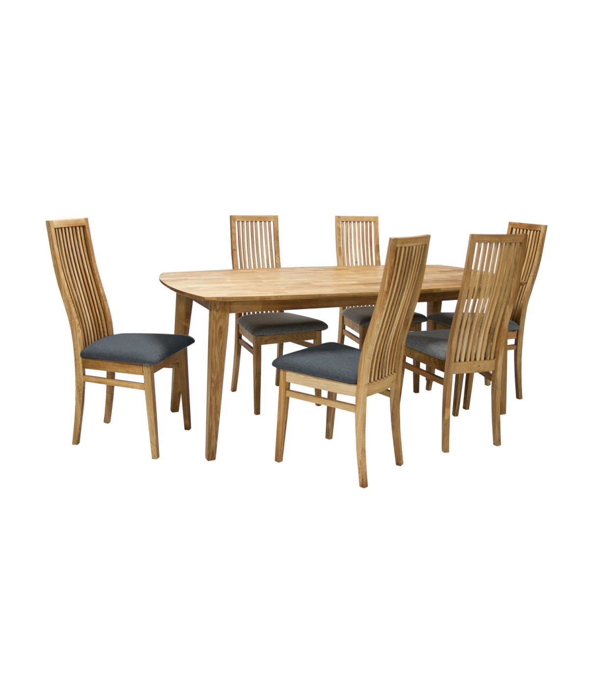 Söögilauakomplekt RETRO laud ja 6 tooli. Laua mõõdud on 90x190xH75cm. Laud on valmistatud täistammepuidust ja õlitatud. Lauale on võimalik juurde osta pikendus 50x76cm koodiga 19922. Pikendus on võimalik paigaldada laua mõlemasse otsa. Tooli mõõdud on 46x56xH103cm, istme kõrgus 47cm. Tooli jalad ja raam on valmistatud täistammepuidust ja õlitatud. Polsterdatud iste on kaetud halli polüesterkangaga. Kaalupiirang 100kg.
