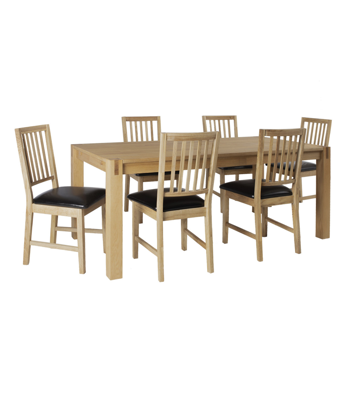 Söögilauakomplekt CHICAGO NEW 6-tooliga. Laua mõõdud on 180x90xH76cm. Lauaplaat: MDF naturaalse tamme spooniga. Lauajalad (8x8cm) ja raam on valmistatud täispuidust ja kaetud naturaalse tammespooniga. Laud on viimistletud puiduõliga. Tooli mõõdud on 43x42xH94cm. Tooli iste on kergelt polsterdatud ja kaetud musta kunstnahaga. Tooli jalad ja raam on valmistatud täistammepuidust ja viimistletud puiduõliga. Kaalupiirang 120kg. Lauale on võimalik juurde osta pikendus 45x90cm koodiga 84026. Pikendus on võimalik paigaldada laua mõlemasse otsa. HOOLDUS: naturaalse spooniga kaetud lauaplaat on väga tundlik niiskuskahjustuste ja temperatuuri suhtes. Kasutage alati lauanõude all alusmatte ja kuumaaluseid. Igasugune lauale sattunud vedelik tuleb koheselt kuivatada pehme lapiga. Vältige liigset hõõrumist ja abrasiivseid puhastusvahendeid.