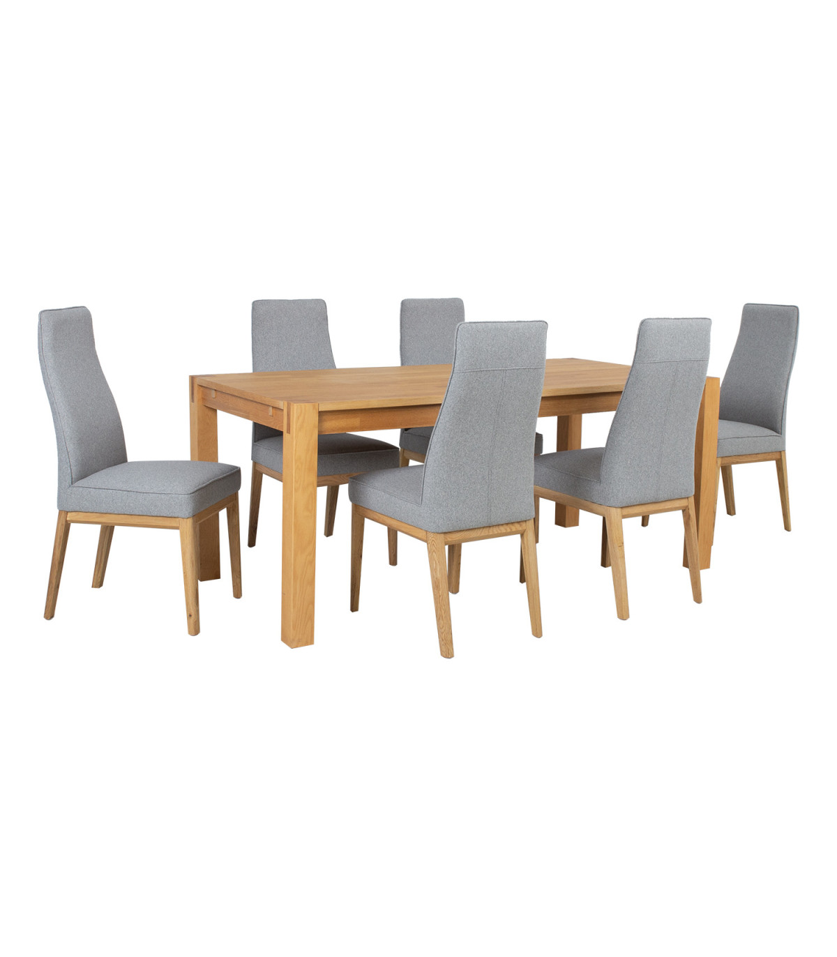Söögilauakomplekt CHICAGO NEW 6-tooliga. Laua mõõdud on 180x90xH76cm. Lauaplaat: MDF naturaalse tamme spooniga. Lauajalad (8x8cm) ja raam on valmistatud täispuidust ja kaetud naturaalse tammespooniga. Laud on viimistletud puiduõliga. Tooli mõõdud on 46x58,5xH102cm. Tooli iste ja seljatugi on polsterdatud ja kaetud polüesterkangaga. Jalad ja alusraam on valmistatud tammepuidust. Istme kõrgus 48cm. Kaalupiirang 100kg. Lauale on võimalik juurde osta pikendus 45x90cm koodiga 84026. Pikendus on võimalik paigaldada laua mõlemasse otsa. HOOLDUS: naturaalse spooniga kaetud lauaplaat on väga tundlik niiskuskahjustuste ja temperatuuri suhtes. Kasutage alati lauanõude all alusmatte ja kuumaaluseid. Igasugune lauale sattunud vedelik tuleb koheselt kuivatada pehme lapiga. Vältige liigset hõõrumist ja abrasiivseid puhastusvahendeid.