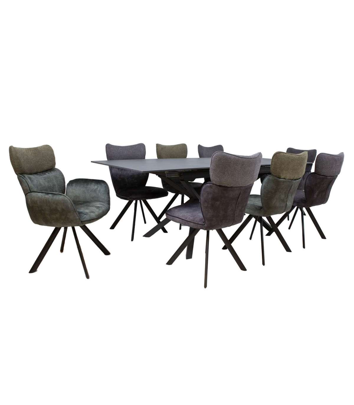 Söögilauakomplekt EDDY 8-tooliga. Komplekti kuulub halli kiviplaadiga pikendatav söögilaud ja 2+6 tooli. Laua mõõdud 160/220x90xH76cm. Laud on keskelt pikendatav. Lauaplaadi pooled liiguvad metallsiinidel, pikendusosa on paigutatud lauaplaadi alla. Paagutatud kivist (sintered stone) lauaplaadi valmistamisel on kasutatud uuenduslikku tehnoloogiat, mis jäljendab loodusliku kivi moodustumise protsessi sügaval maakoores. Kaoliini ehk portselansavi osakesed töödeldakse 1200 kraadises kuumuses, mille tulemusena moodustub materjal, mis oma omadustel ja välimuselt sarnaneb naturaalse kiviga. Lauaplaat on küll õhuke, kuid väga tugev, kulumiskindel, talub hästi kõrget temperatuuri, ei ima plekke ja seda on väga lihtne puhastada ja hooldada. Kuna keemilisi sideaineid ei ole kasutatud on materjal hügieeniline. TÄHELEPANU! Vältige lööke, põrutusi ja kukkumist. Lauaplaadi paksus on 12mm. Laual on mustad pulbervärvitud metalljalad. Tool EDDY käetugedega 63x55xH89cm, ilma käetugedeta 49x55xH89cm. Kattematerjal: roheline samet. Toolide istmekõrgus 48cm, istme laius 45/49cm, istme sügavus 42cm, seljatoe kõrgus 47cm, käetoe kõrgus maast 64cm. Toolide mugava vormiga iste on kergelt polsterdatud ja kaetud polüesterkangaga. Kasutatud on toon-toonis, kuid erineva pinna struktuuriga kangaid. Pulbervärvitud mustad metallist jalad. Kaalupiirang 120kg.