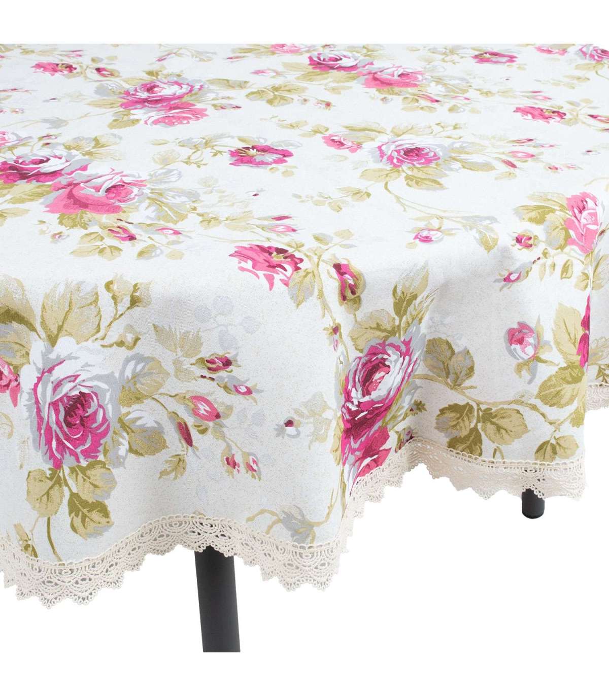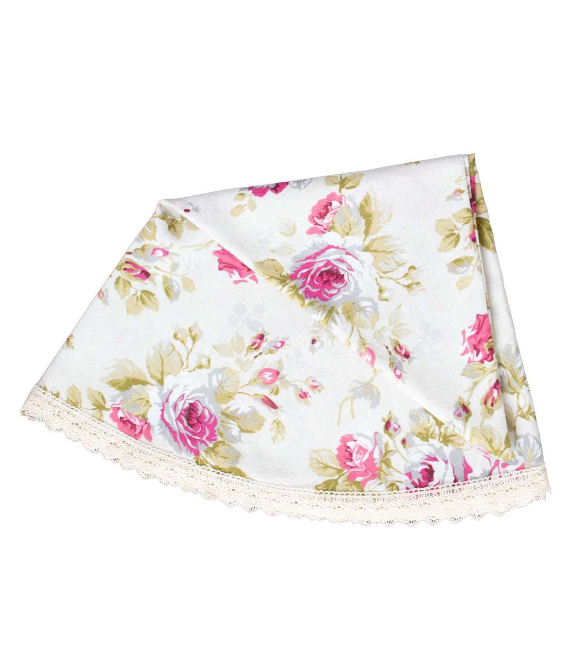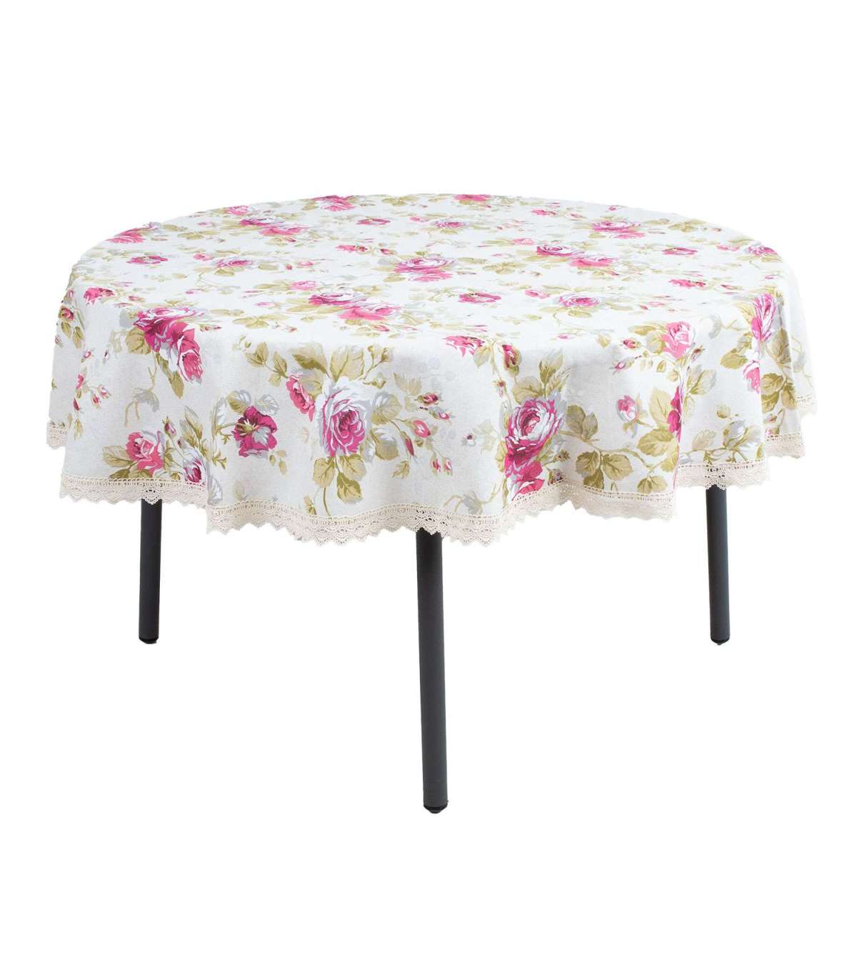 Laudlina LONETA pitsiga, D170cm, roosid. 50% polüester, 50% puuvill, kangas 422. HOOLDUS: võib pesta temperatuuril 30 kraadi pesumasinas.