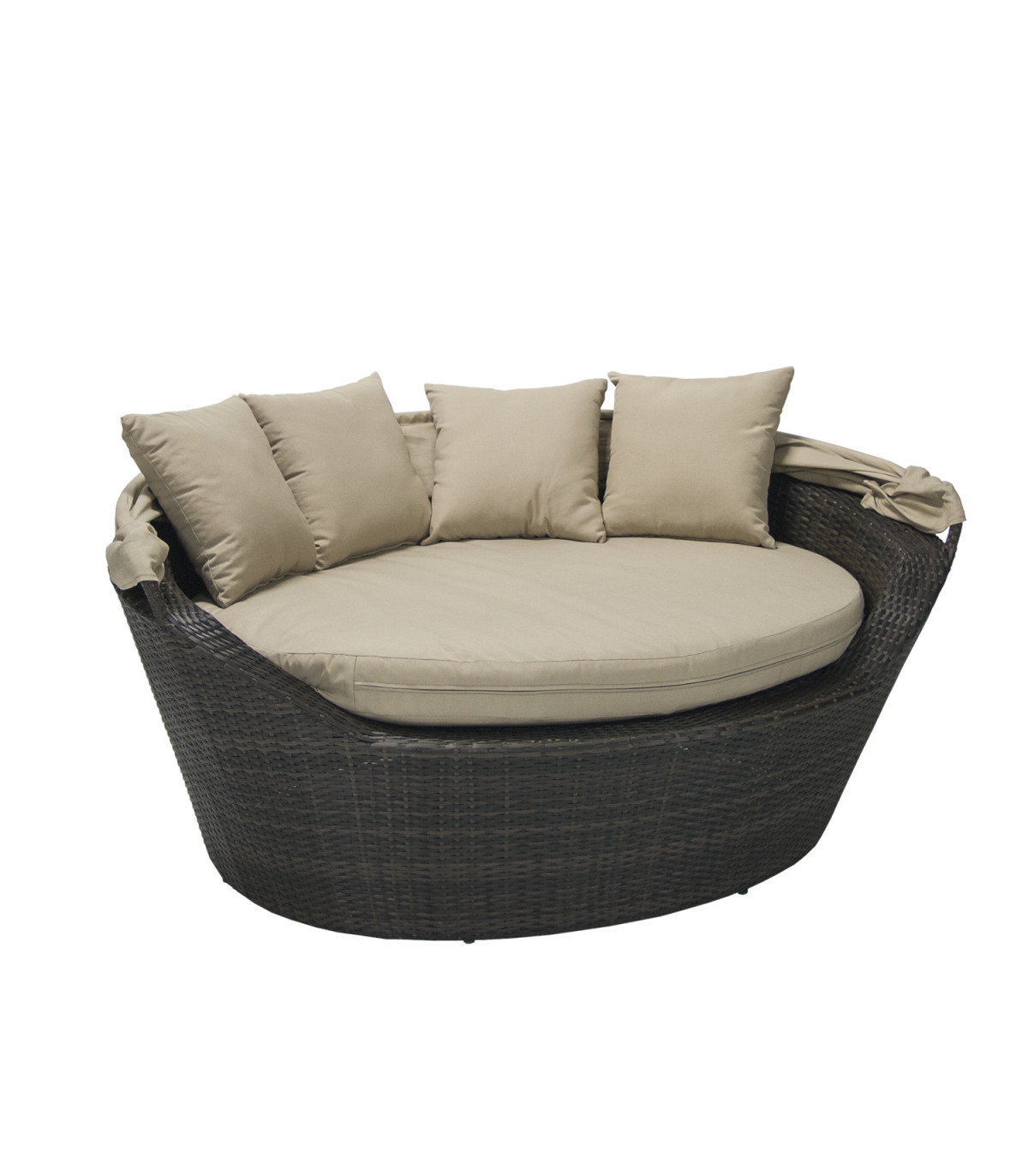 Diivan MINI MUSE 160x130xH70cm, tumepruun/bee˛. Varikatuse ja pehmete patjadega diivan sobib hästi nii koduaeda kui terrassile. Ümara vormiga diivani alumiiniumraam on kaetud plastikpunutisega. Varikatus ja padjakatted on valmistatud polüesterkangast. Välitingimustes kasutatava mööbli eluea pikendamiseks soovitame kasutada välimööbli katteid. HOIUSTAMINE: suvehooaja lõppedes soovitame aiamööblit hoiustada siseruumides. Puhastage ja kuivatage mööbel enne hoiule panekut. Kasutage hoiustamiseks kuiva ning hea ventilatsiooniga ruumi.