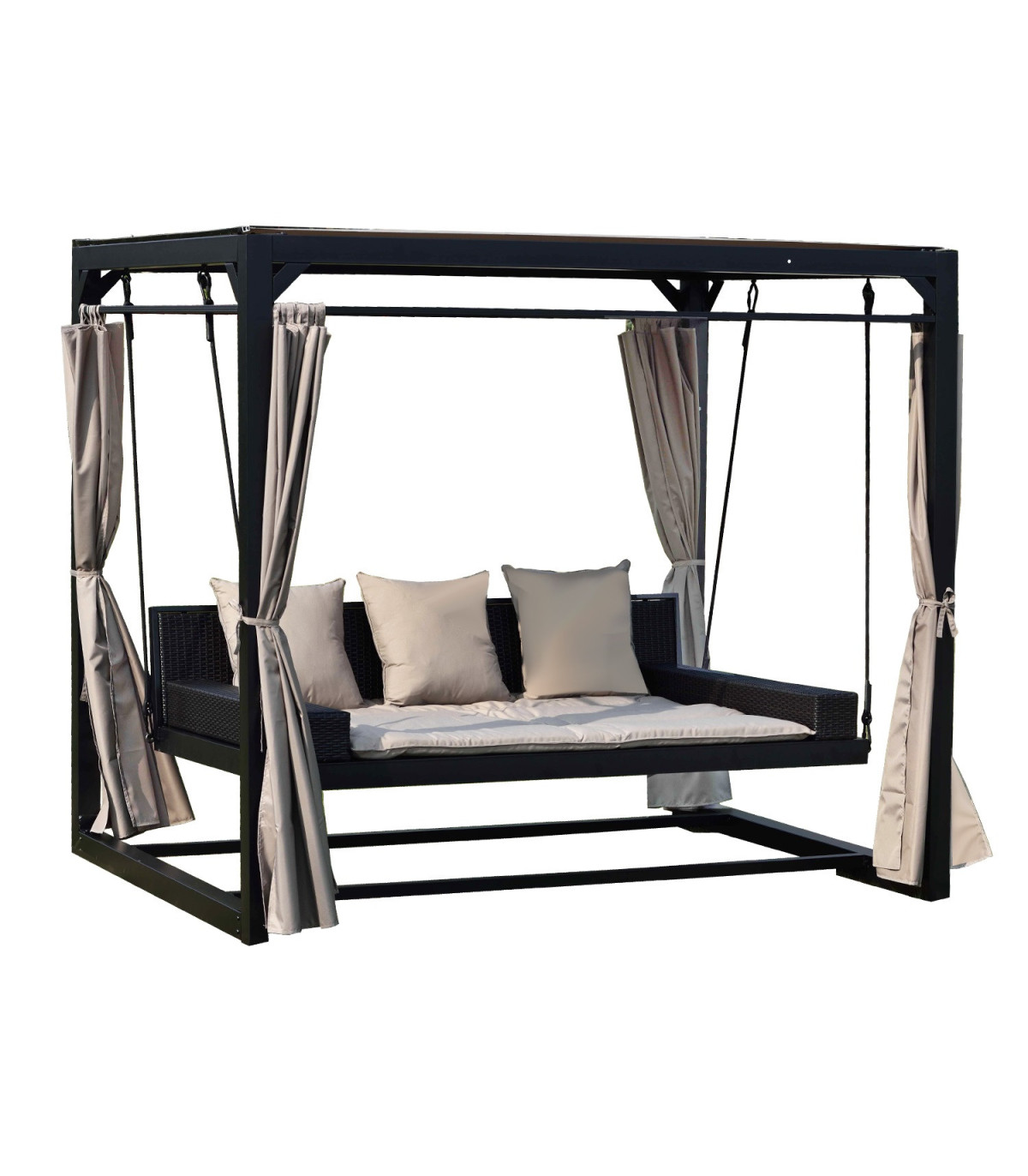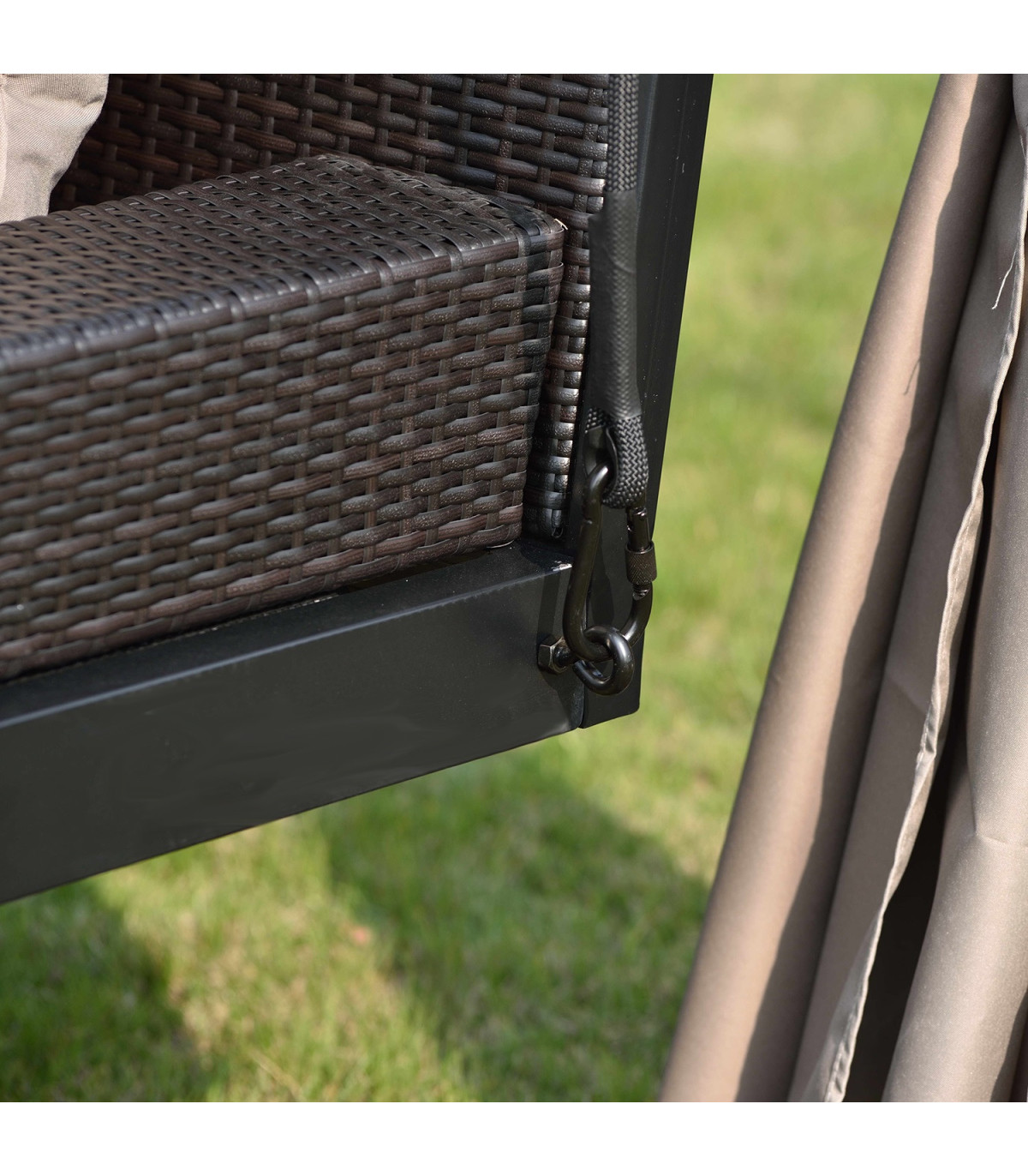 Kiige tugev põhikonstruktsioon on valmistatud terasest ja viimistletud tumepruuni pulbervärviga.