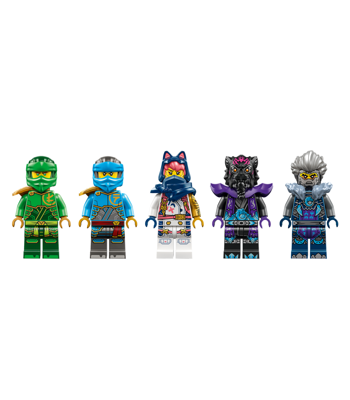 • 5 LEGO® NINJAGO® minifiguuri – lapsed saavad mängida lahinguid minikatana elementidega relvastatud ninjasõdalaste Lloydi, Sora ja Nyaga, kes on vastamisi haamriga Lord Rasiga ja mõõgaga Cinderiga