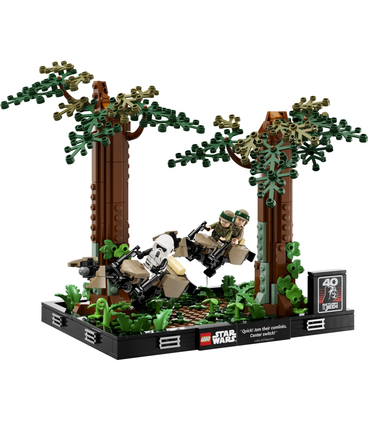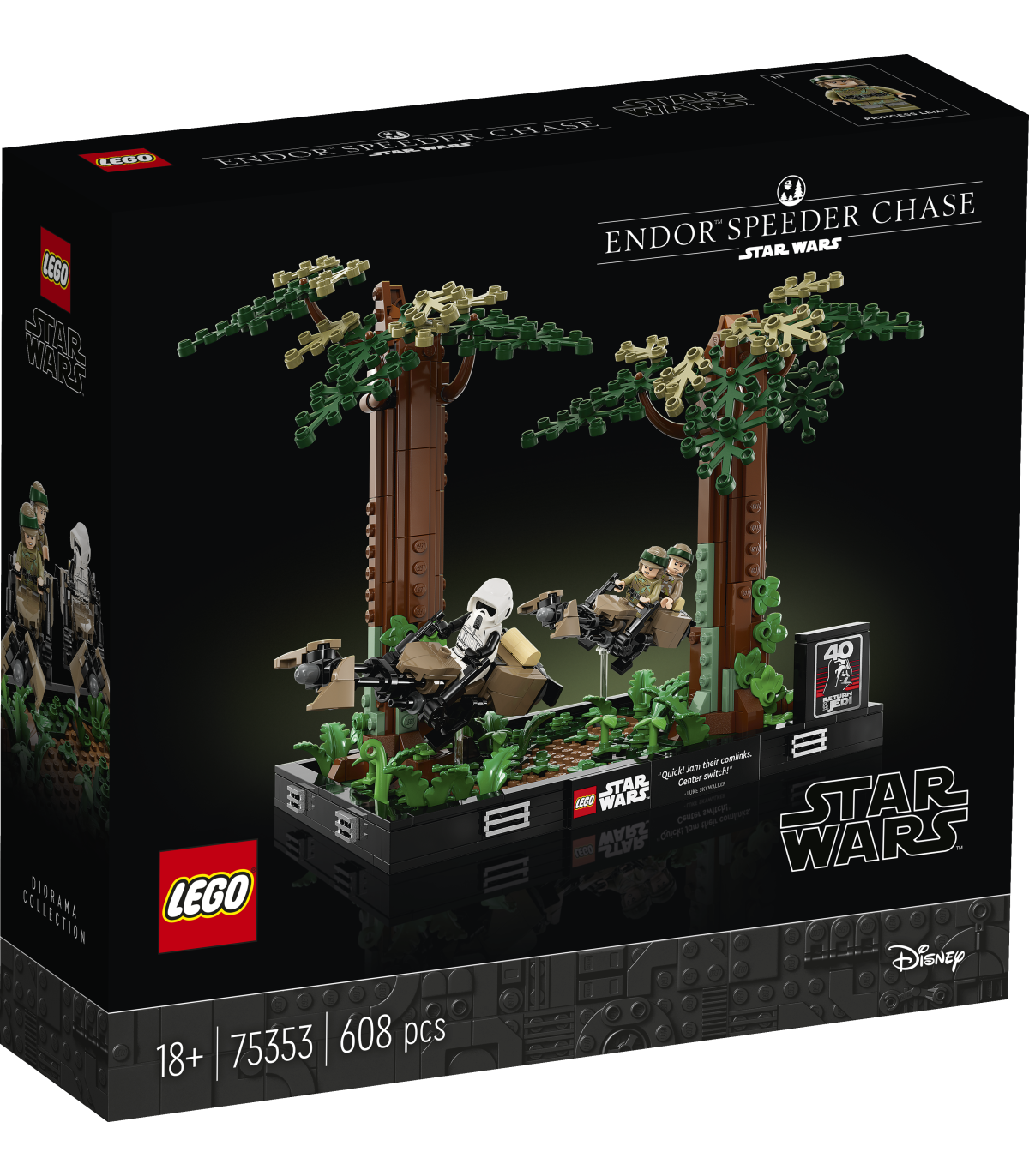 • Detailne Endori kiirendaja tagaajamise dioraam (75353) – loo dünaamiline LEGO® klotsidest kokkupandav jäädvustus kuulsast kiirendaja tagajamisest mööda Endori metsi filmist „Star Wars: Return of the Jedi“
